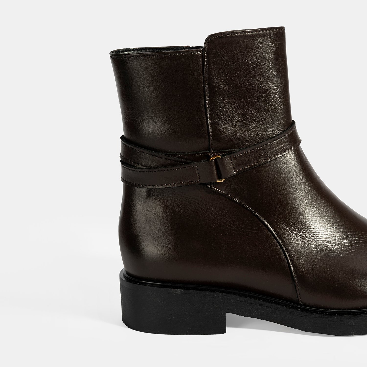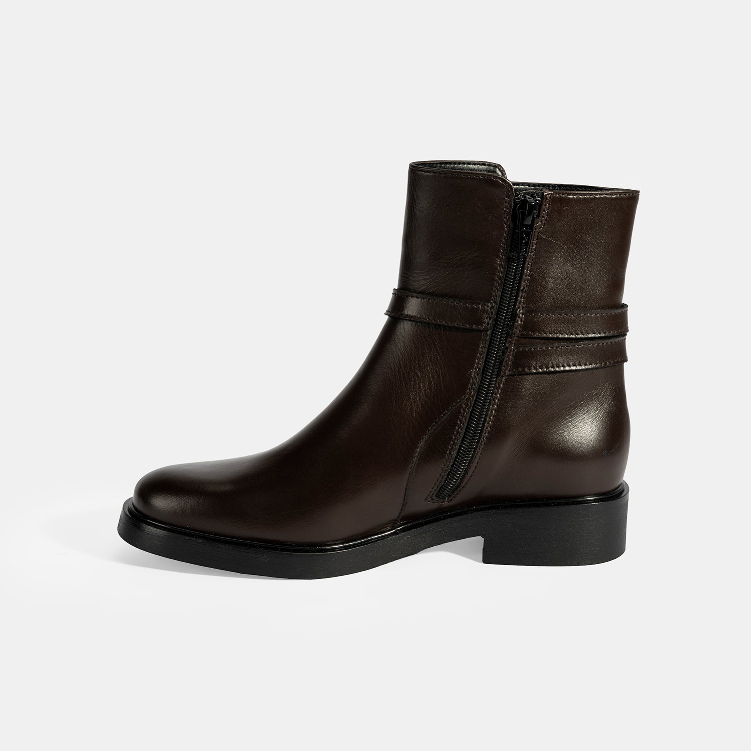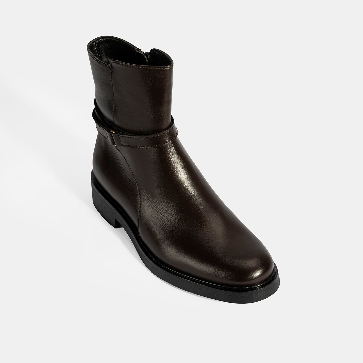 %100 deri, deri iç tabanlı, sıcak tekstil astarlı, metal aksesuar detaylı, termo tabanlı, içten fermuarlı kadın bot. Topuk yüksekliği: 3 cm.