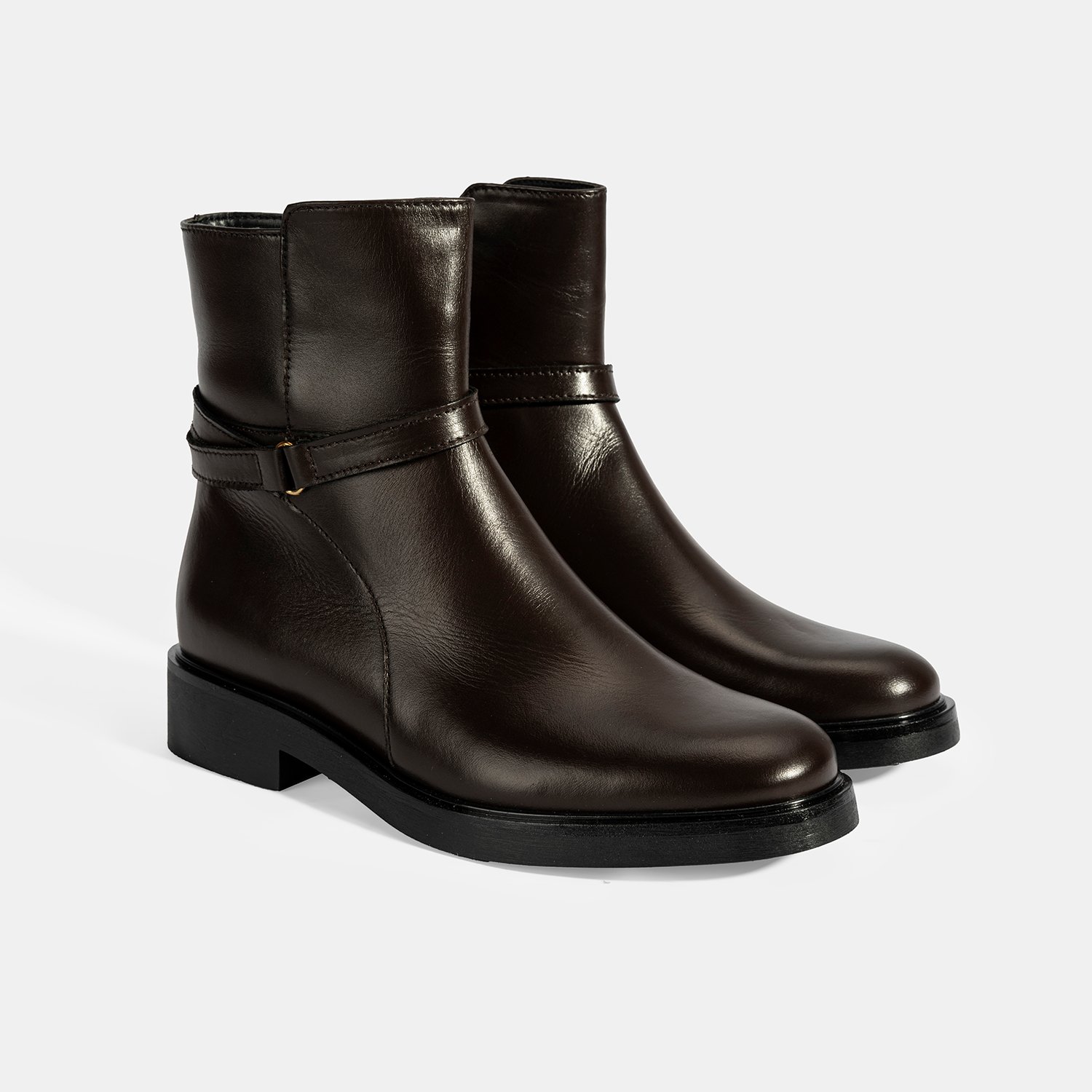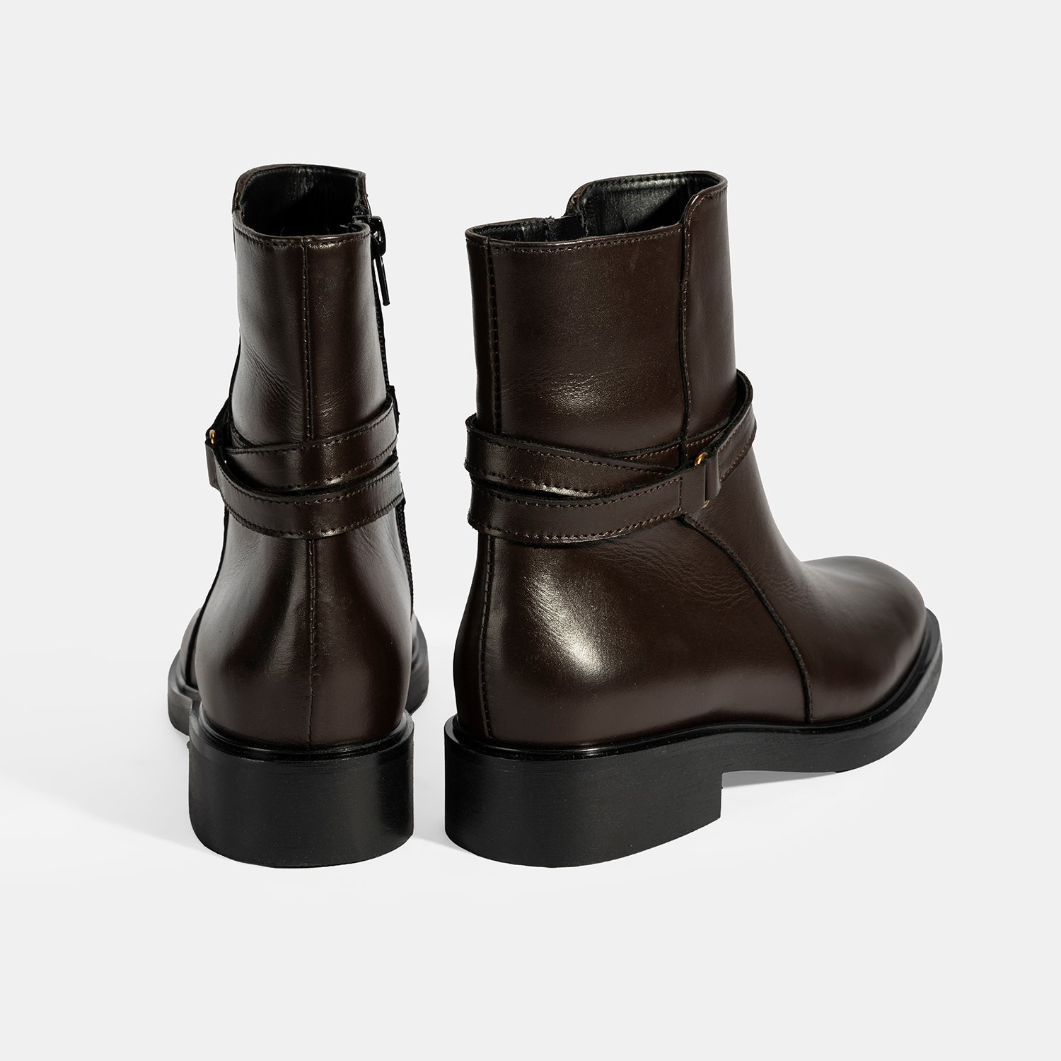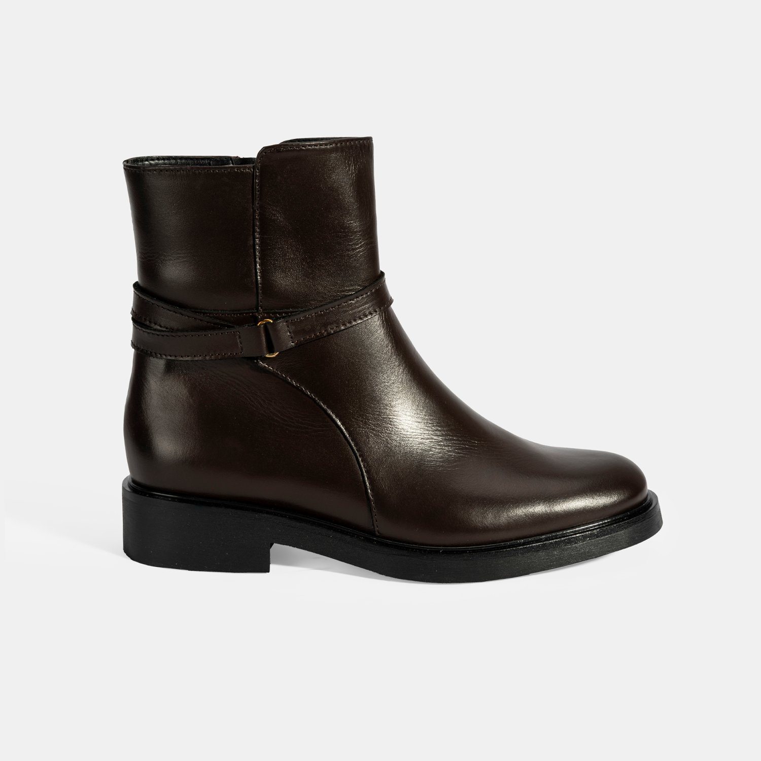 %100 deri, deri iç tabanlı, sıcak tekstil astarlı, metal aksesuar detaylı, termo tabanlı, içten fermuarlı kadın bot. Topuk yüksekliği: 3 cm.