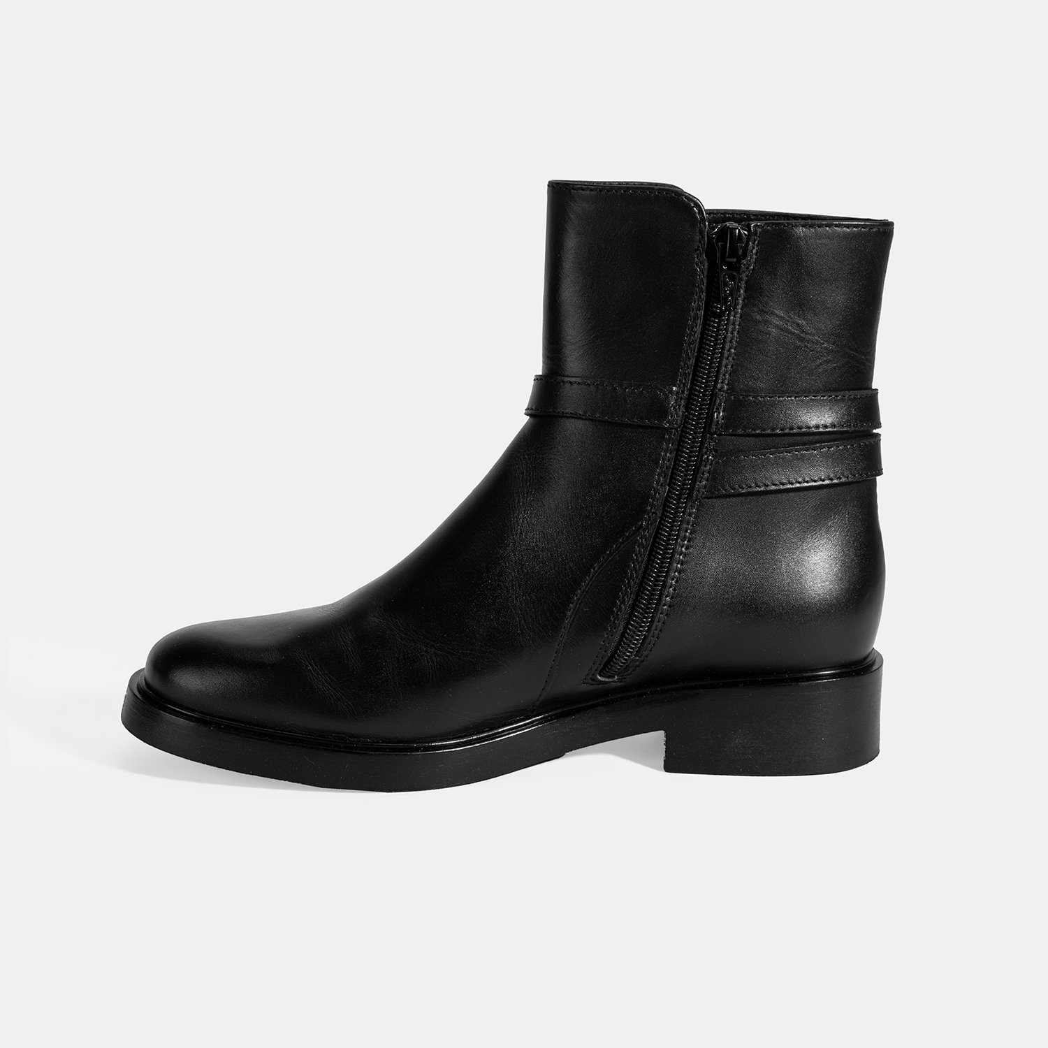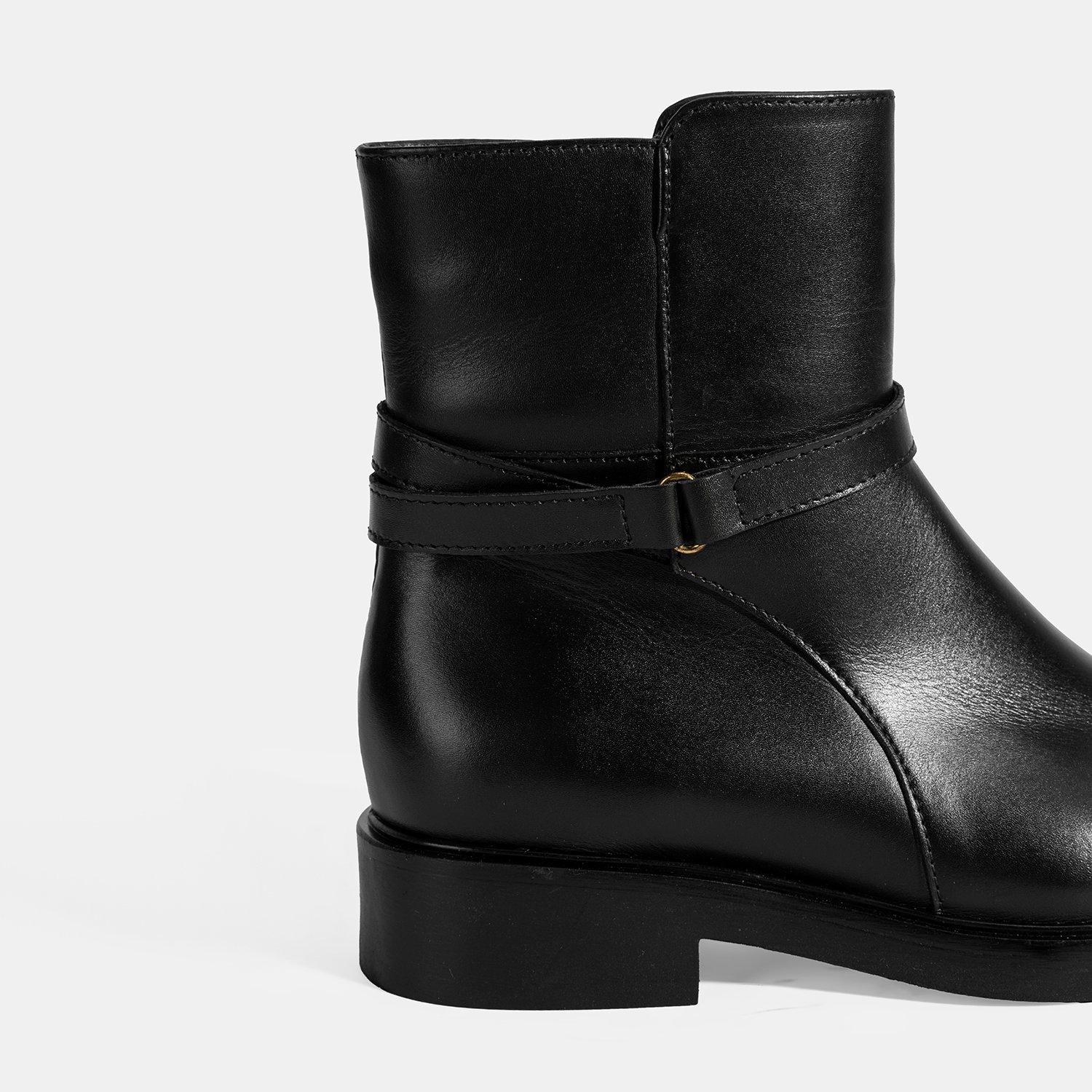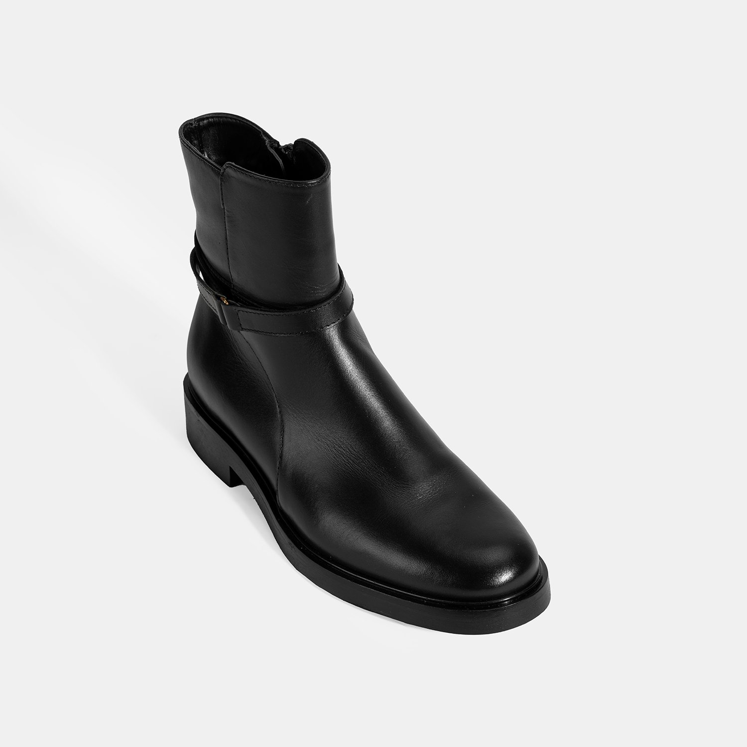 %100 deri, deri iç tabanlı, sıcak tekstil astarlı, metal aksesuar detaylı, termo tabanlı, içten fermuarlı kadın bot. Topuk yüksekliği: 3 cm.