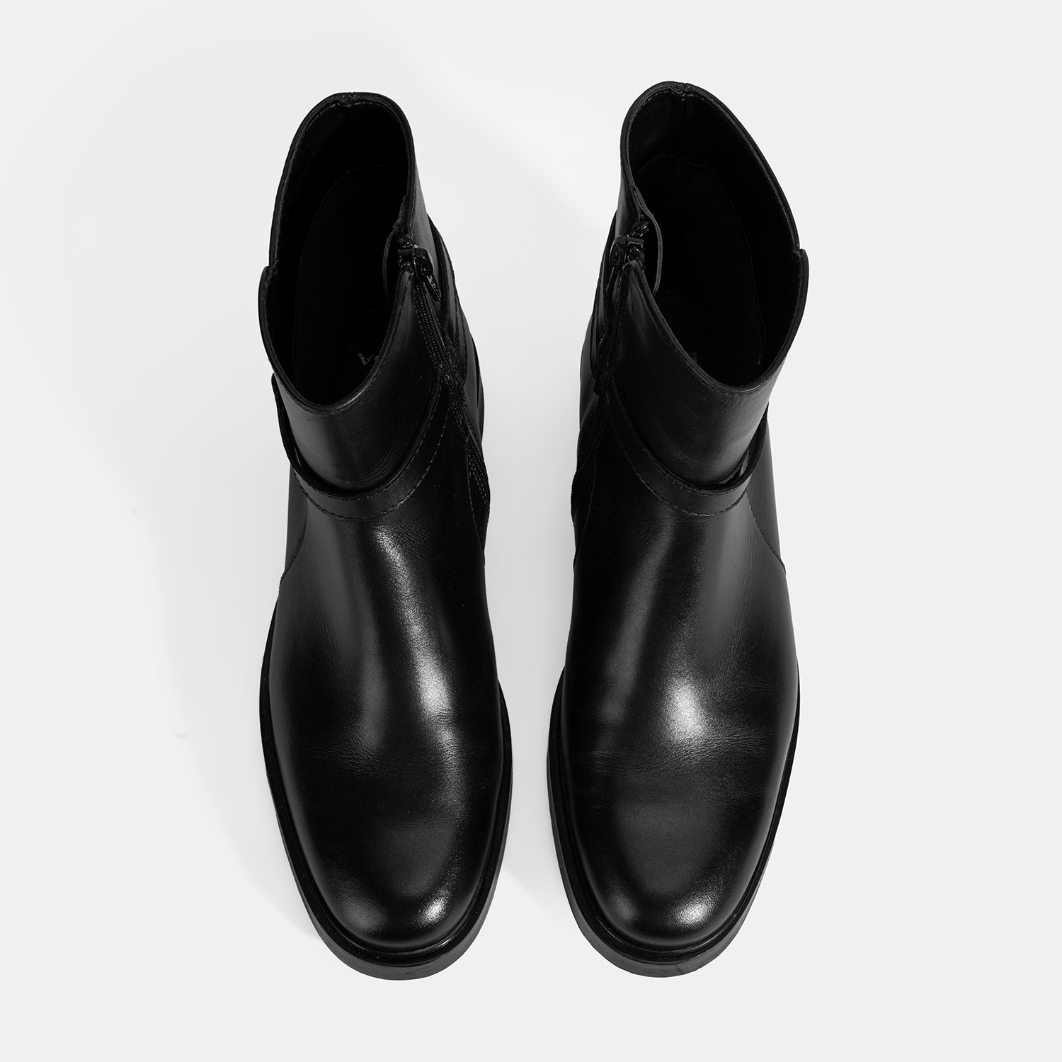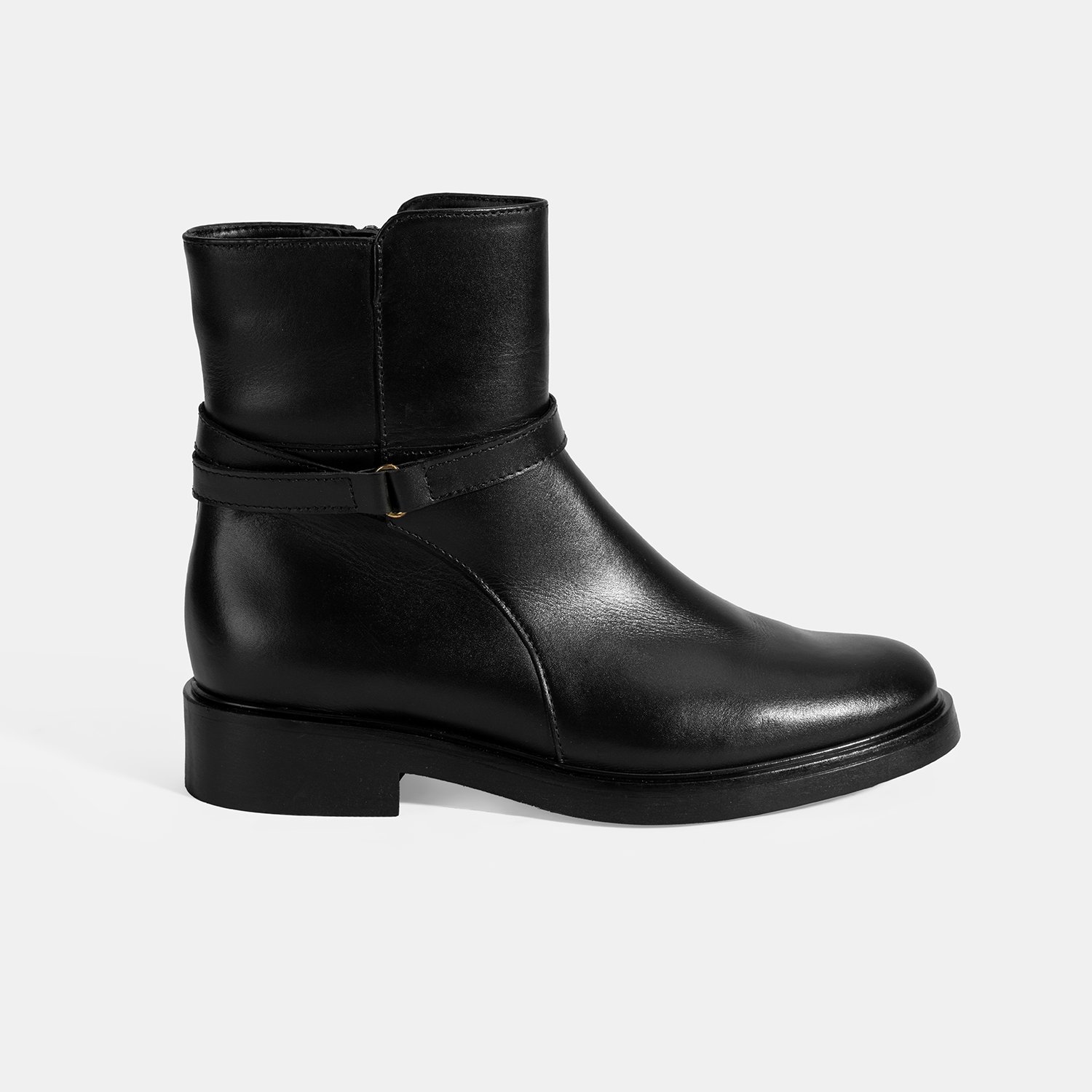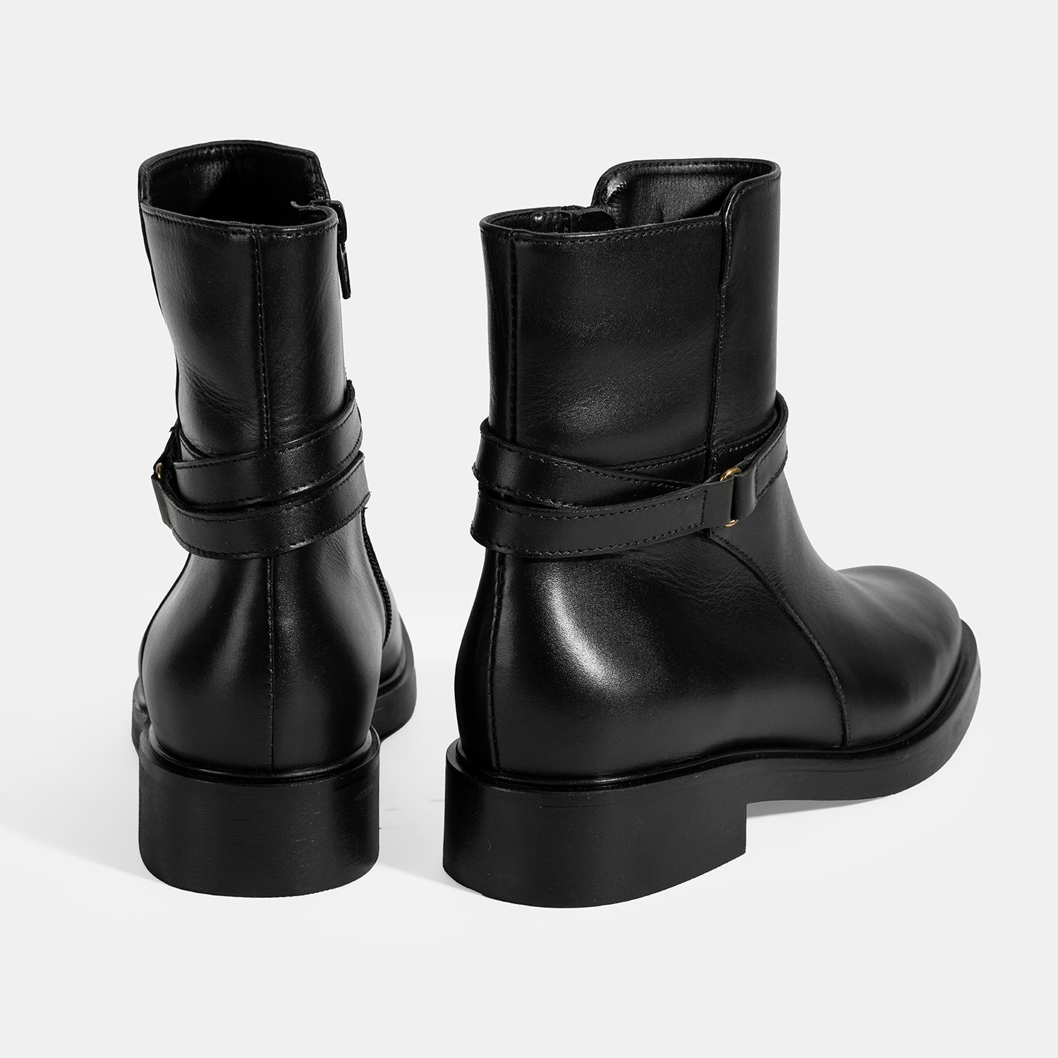 %100 deri, deri iç tabanlı, sıcak tekstil astarlı, metal aksesuar detaylı, termo tabanlı, içten fermuarlı kadın bot. Topuk yüksekliği: 3 cm.