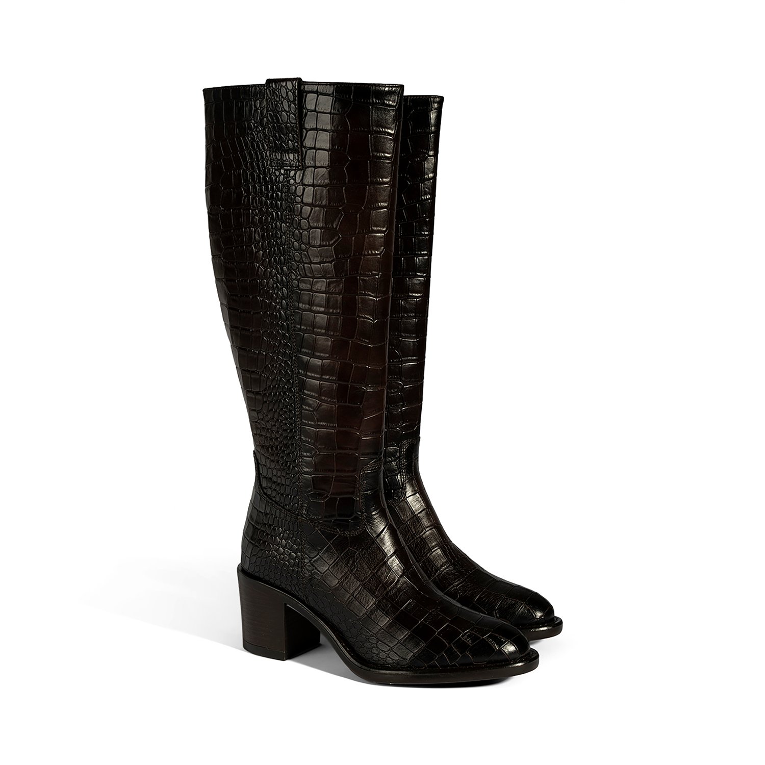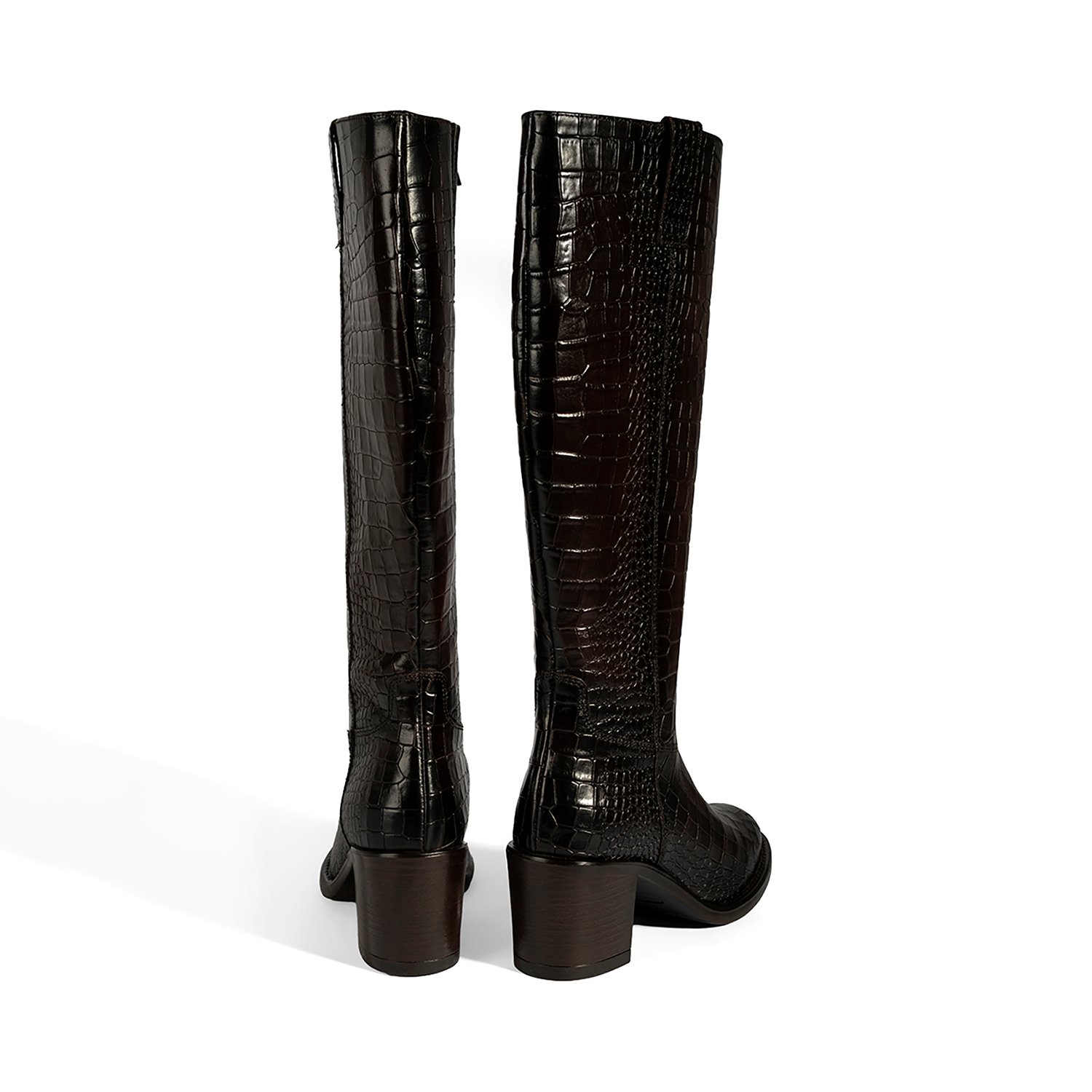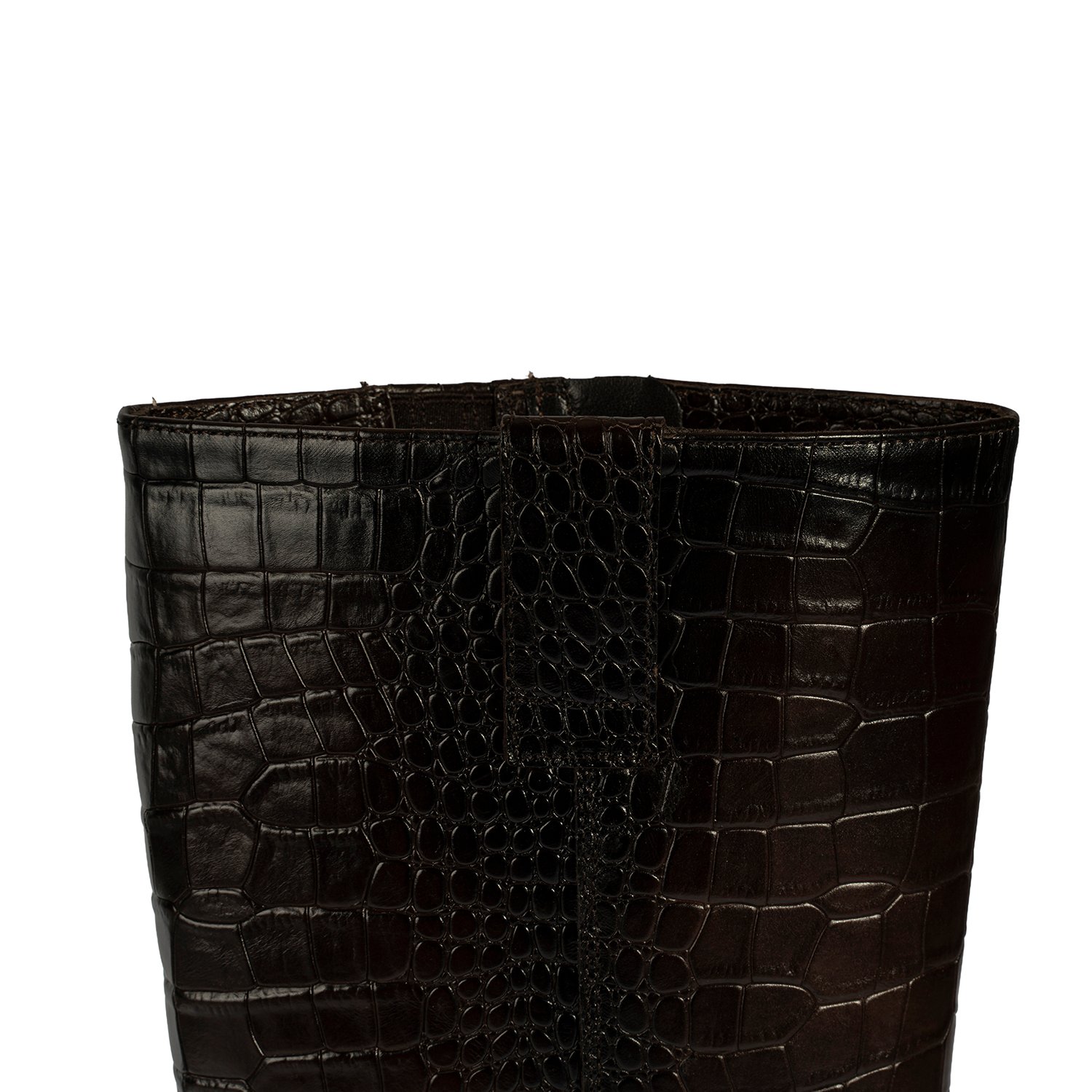 Kadın Kahve Kroko Baskılı Kalın Topuklu Deri Çizme