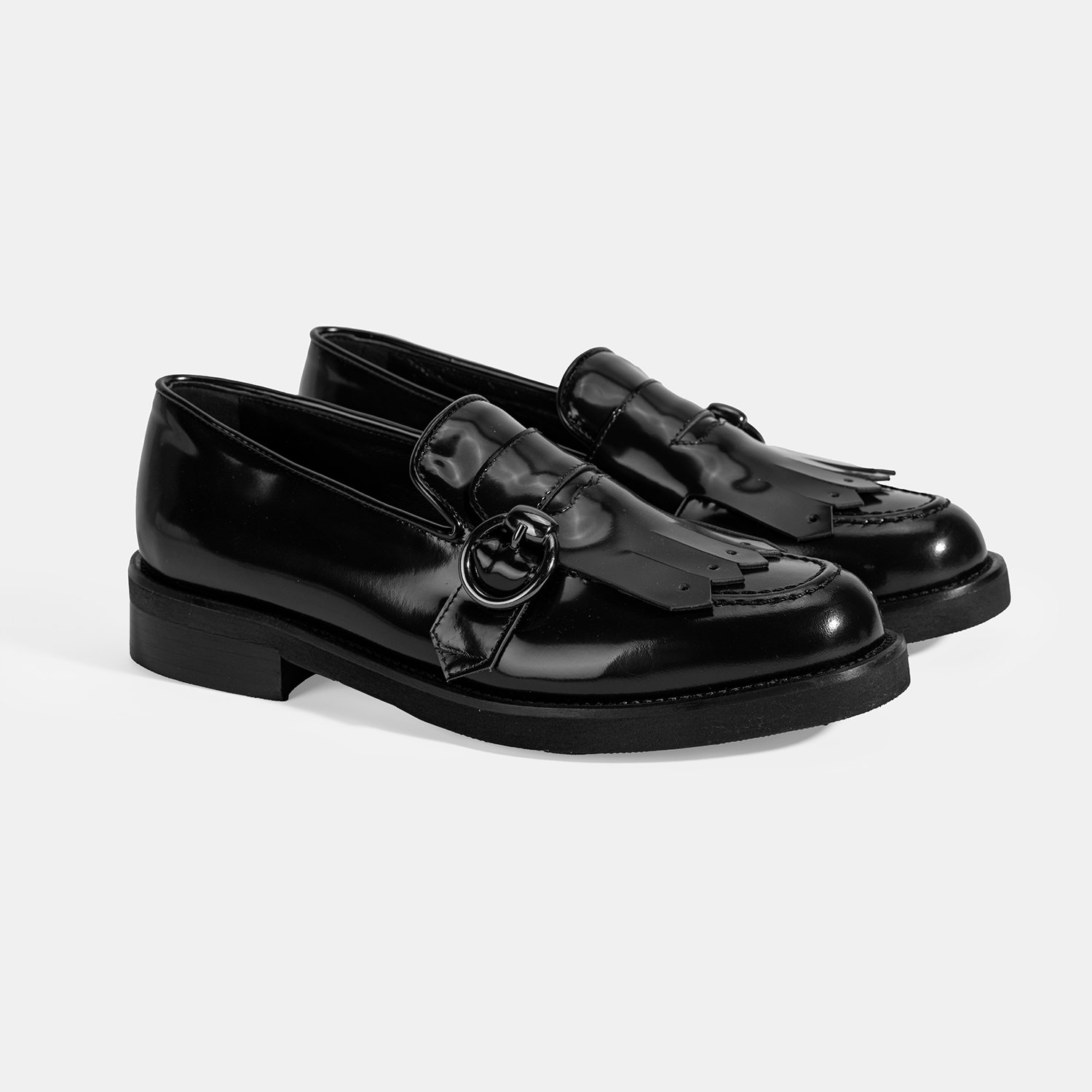 %100 deri, deri iç tabanlı, deri astarlı, metal toka detaylı, eva tabanlı, kadın püsküllü loafer. Topuk yüksekliği 3 cm