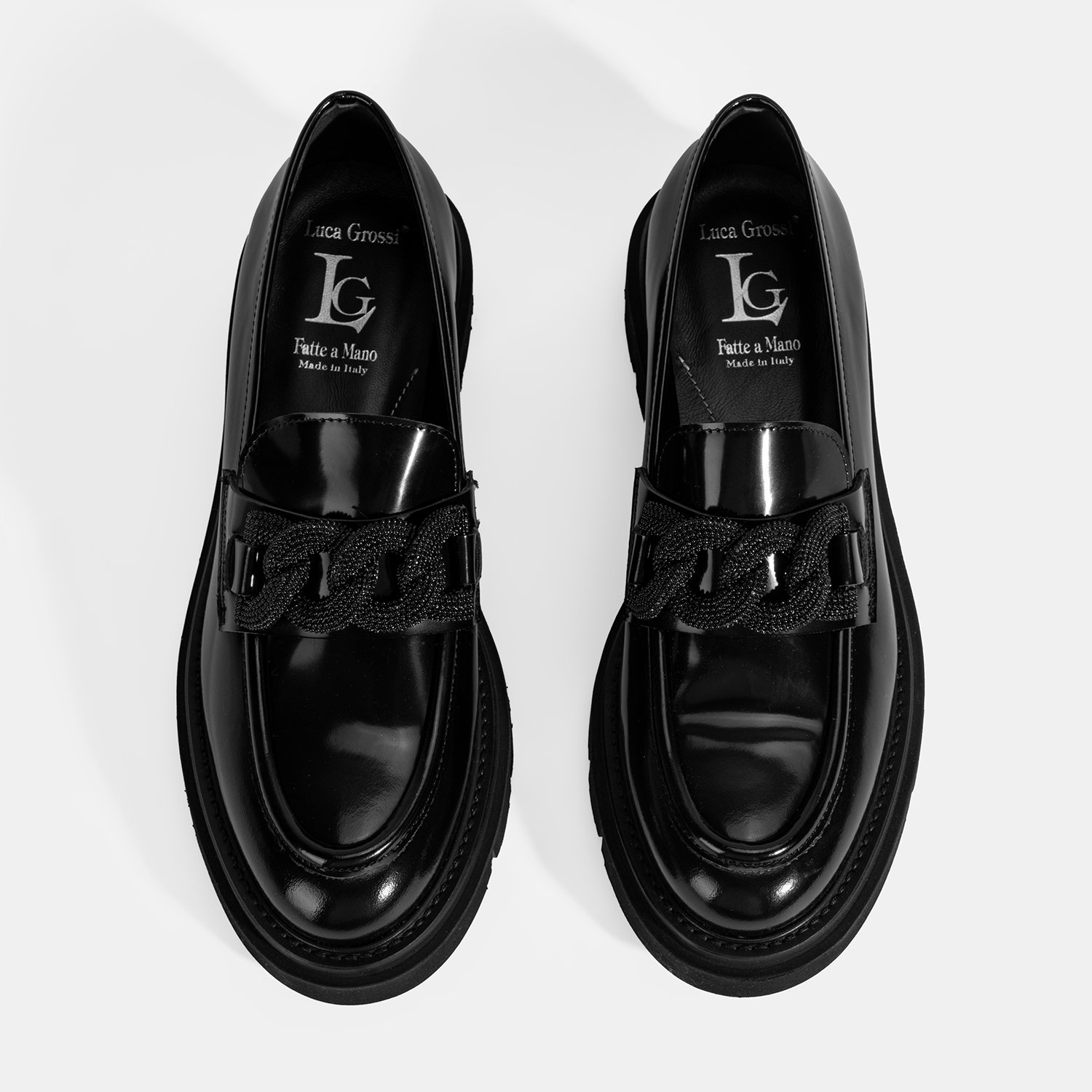 %100 deri, deri iç tabanlı, deri astarlı, metal zincir aksesuar detaylı, eva tabanlı, kadın loafer. Topuk yüksekliği 4 cm