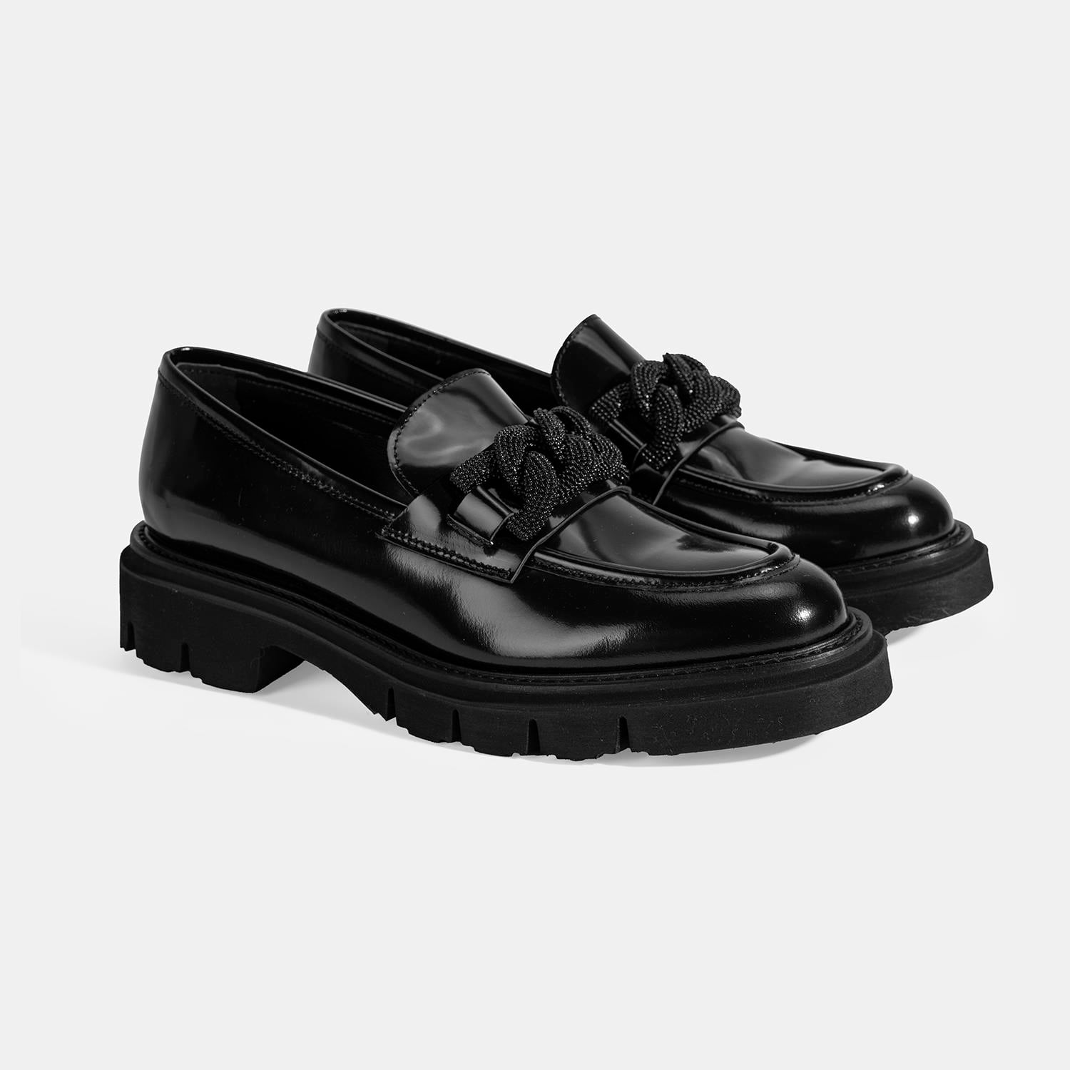 %100 deri, deri iç tabanlı, deri astarlı, metal zincir aksesuar detaylı, eva tabanlı, kadın loafer. Topuk yüksekliği 4 cm