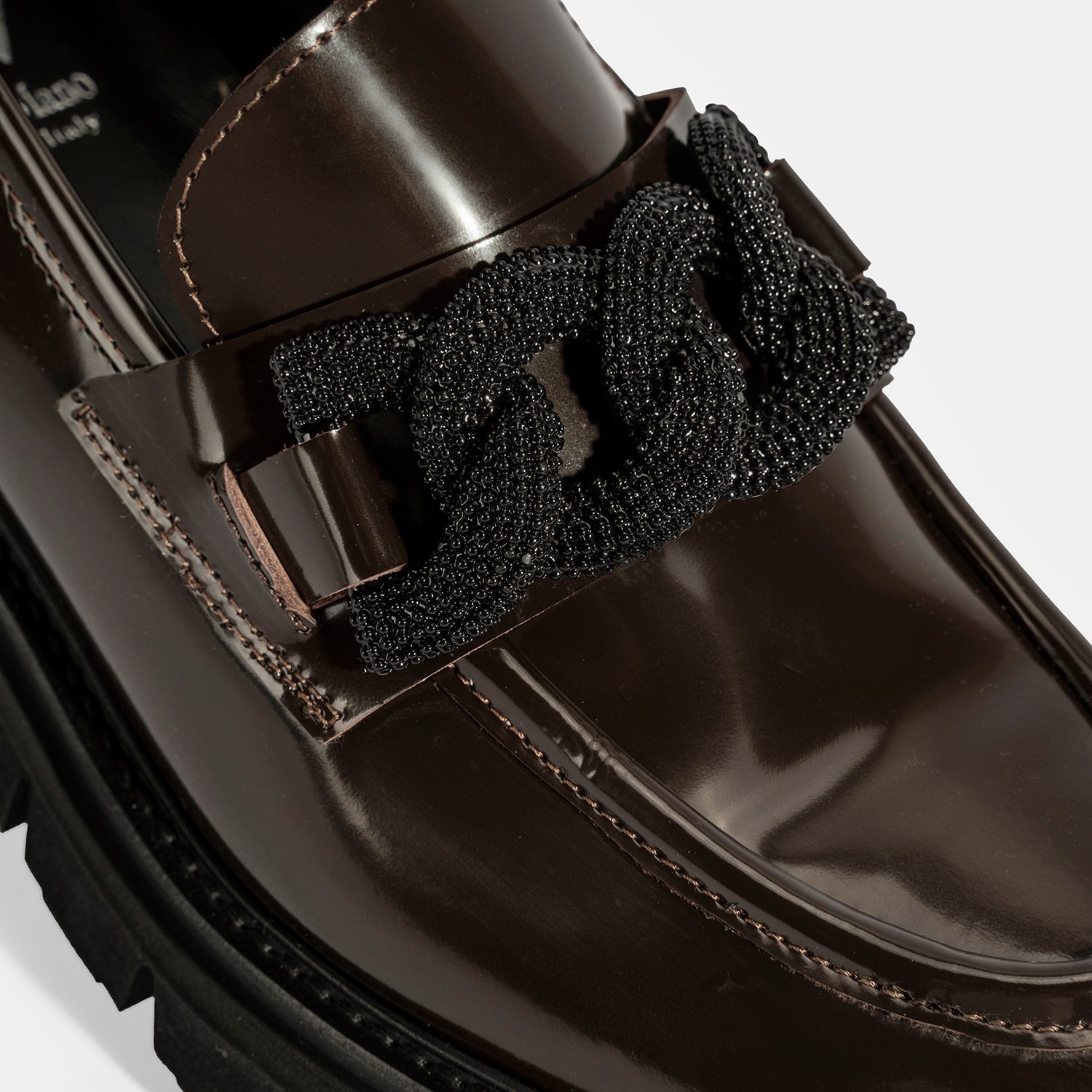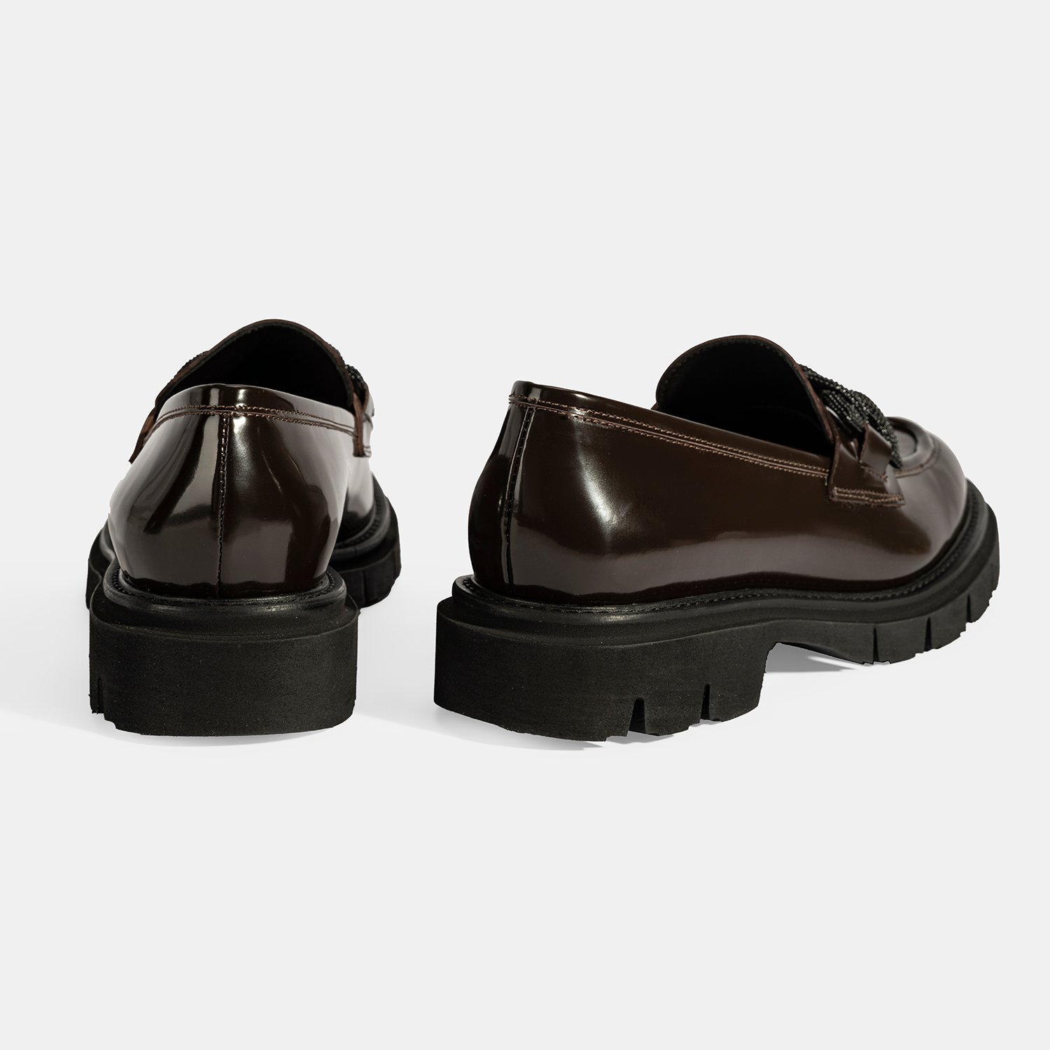 %100 deri, deri iç tabanlı, deri astarlı, metal zincir aksesuar detaylı, eva tabanlı, kadın loafer. Topuk yüksekliği 4 cm