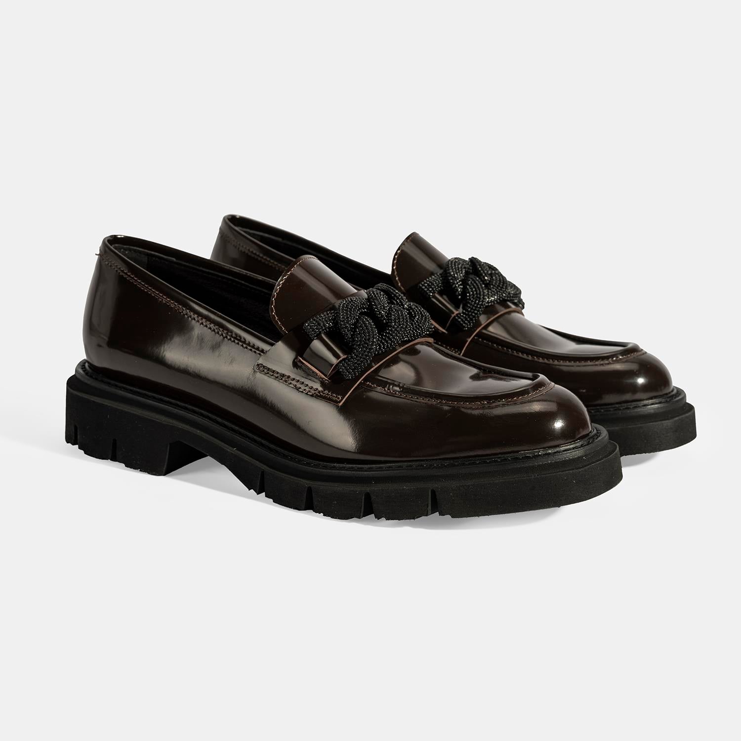 %100 deri, deri iç tabanlı, deri astarlı, metal zincir aksesuar detaylı, eva tabanlı, kadın loafer. Topuk yüksekliği 4 cm