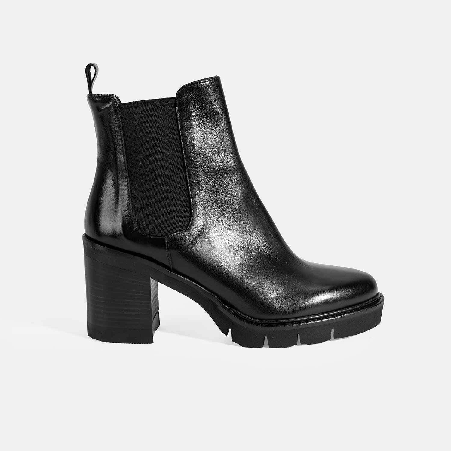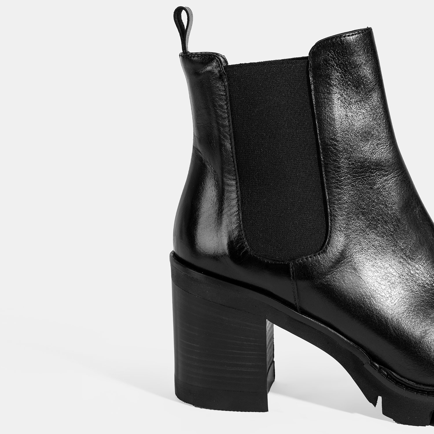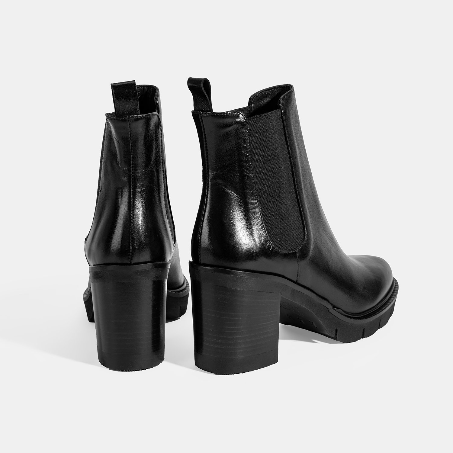 %100 deri, deri iç tabanlı, deri astarlı, lastik detaylı, EVA tabanlı, kalın topuklu kadın Chelsea bot. Topuk yüksekliği: 8 cm.