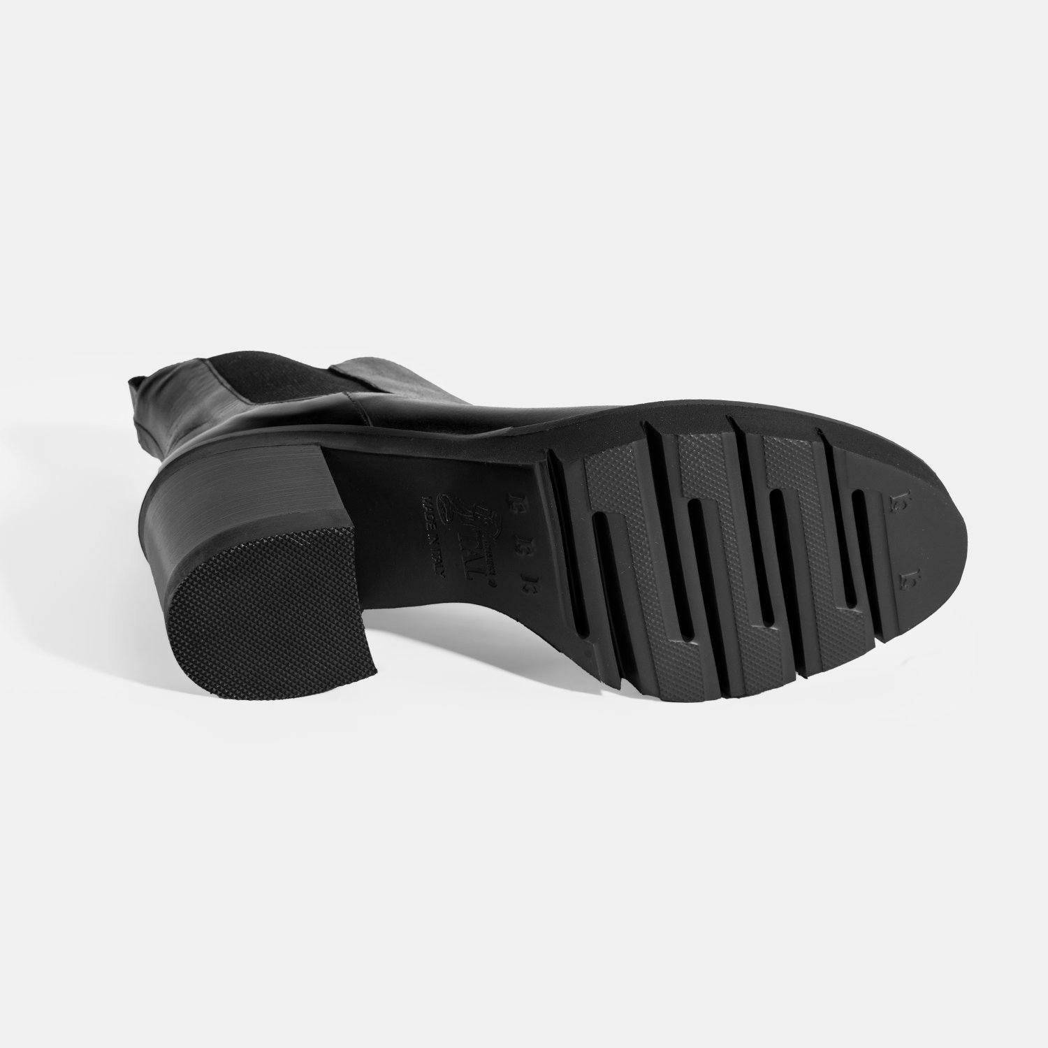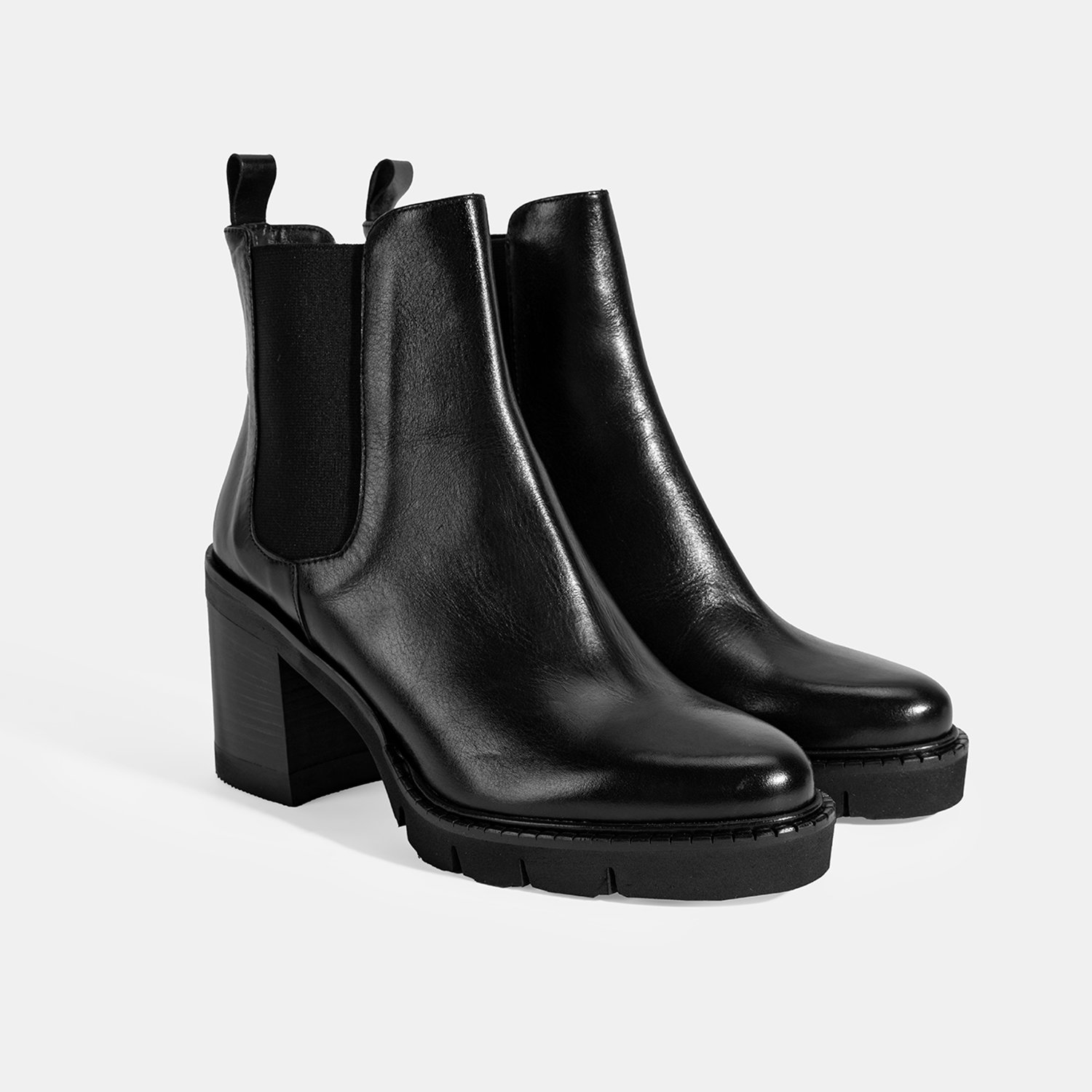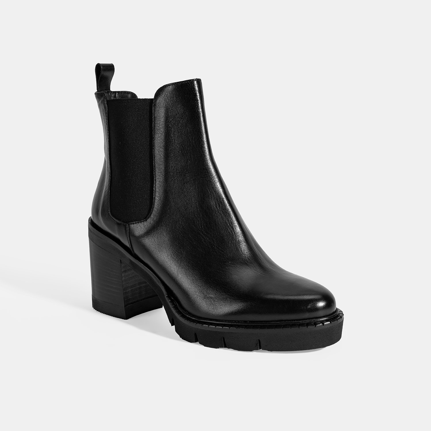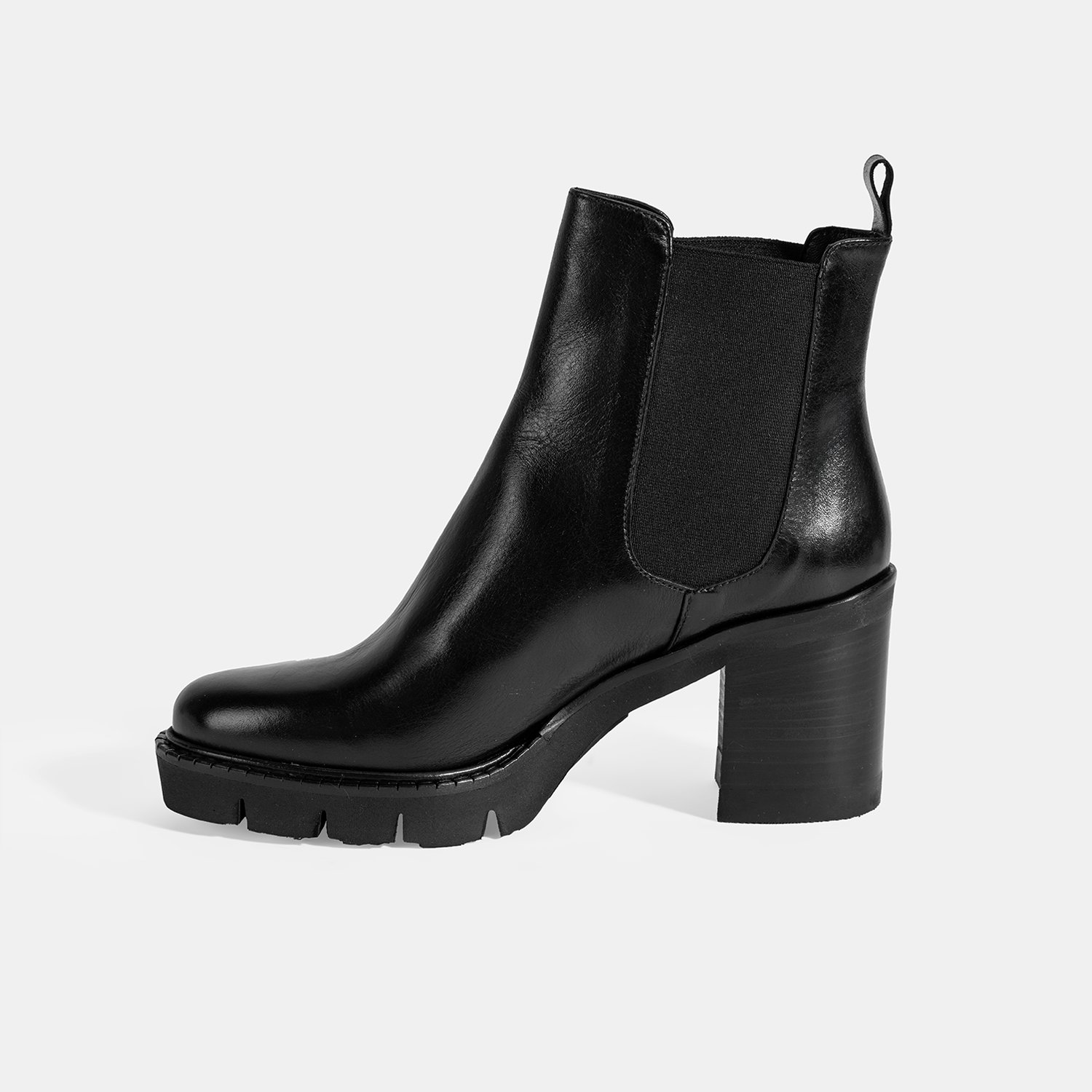 %100 deri, deri iç tabanlı, deri astarlı, lastik detaylı, EVA tabanlı, kalın topuklu kadın Chelsea bot. Topuk yüksekliği: 8 cm.