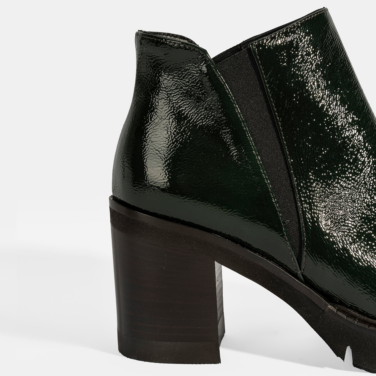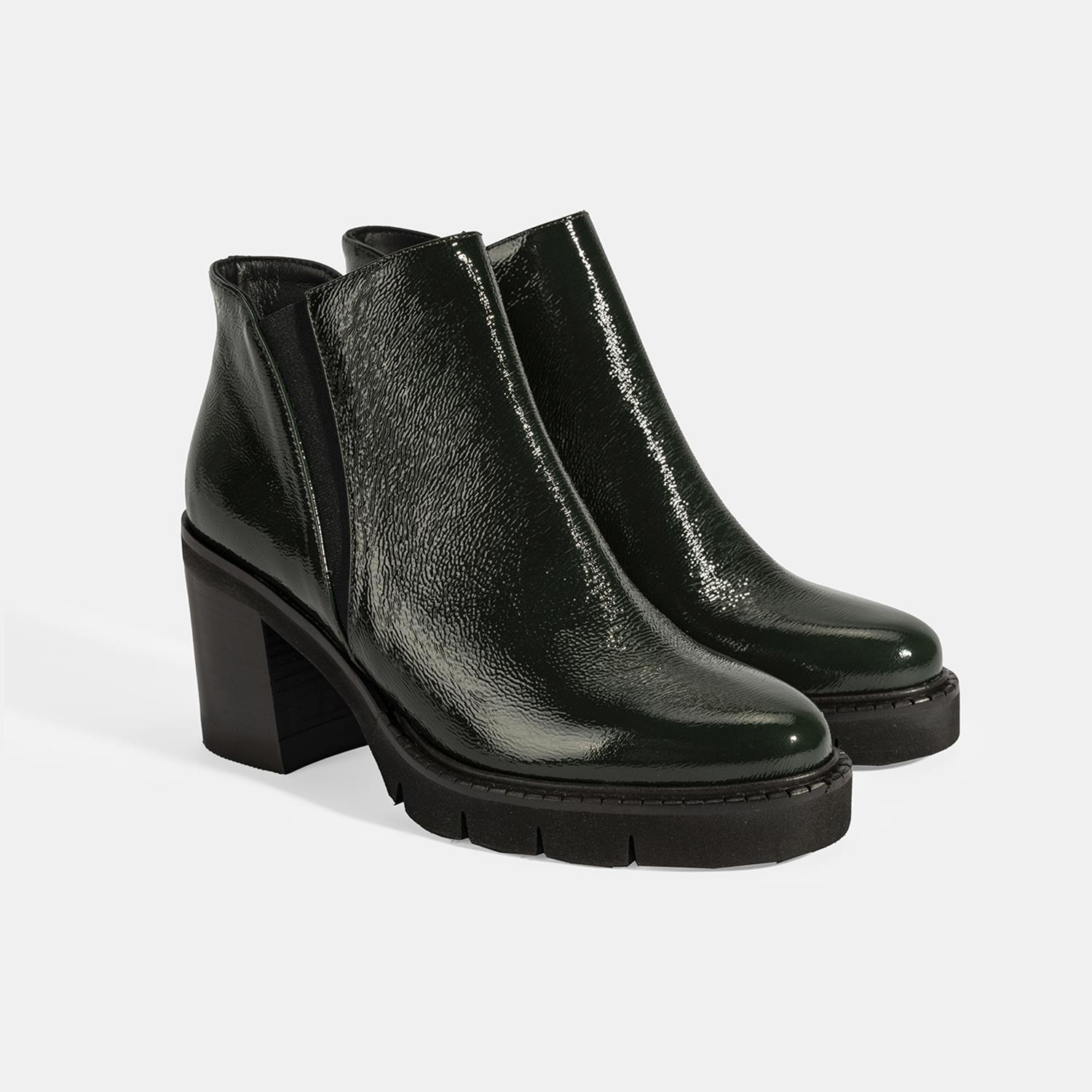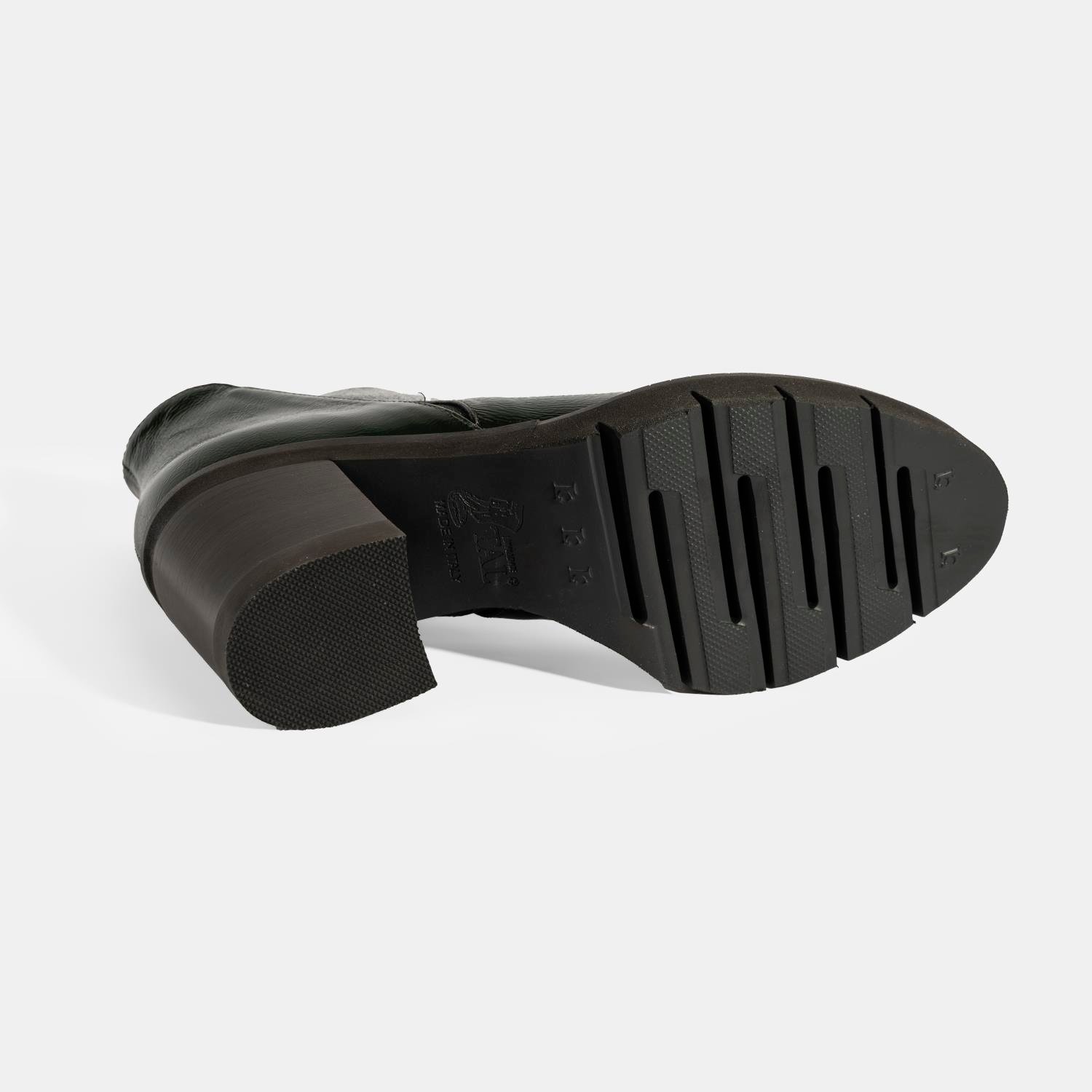 %100 rugan deri, deri iç tabanlı, deri astarlı, lastik detaylı, EVA tabanlı, kalın topuklu bot. Topuk yüksekliği: 8 cm.