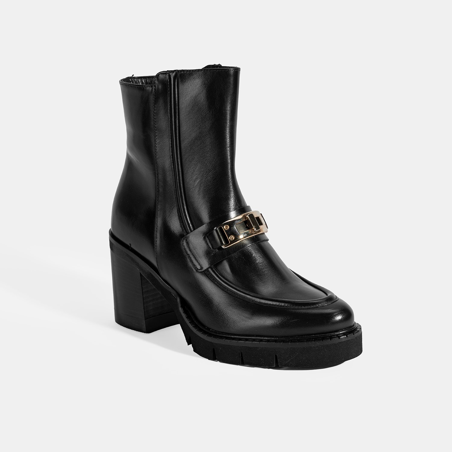 %100 deri, deri iç tabanlı, deri astarlı, metal kilit aksesuar detaylı, EVA tabanlı, içten fermuarlı, kalın topuklu kadın bot. Topuk yüksekliği: 8 cm.