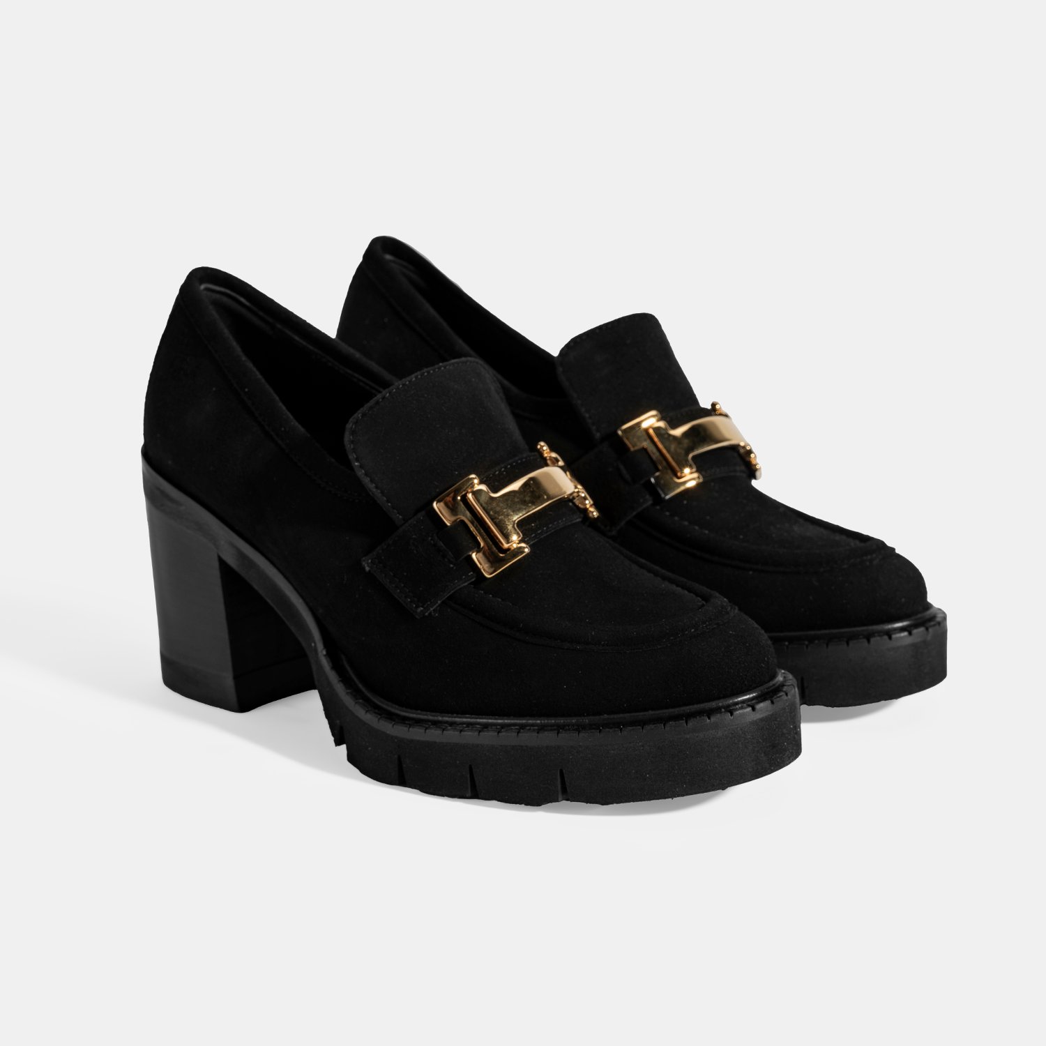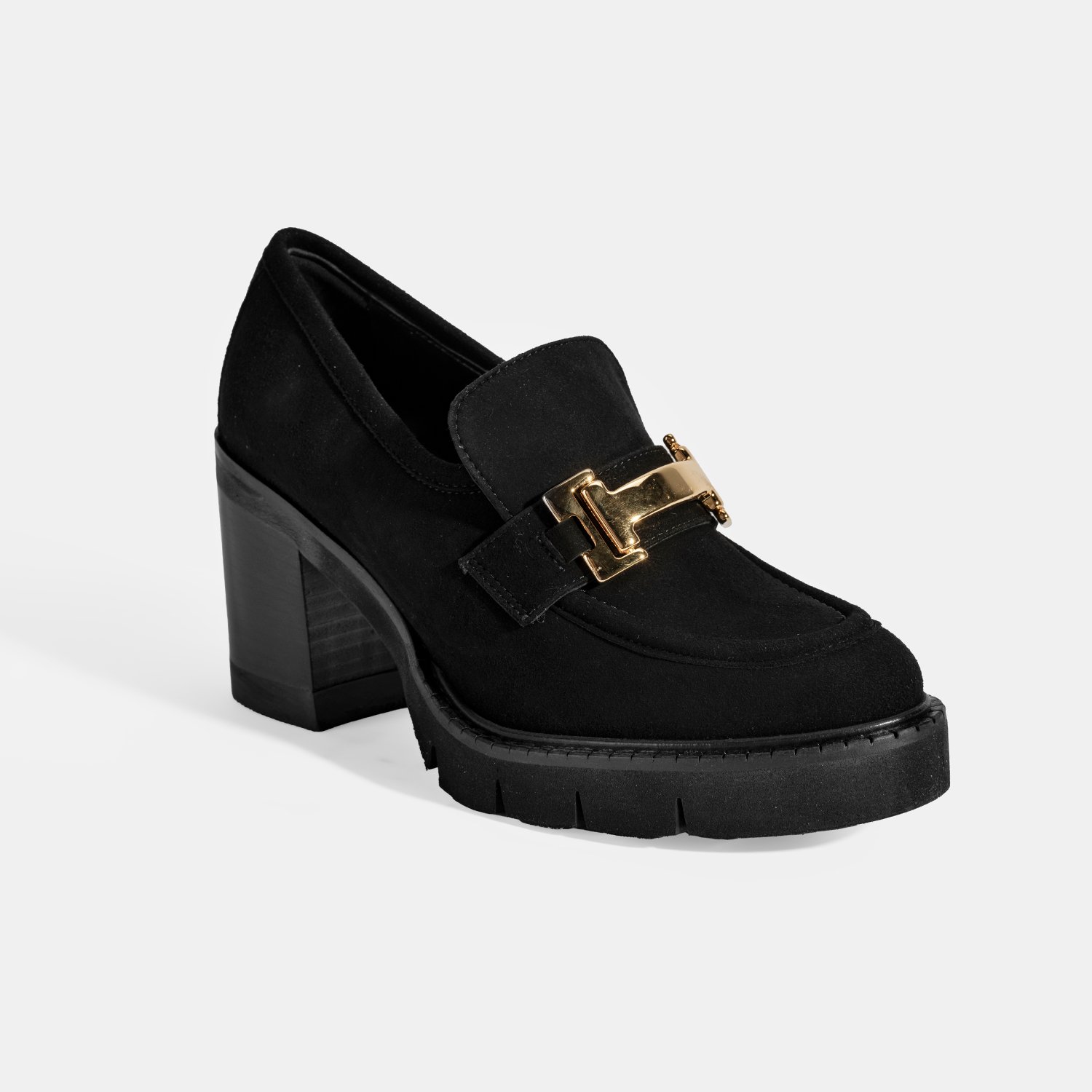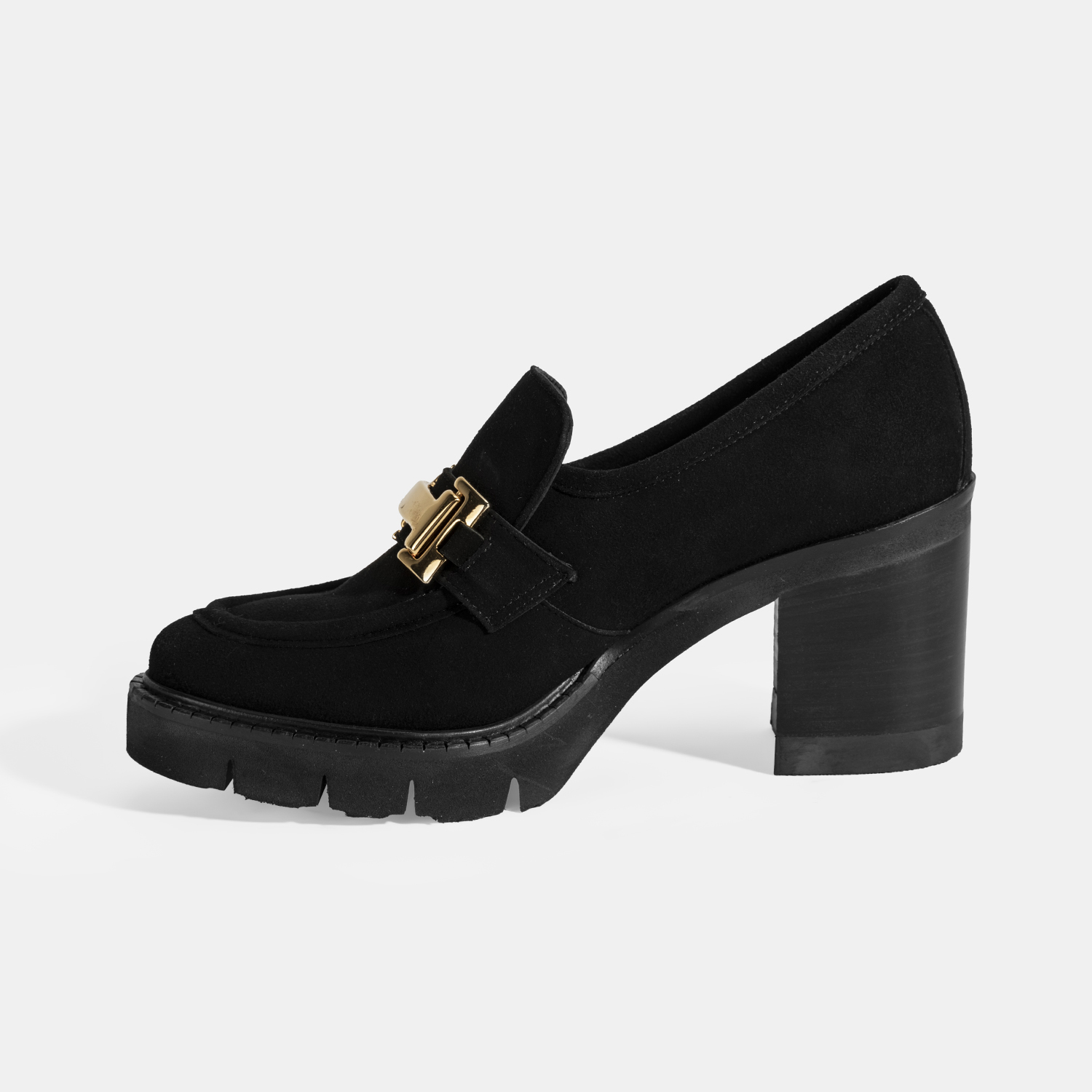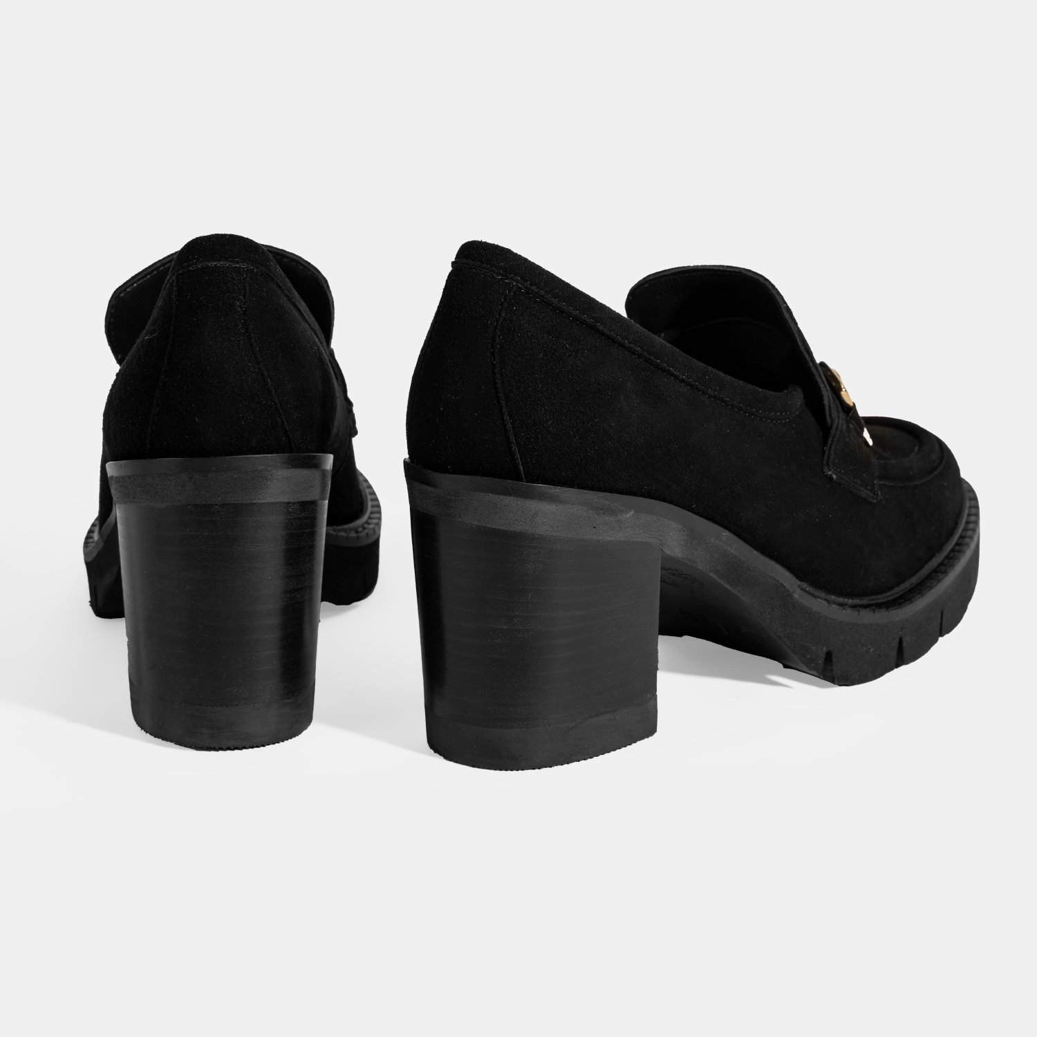%100 süet deri, deri iç tabanlı, deri astarlı, metal toka detaylı, eva tabanlı, kadın kalın topuklu loafer. Topuk yüksekliği 8 cm