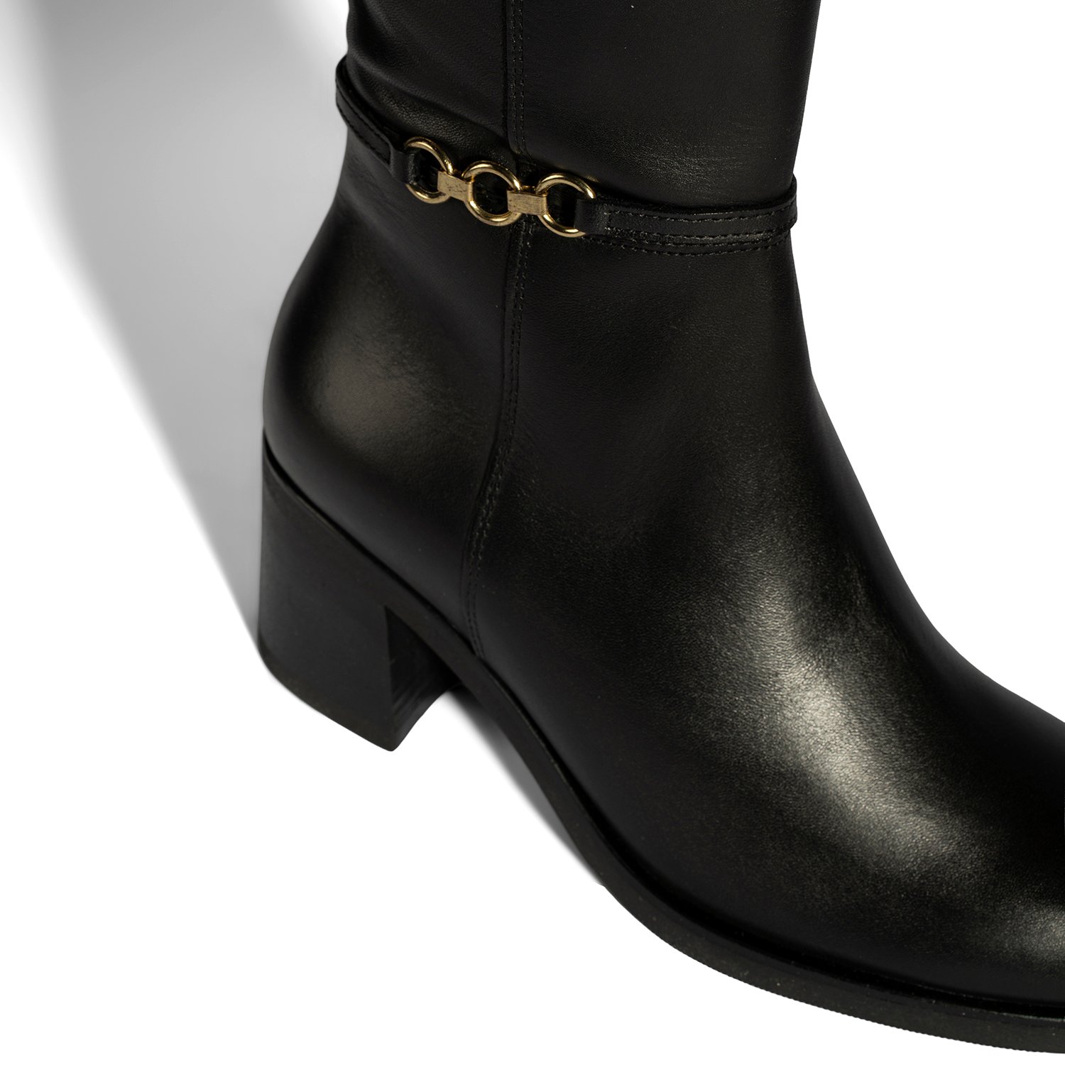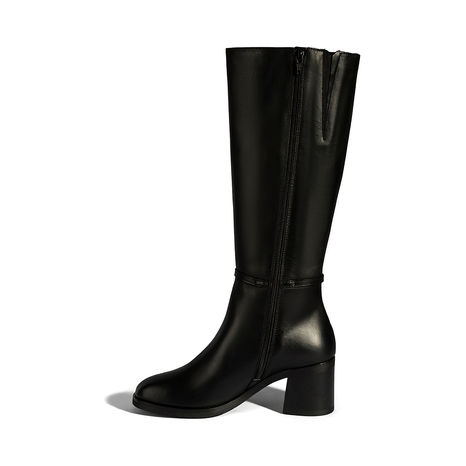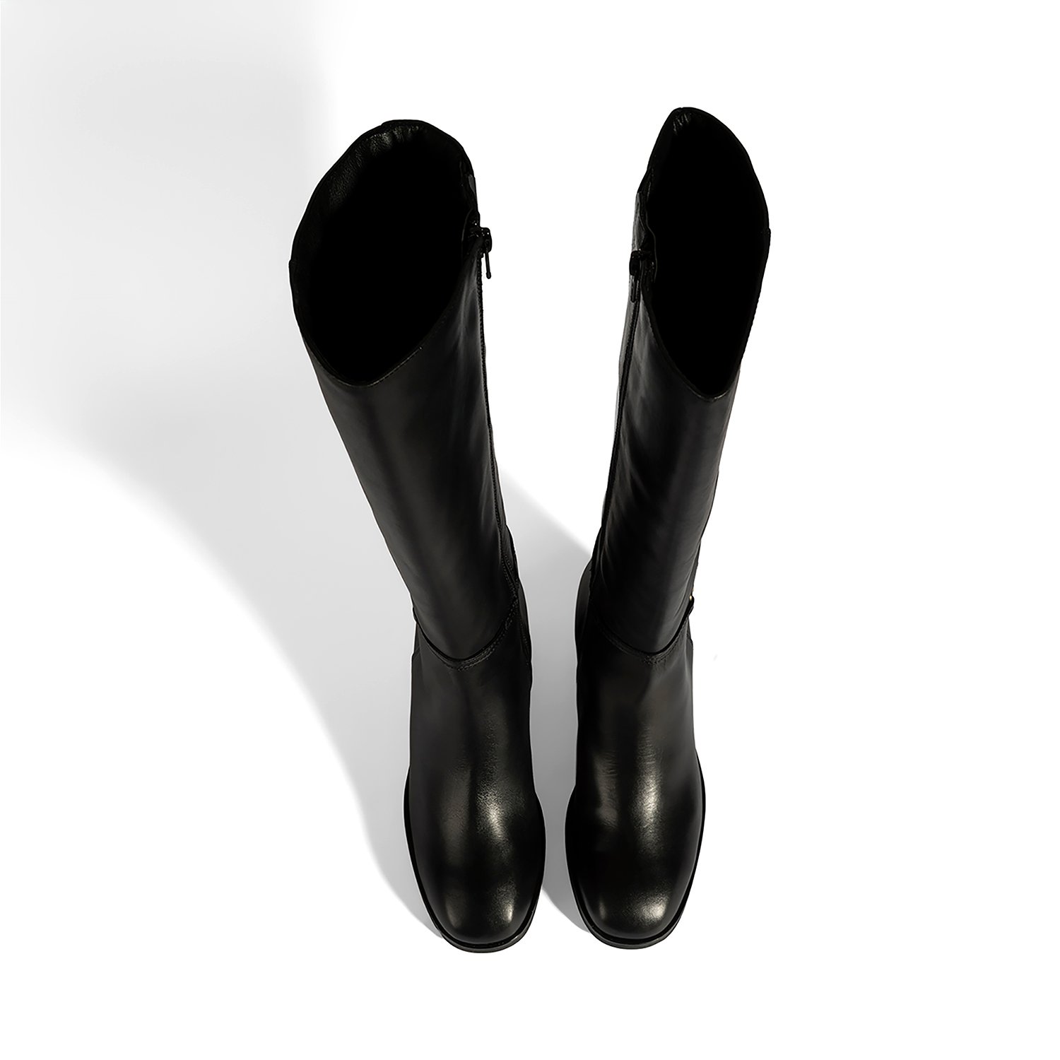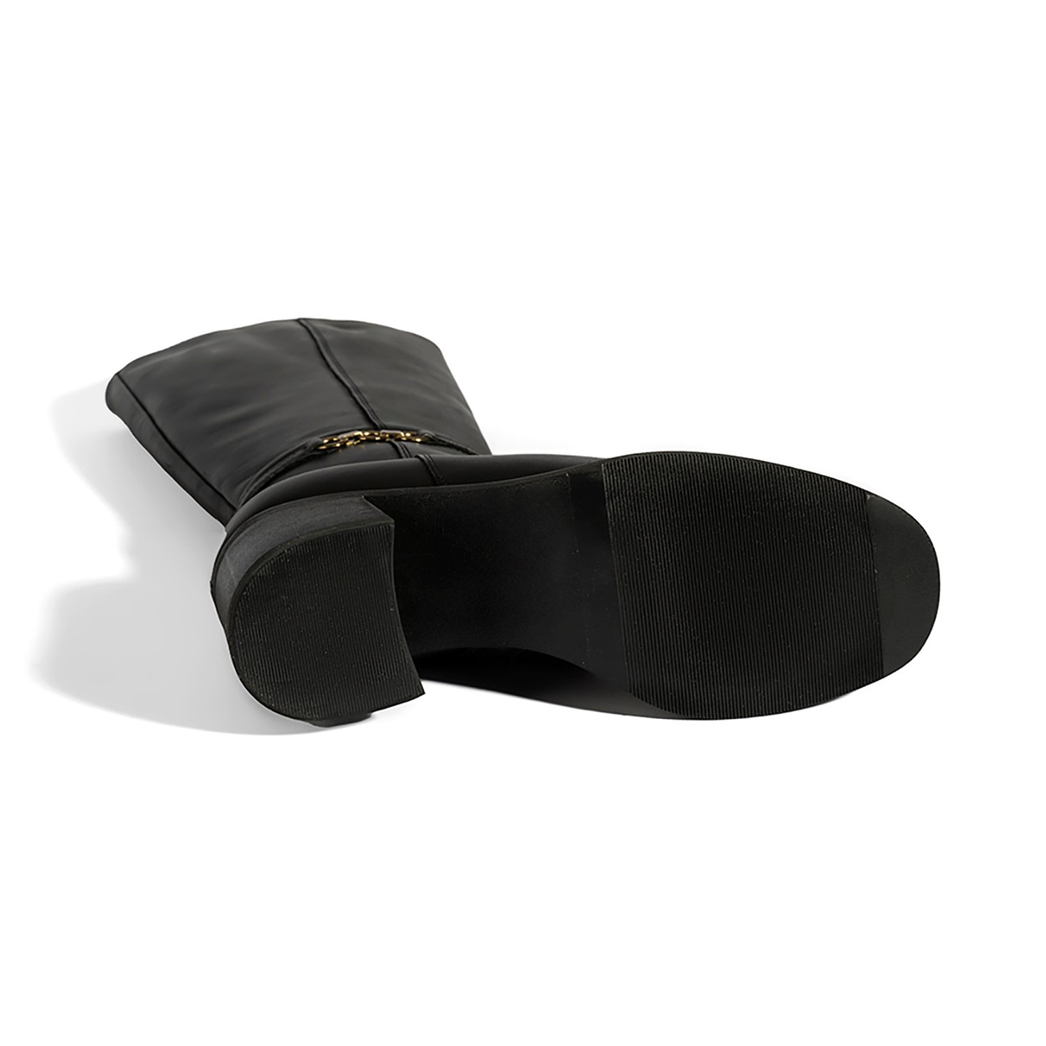 %100 deri, deri iç tabanlı, termo tabanlı, içten fermuarlı, kadın kalın topuklu çizme. Topuk yüksekliği: 6 cm.