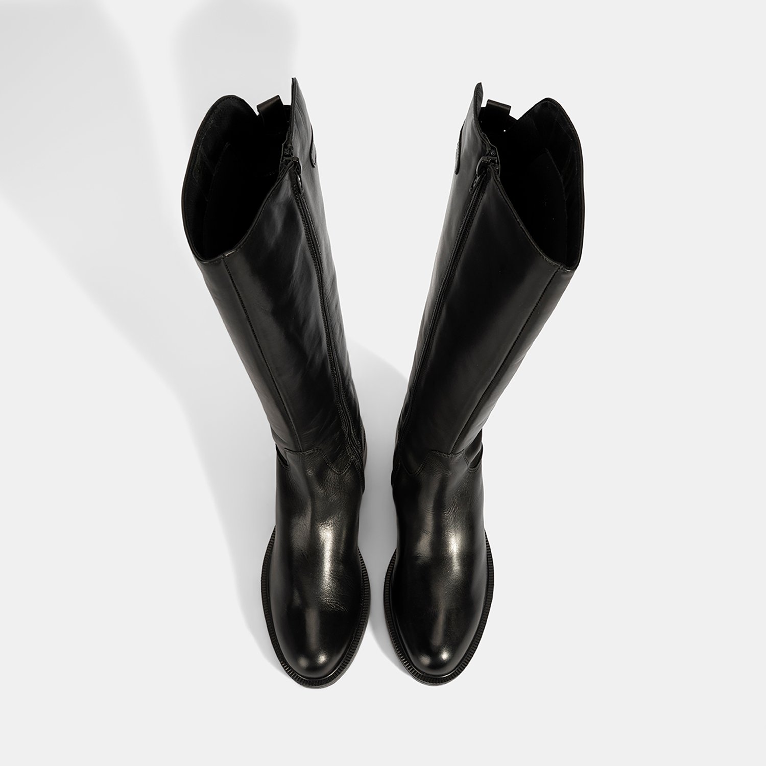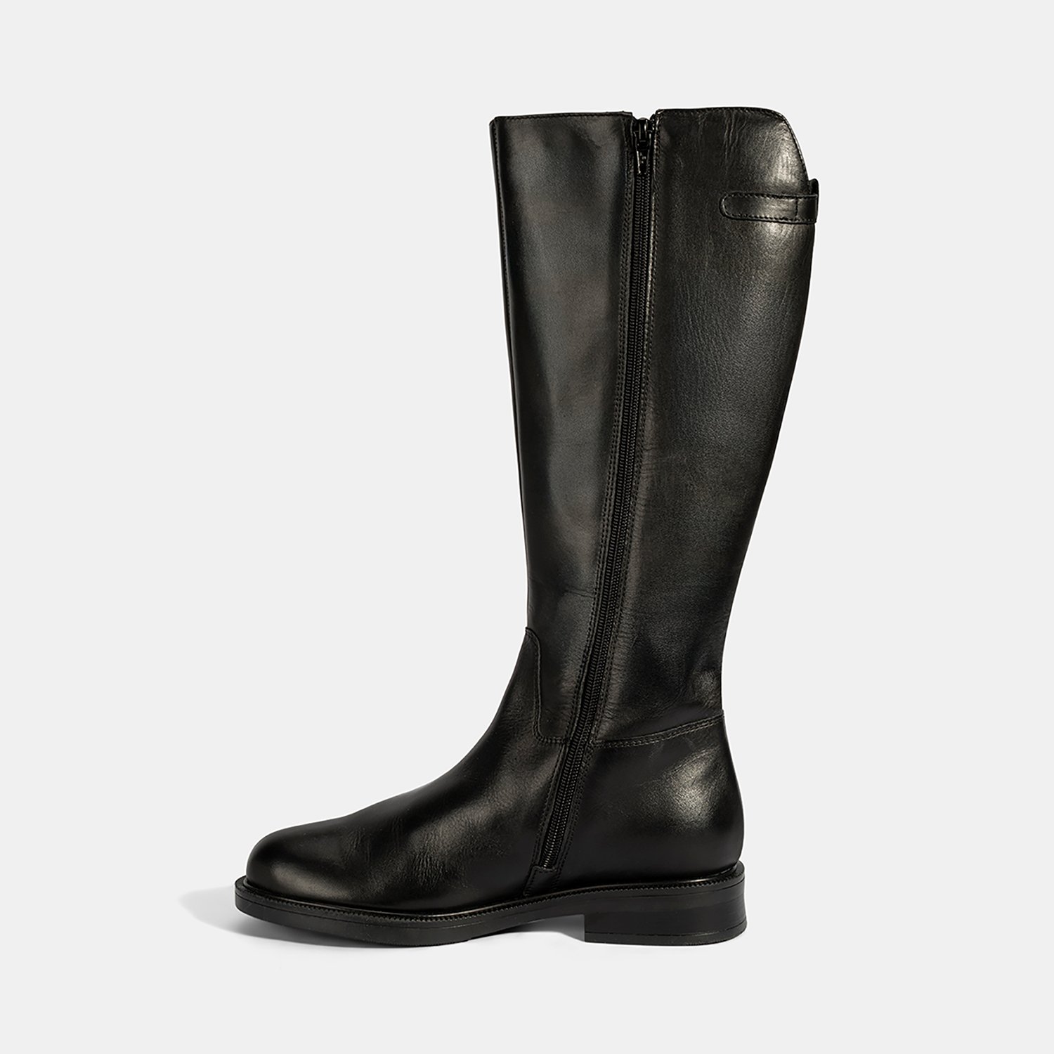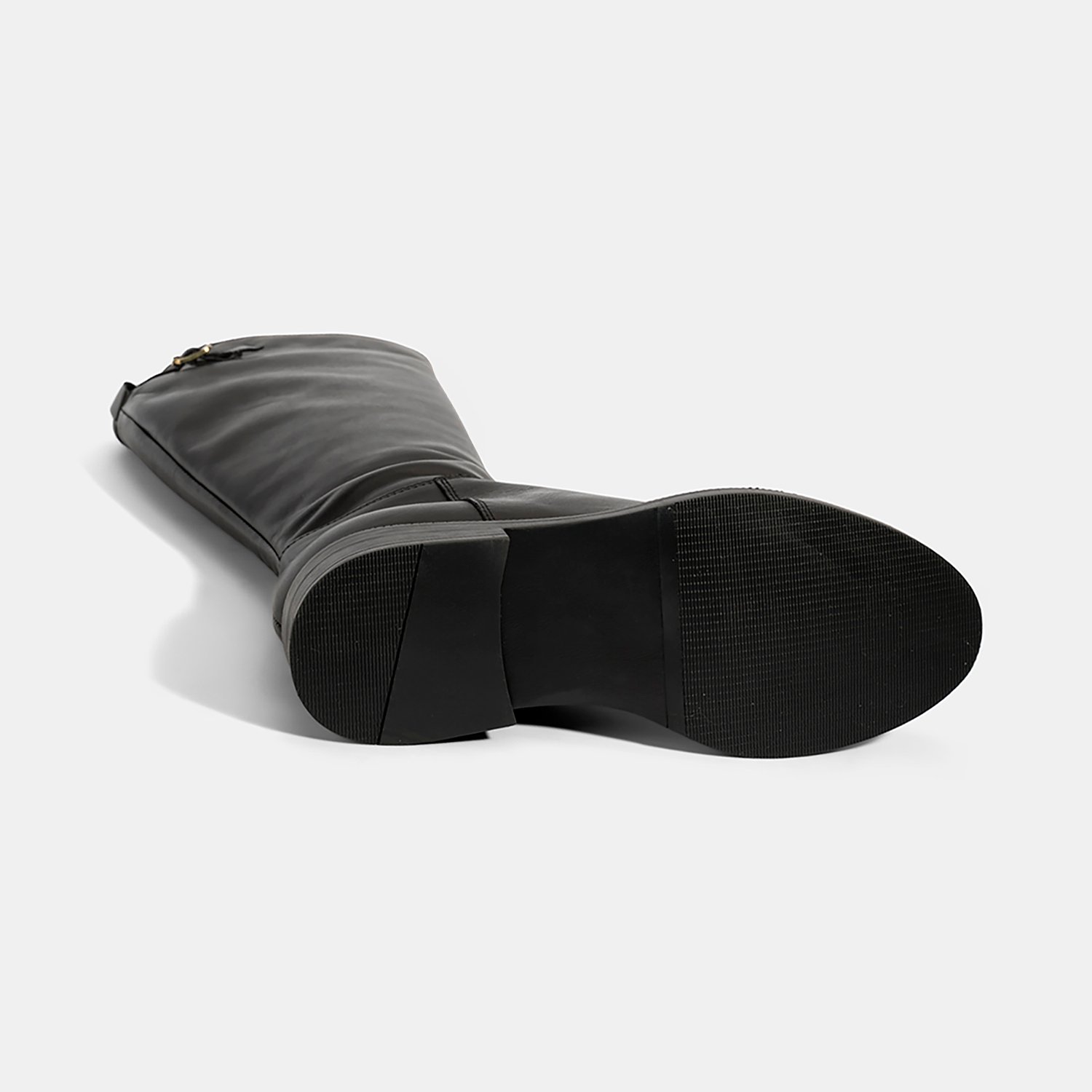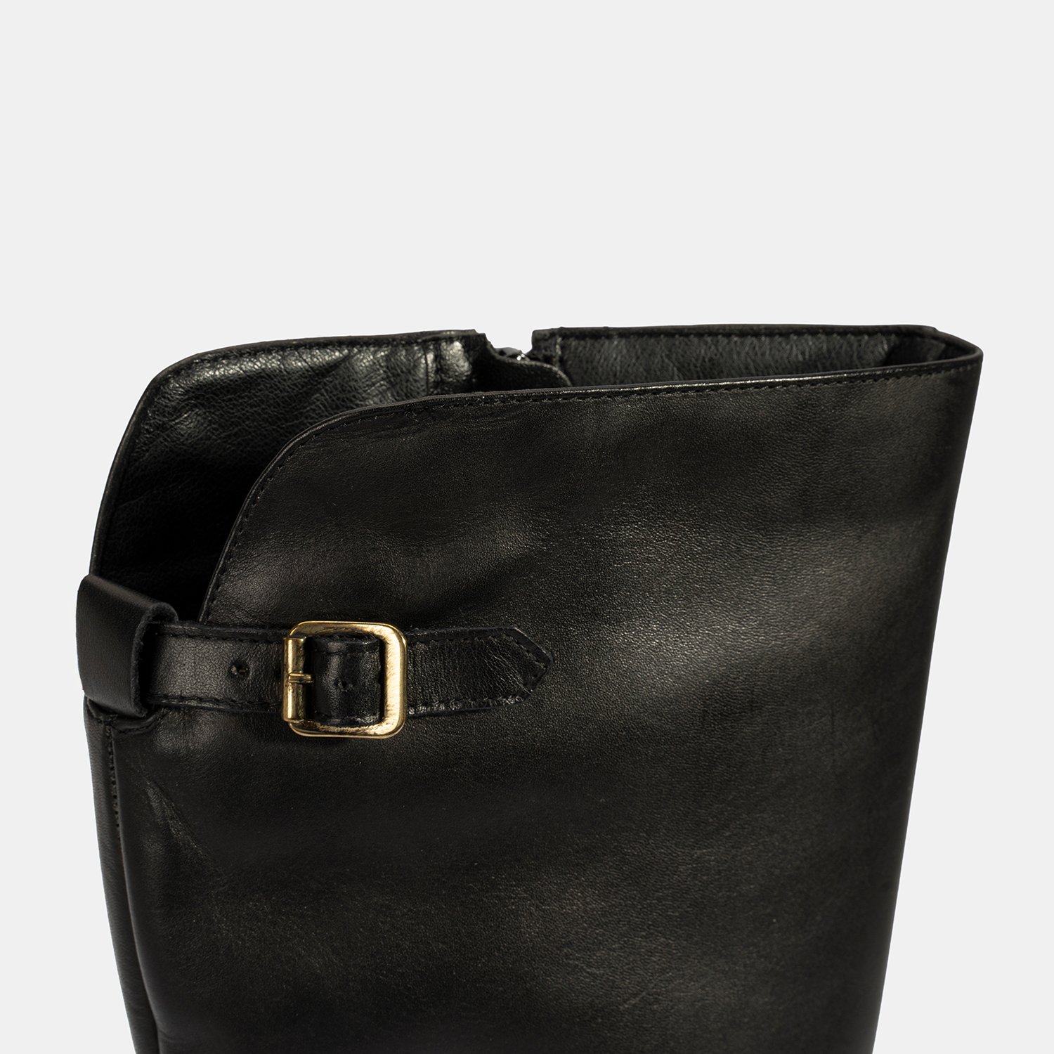 %100 deri, deri iç tabanlı, tekstil astarlı, metal toka detaylı, termo tabanlı, içten fermuarlı kadın çizme. Topuk yüksekliği: 3 cm.