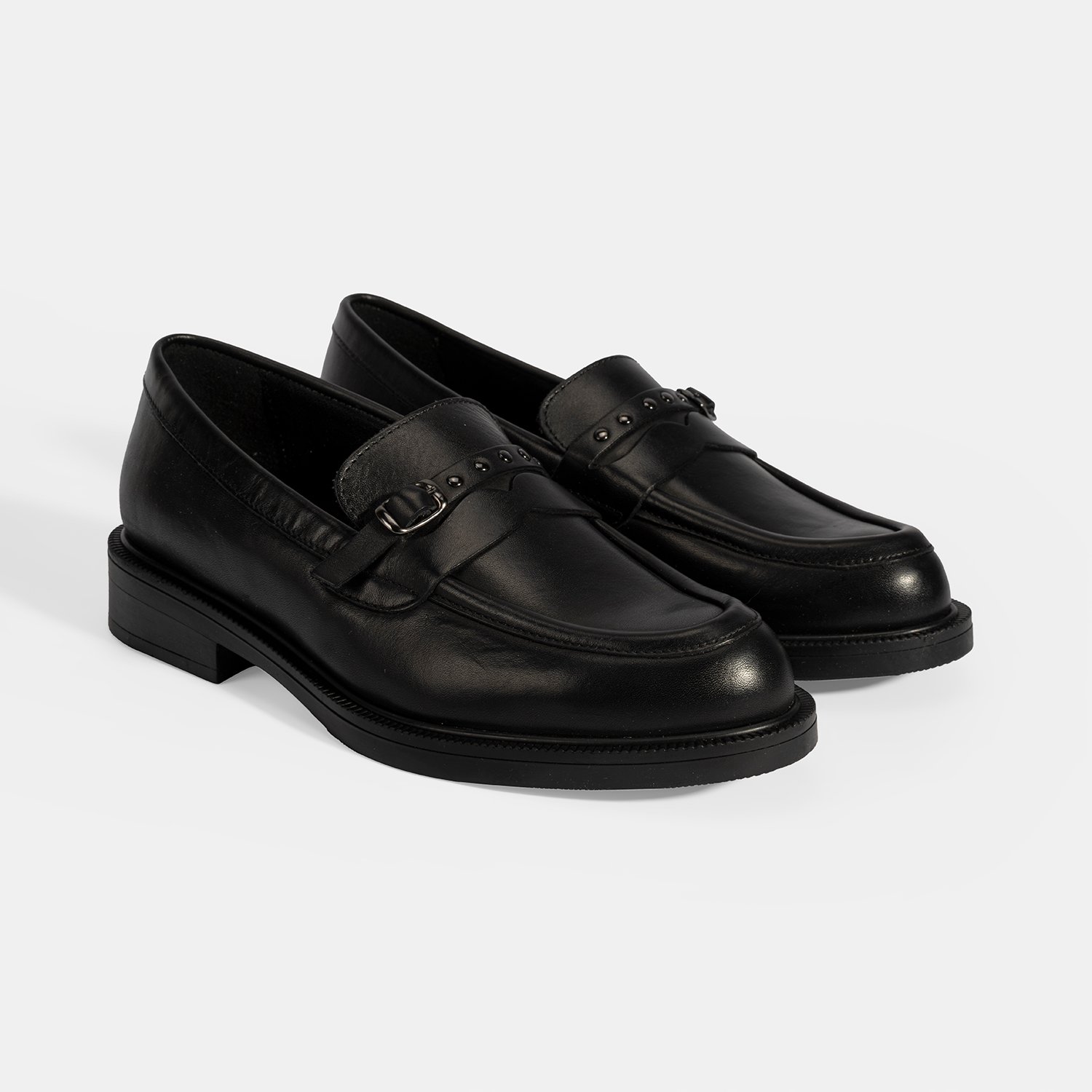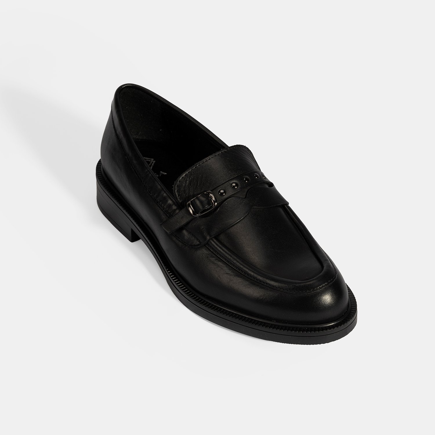 Kadın Siyah Metal Toka Detaylı Deri Loafer