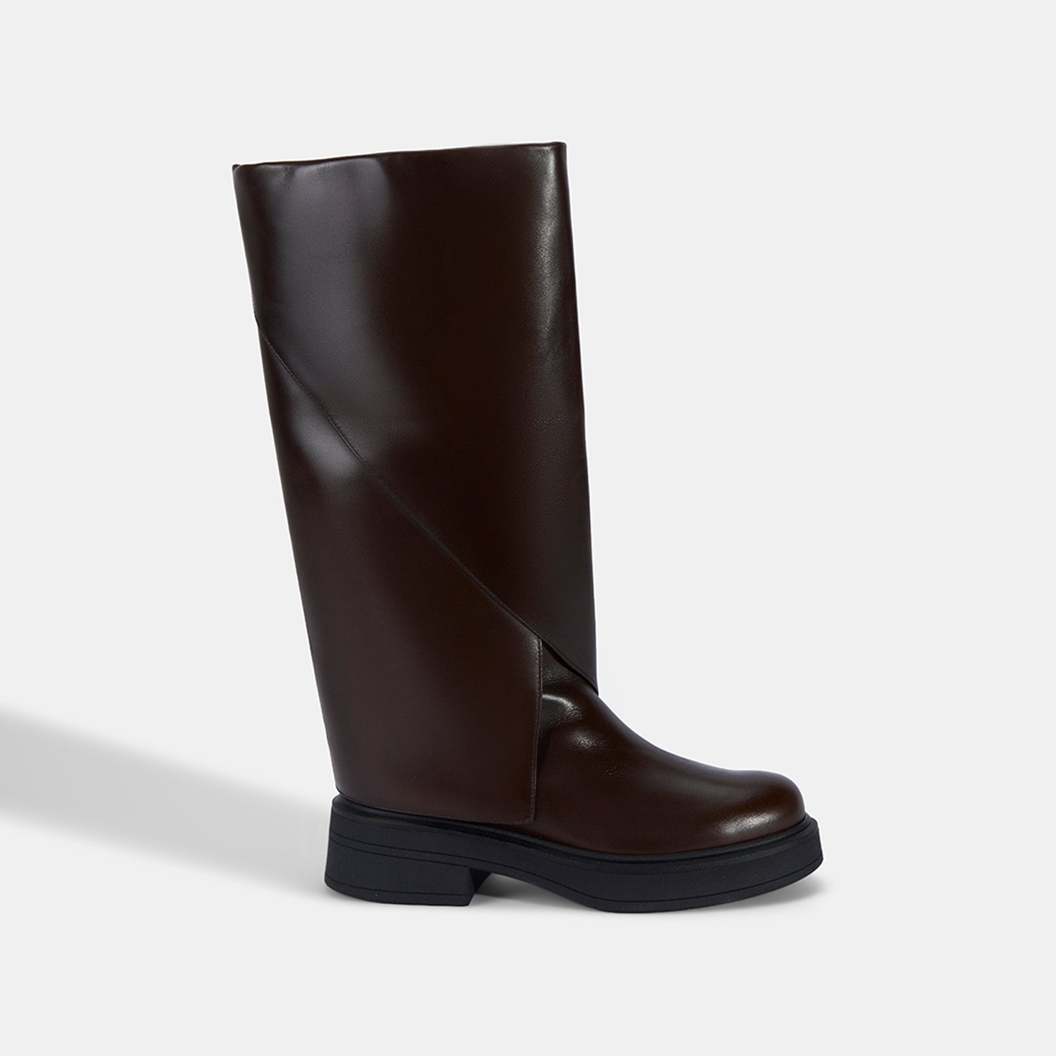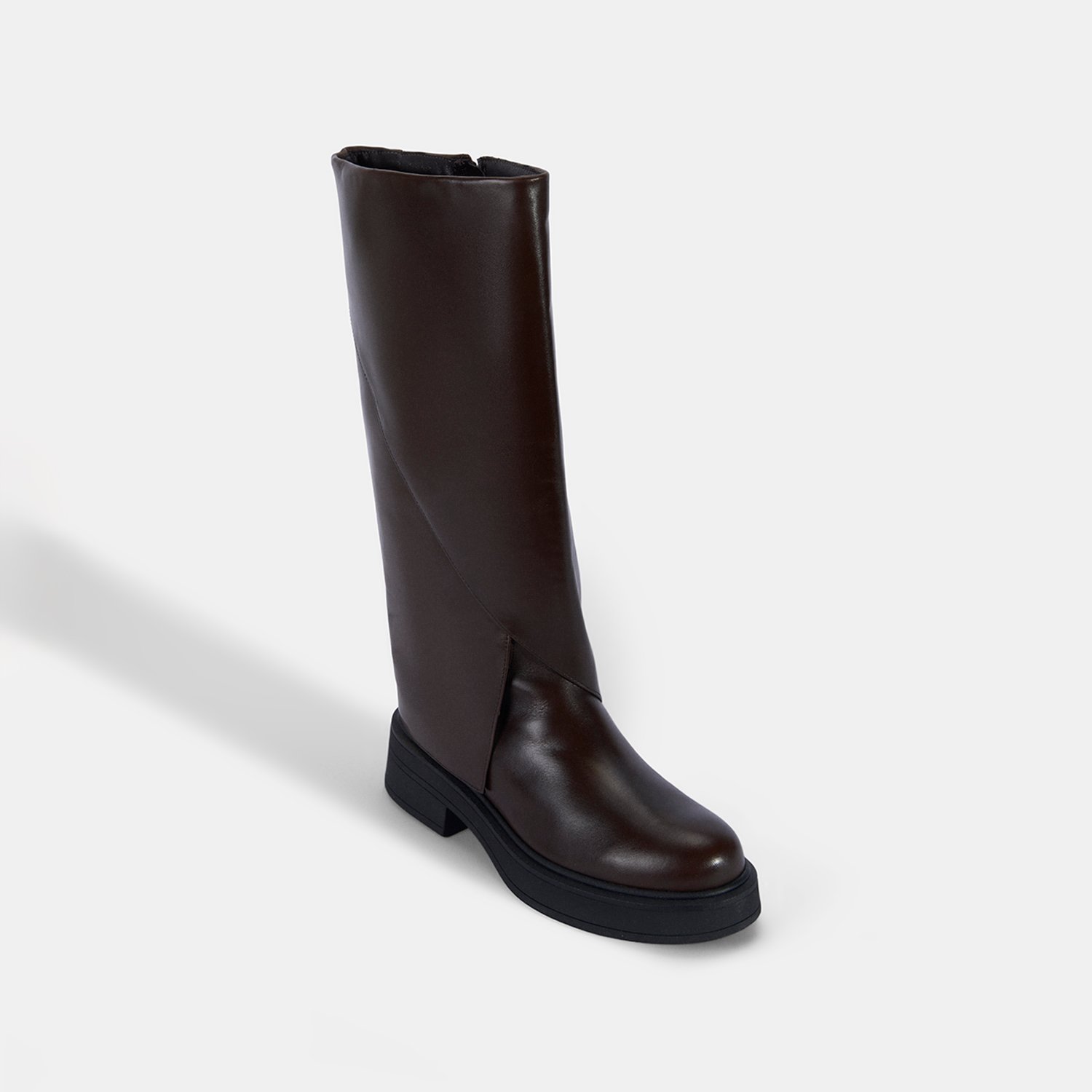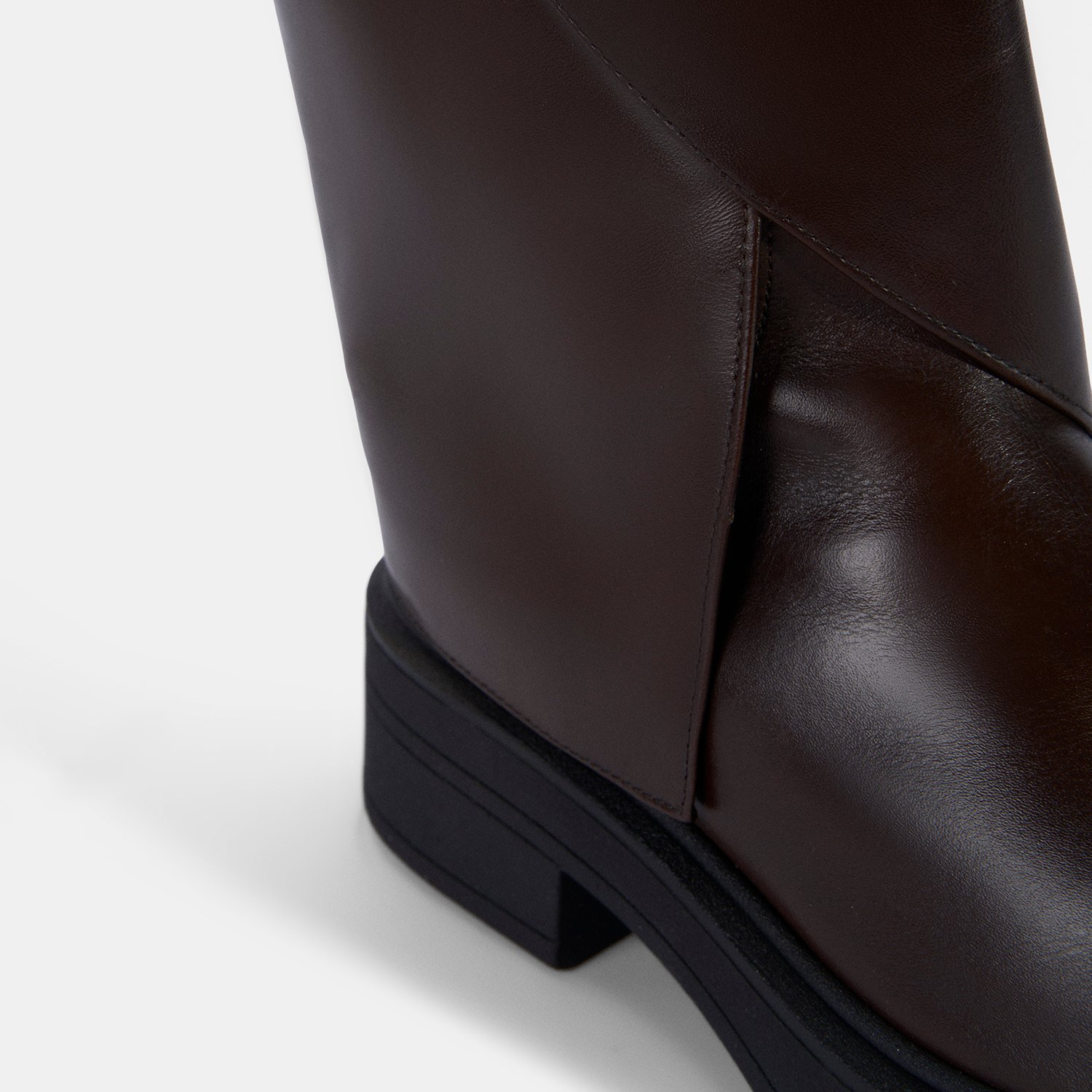 %100 deri, deri iç tabanlı, tekstil astarlı, termo tabanlı, katlama detaylı kadın çizme. Topuk yüksekliği: 4,5 cm.