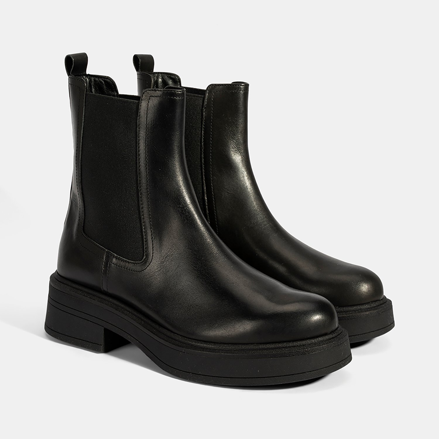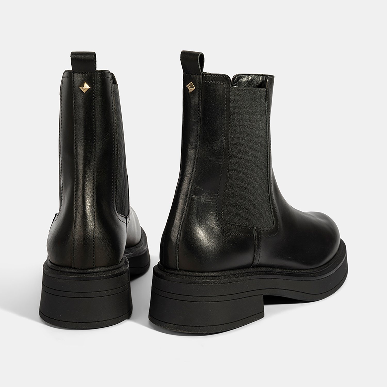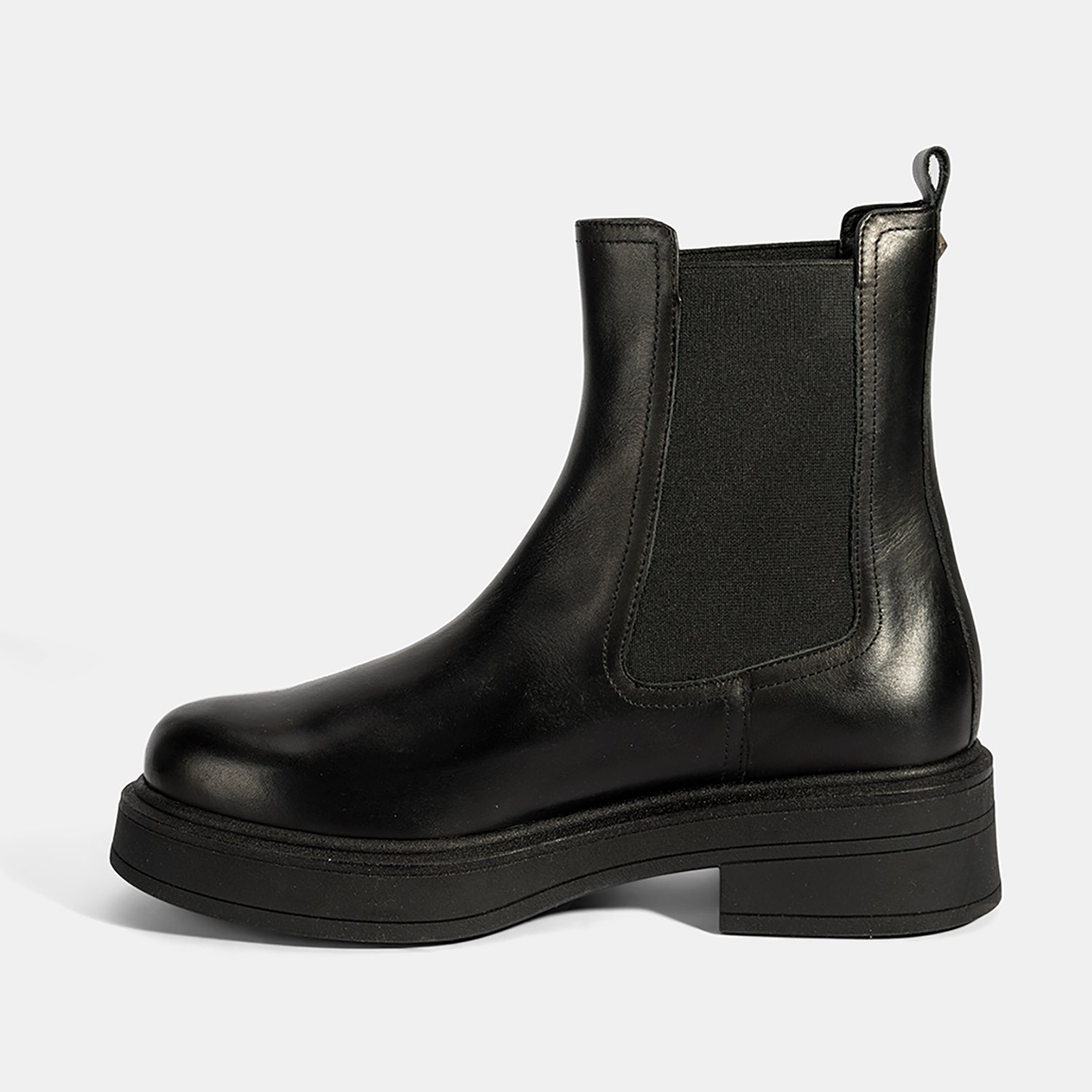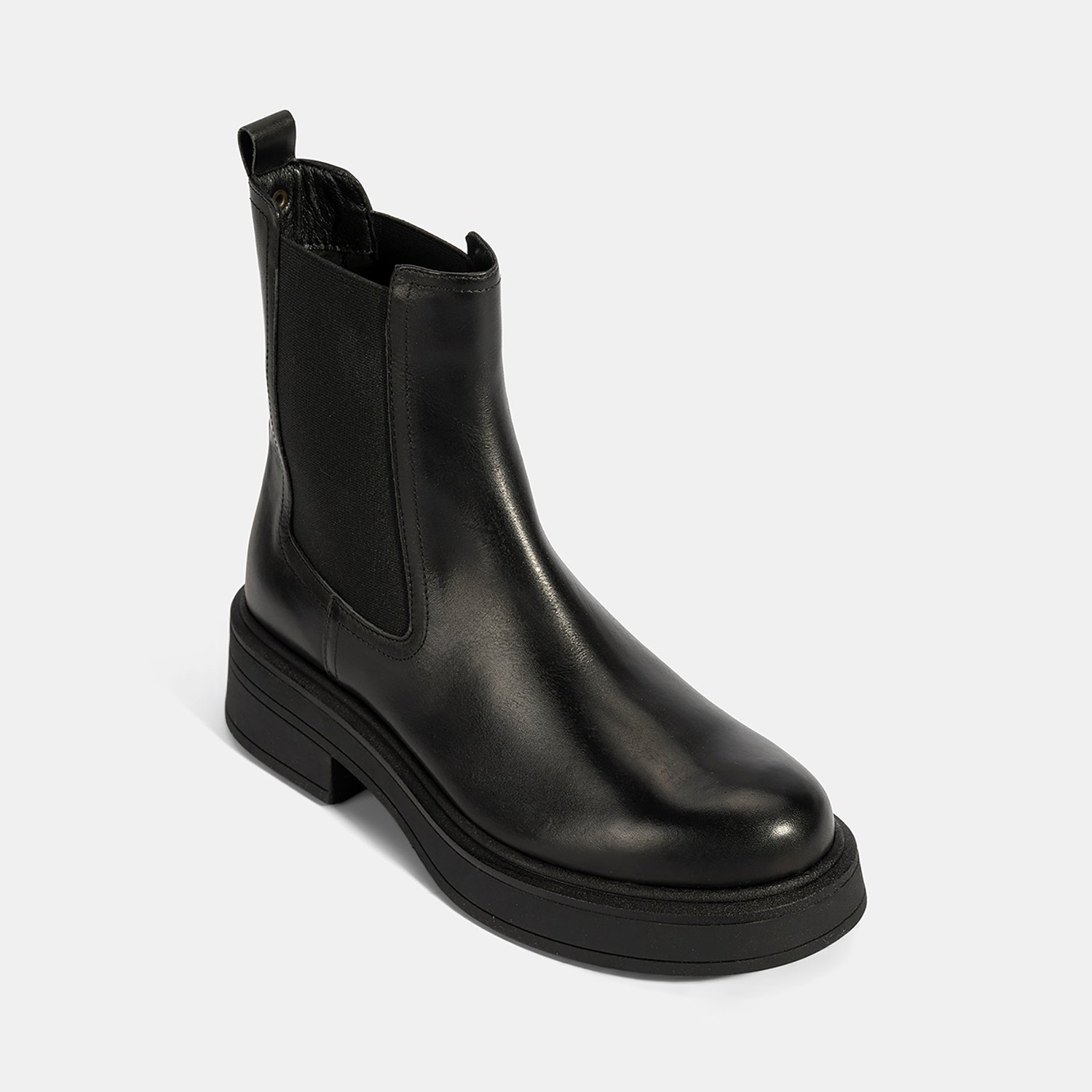 %100 deri dış yüzey, deri iç taban, tekstil astar; lastik detaylı, termo tabanlı kadın Chelsea bot. Topuk yüksekliği: 4,5 cm.