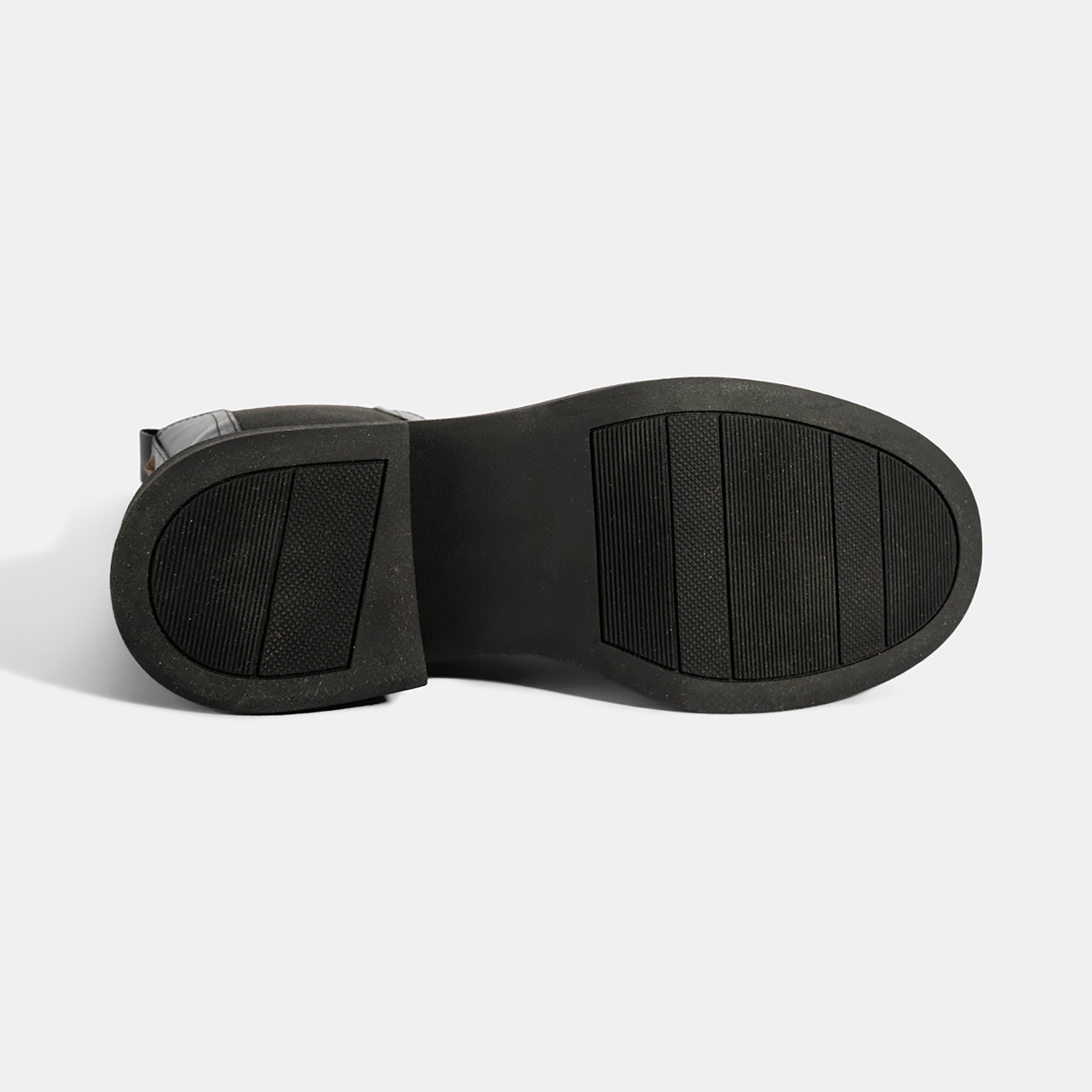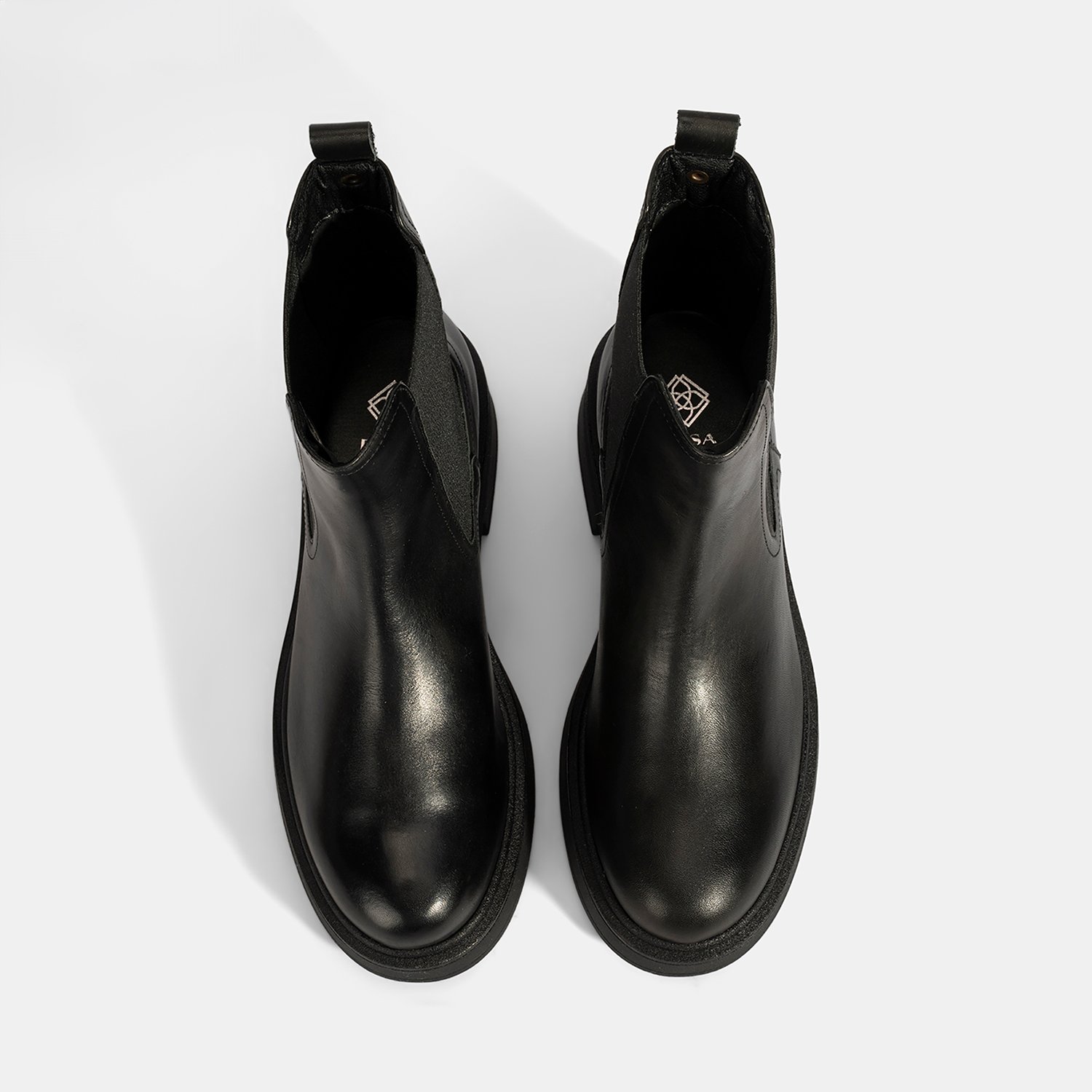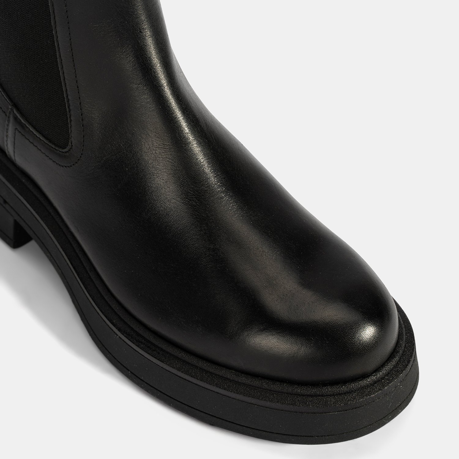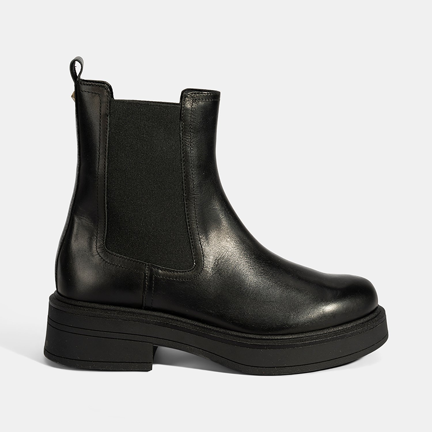 %100 deri dış yüzey, deri iç taban, tekstil astar; lastik detaylı, termo tabanlı kadın Chelsea bot. Topuk yüksekliği: 4,5 cm.