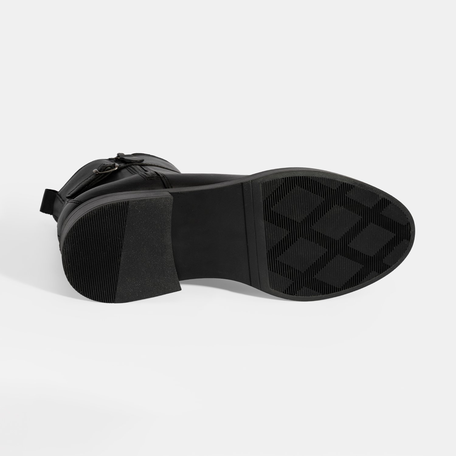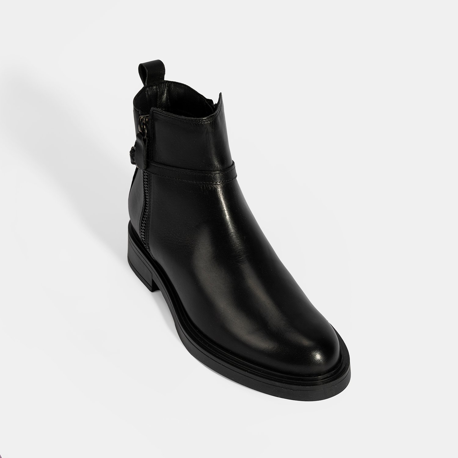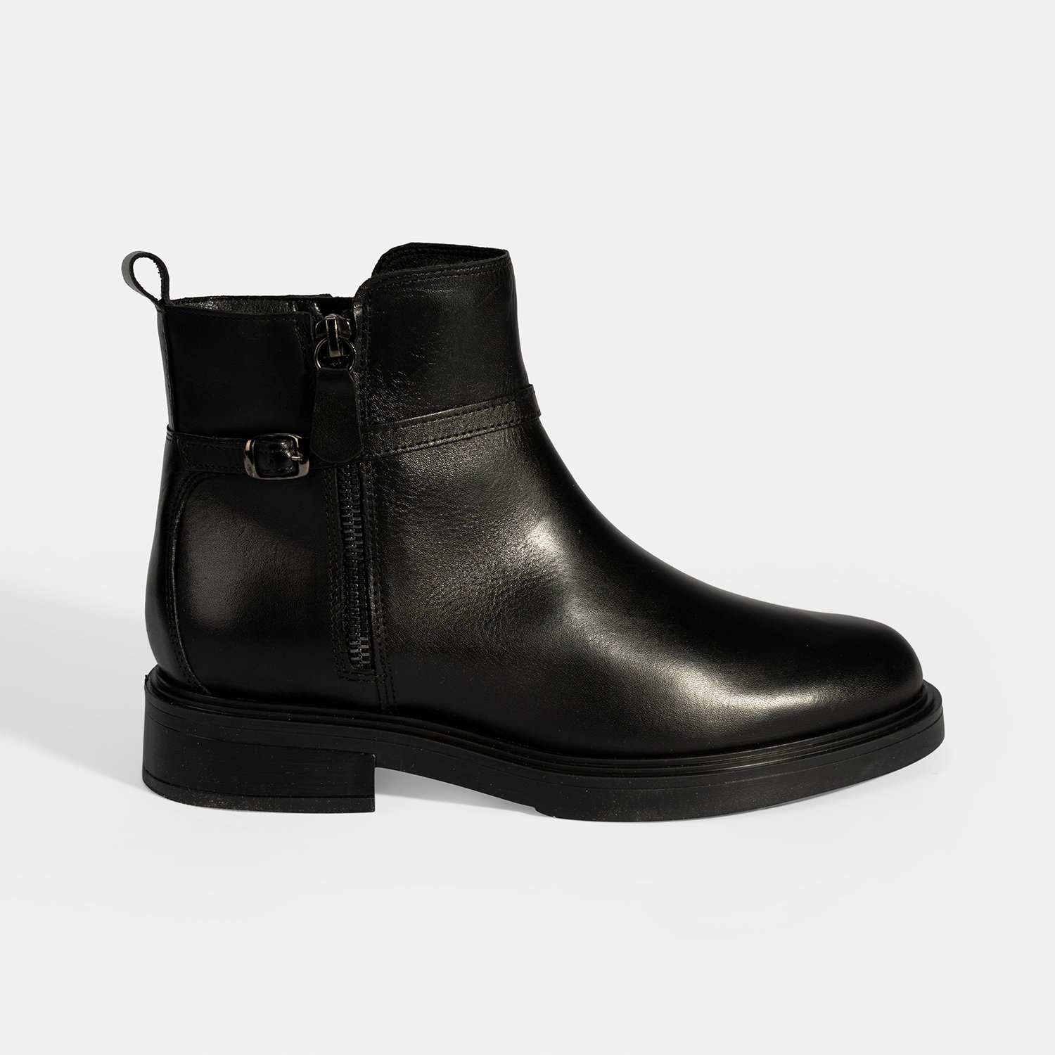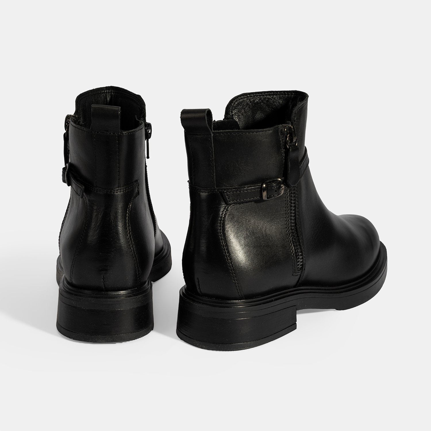 %100 deri, deri iç tabanlı, tekstil astarlı, metal toka aksesuar detaylı, termo tabanlı, içten fermuarlı kadın bot. Topuk yüksekliği: 3 cm.