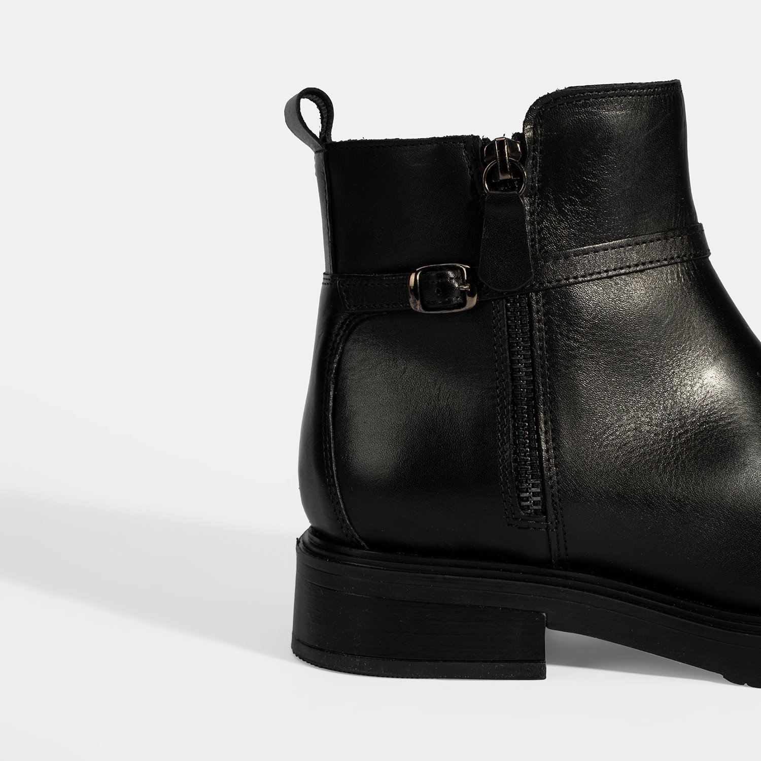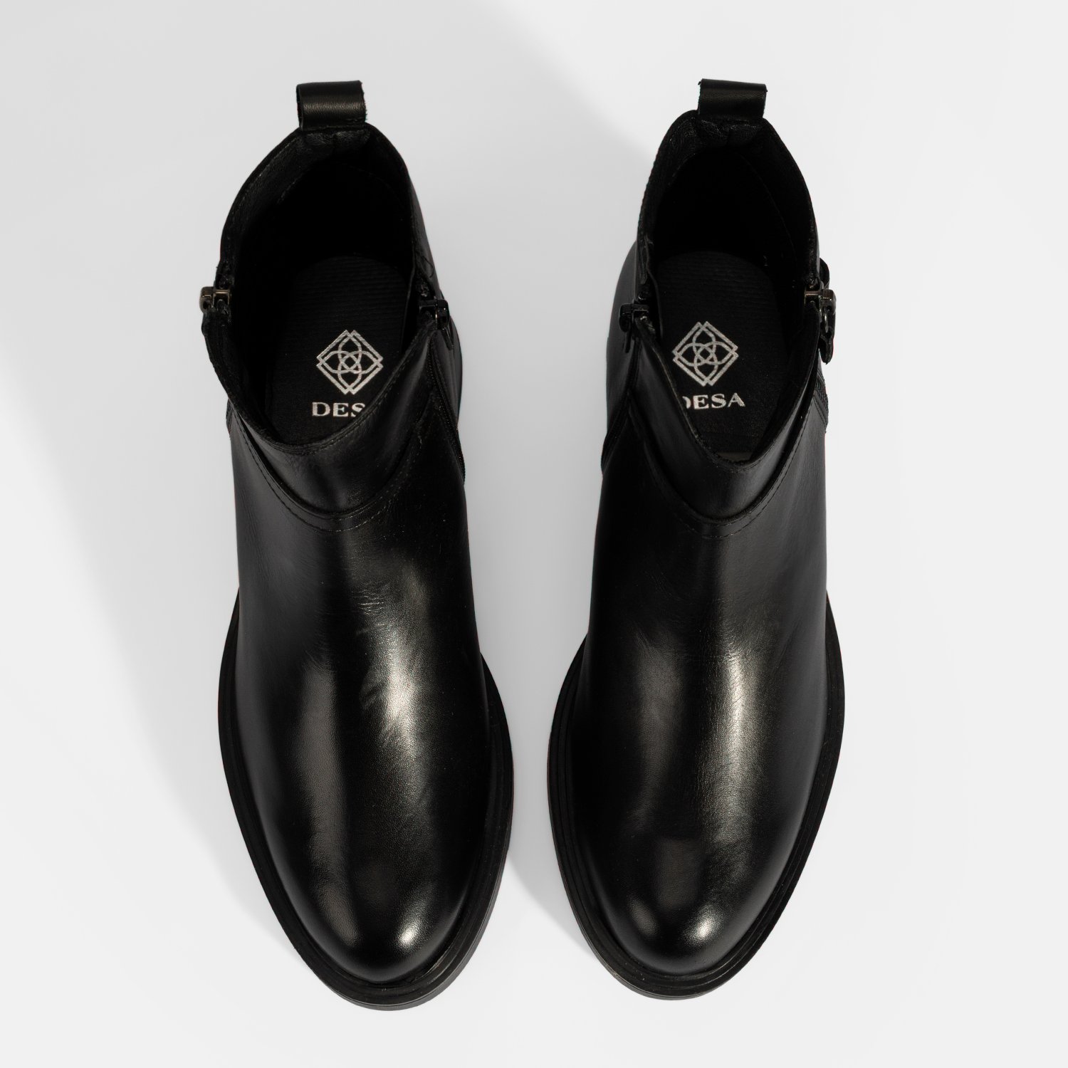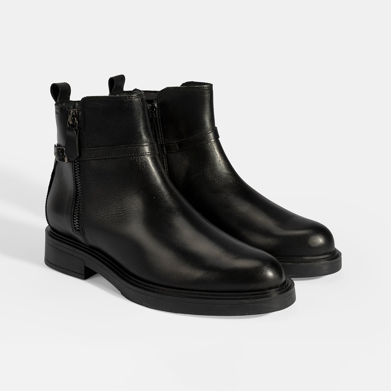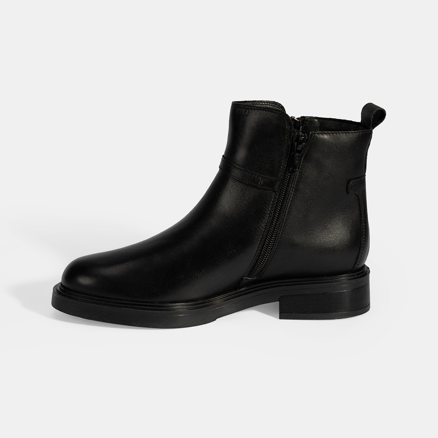 %100 deri, deri iç tabanlı, tekstil astarlı, metal toka aksesuar detaylı, termo tabanlı, içten fermuarlı kadın bot. Topuk yüksekliği: 3 cm.