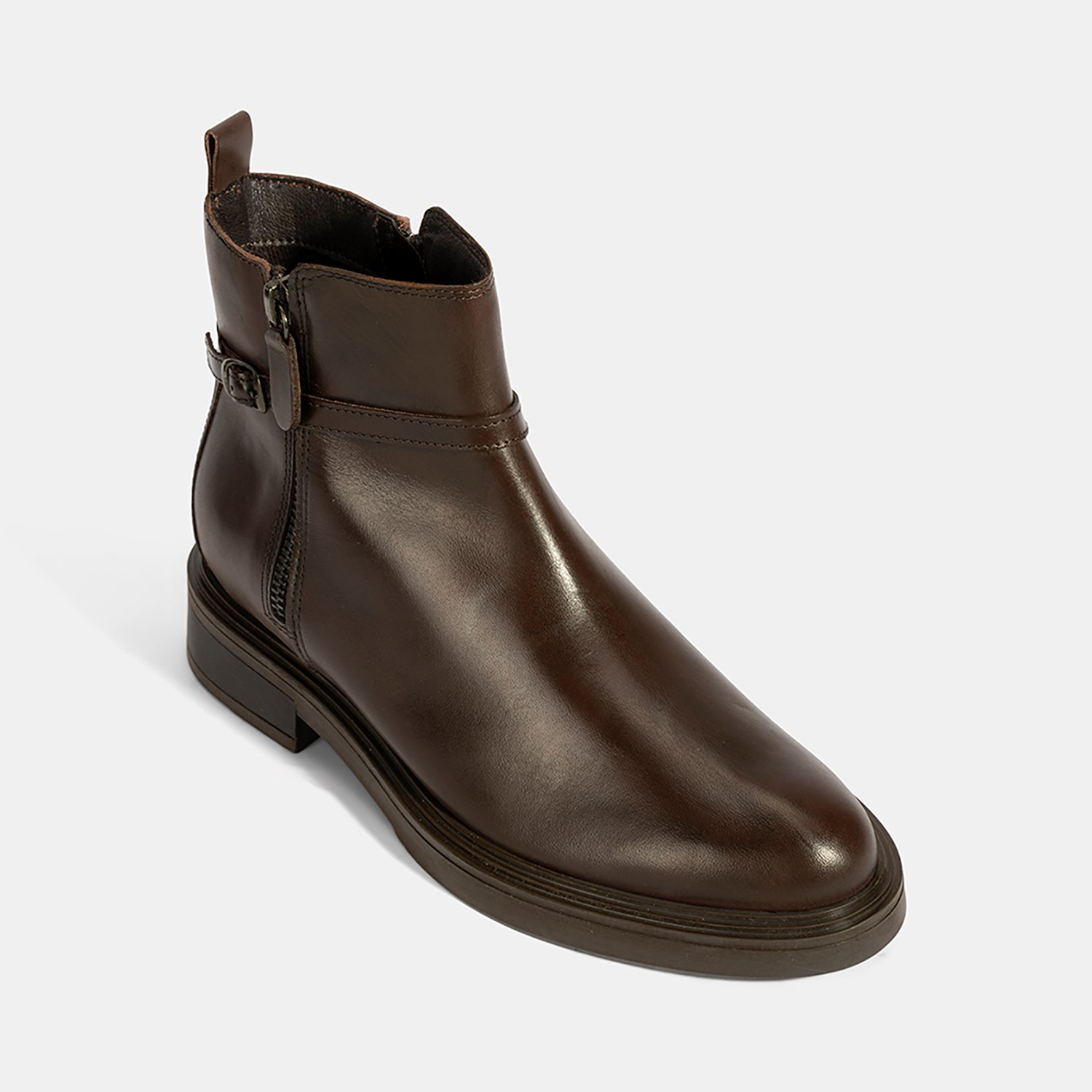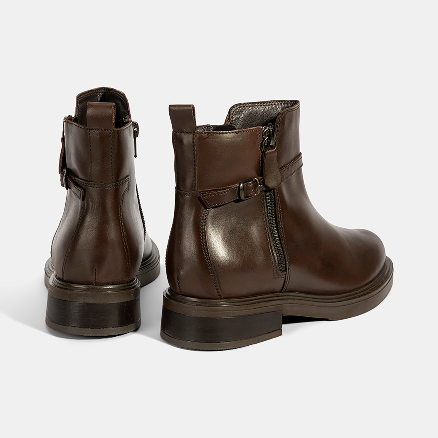%100 deri, deri iç tabanlı, tekstil astarlı, metal toka aksesuar detaylı, termo tabanlı, içten fermuarlı kadın bot. Topuk yüksekliği: 3 cm.