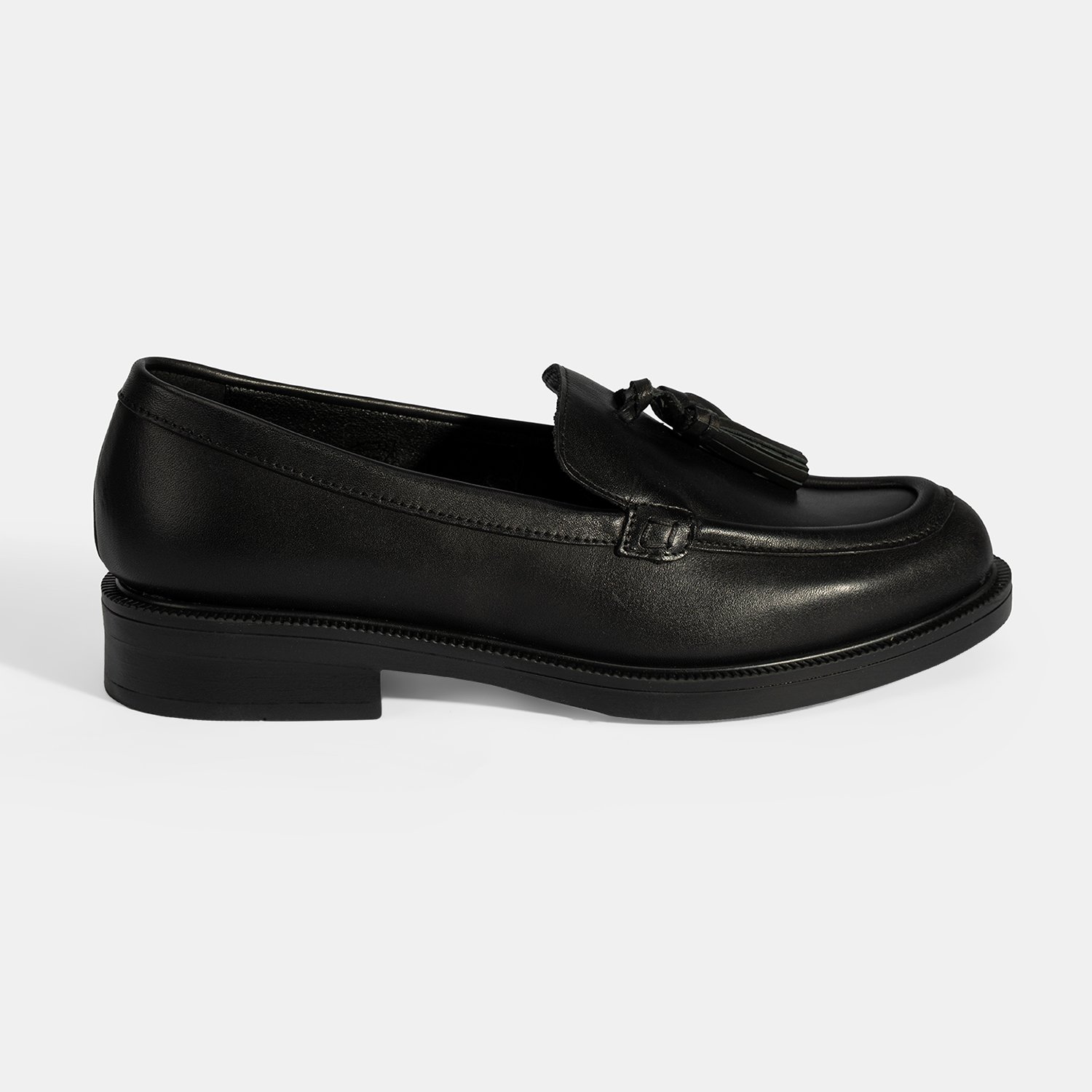 %100 deri, deri iç tabanlı, PU astarlı, deri püskül detaylı, termo tabanlı kadın loafer. Topuk yüksekliği: 3 cm.