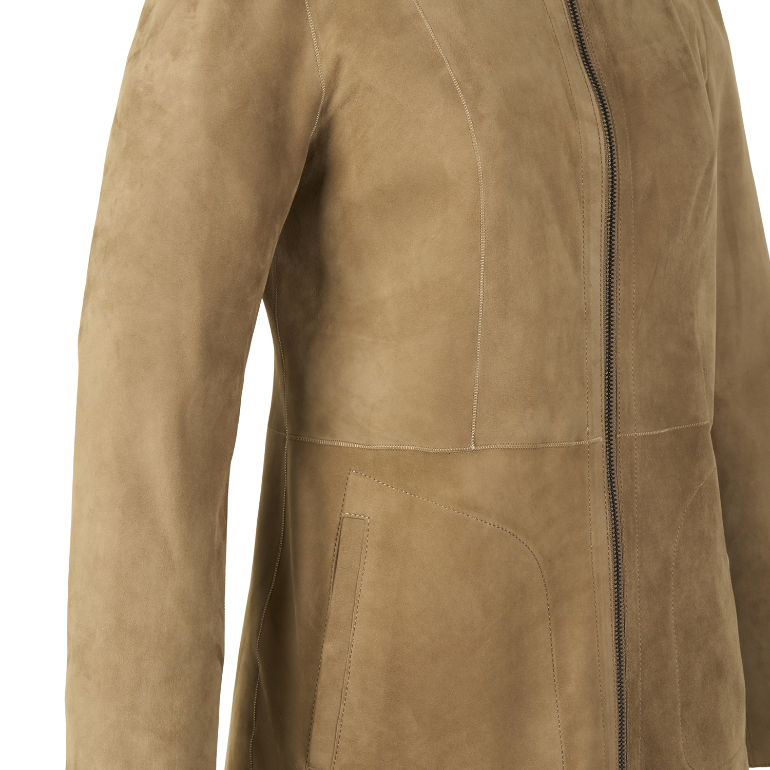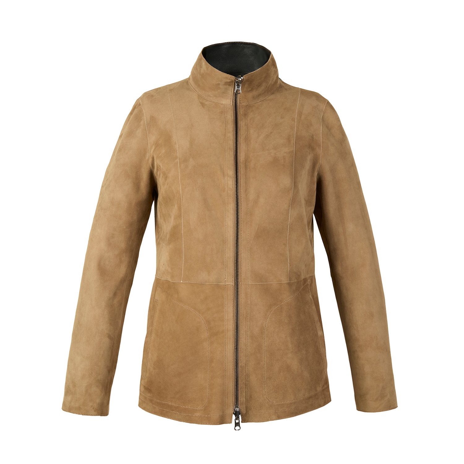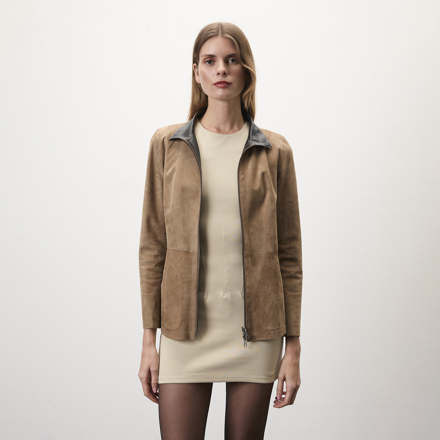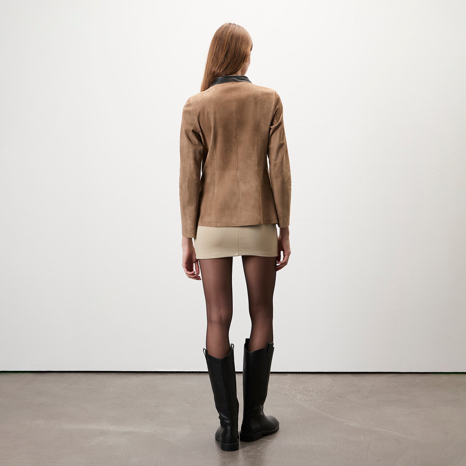 Ceketin ön yüzü süet deri dokusuyla dikkat çekerken, diğer yüzü deri görünümlü olarak tasarlanarak farklı stillerle uyumlu hale getirilmiştir.