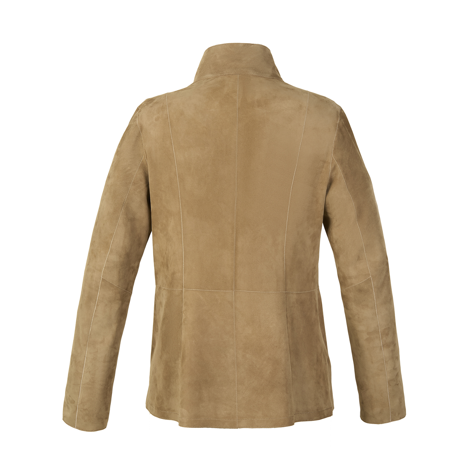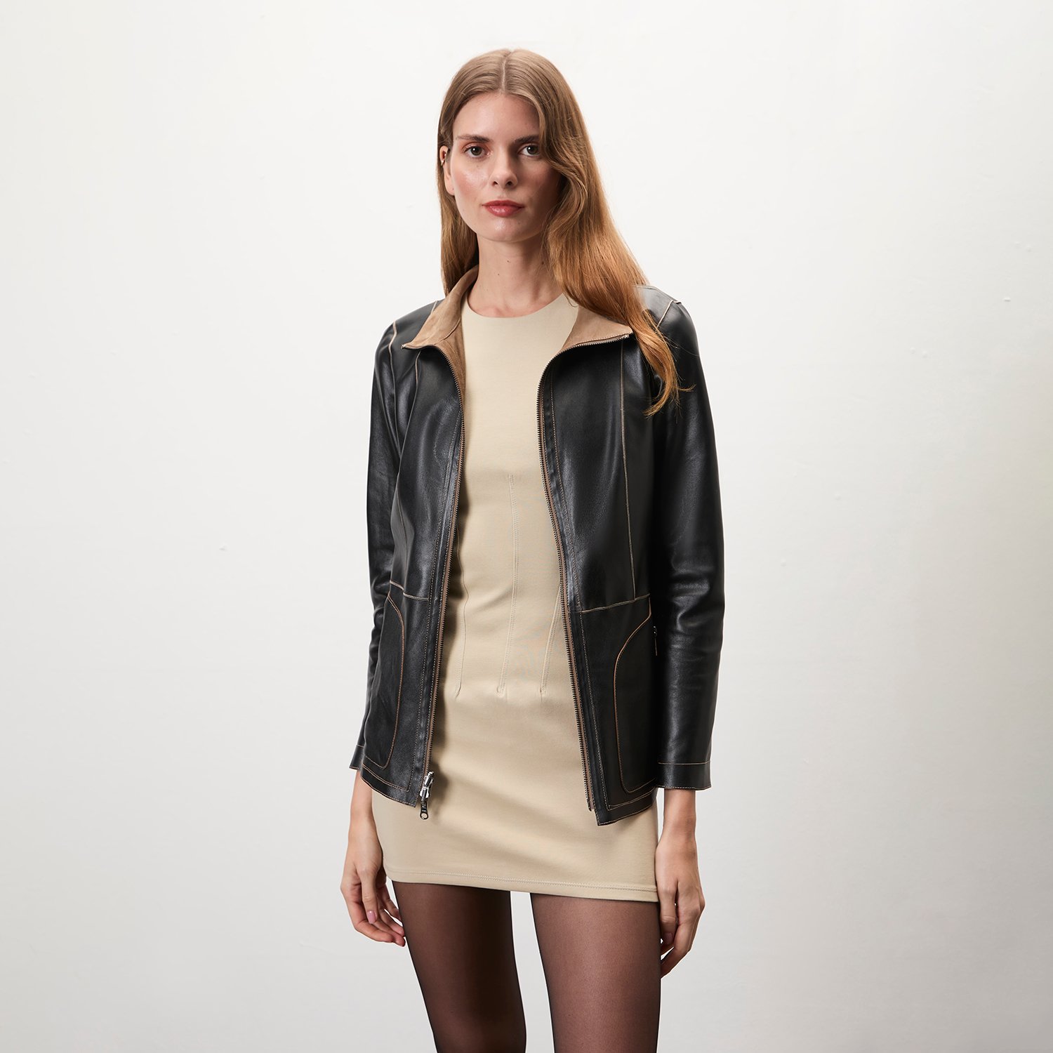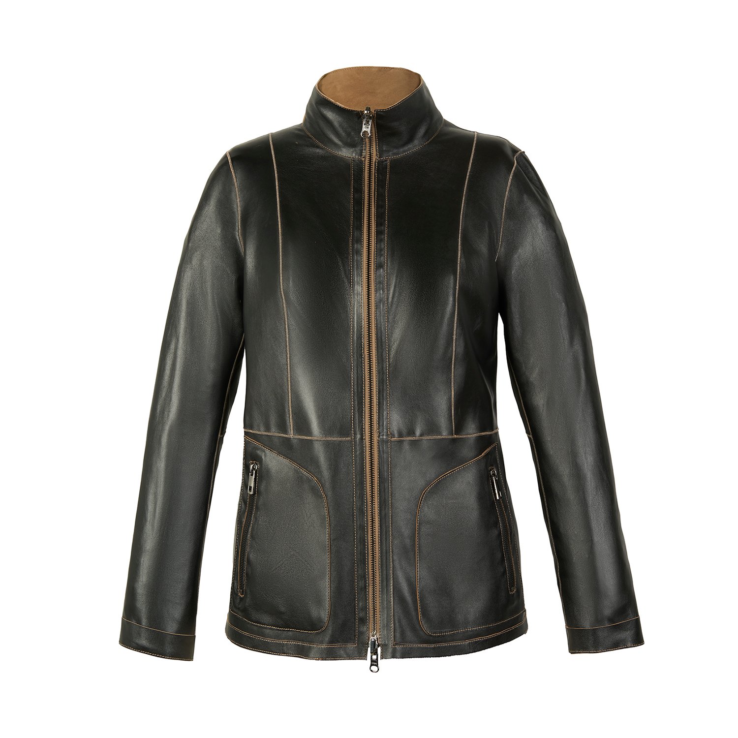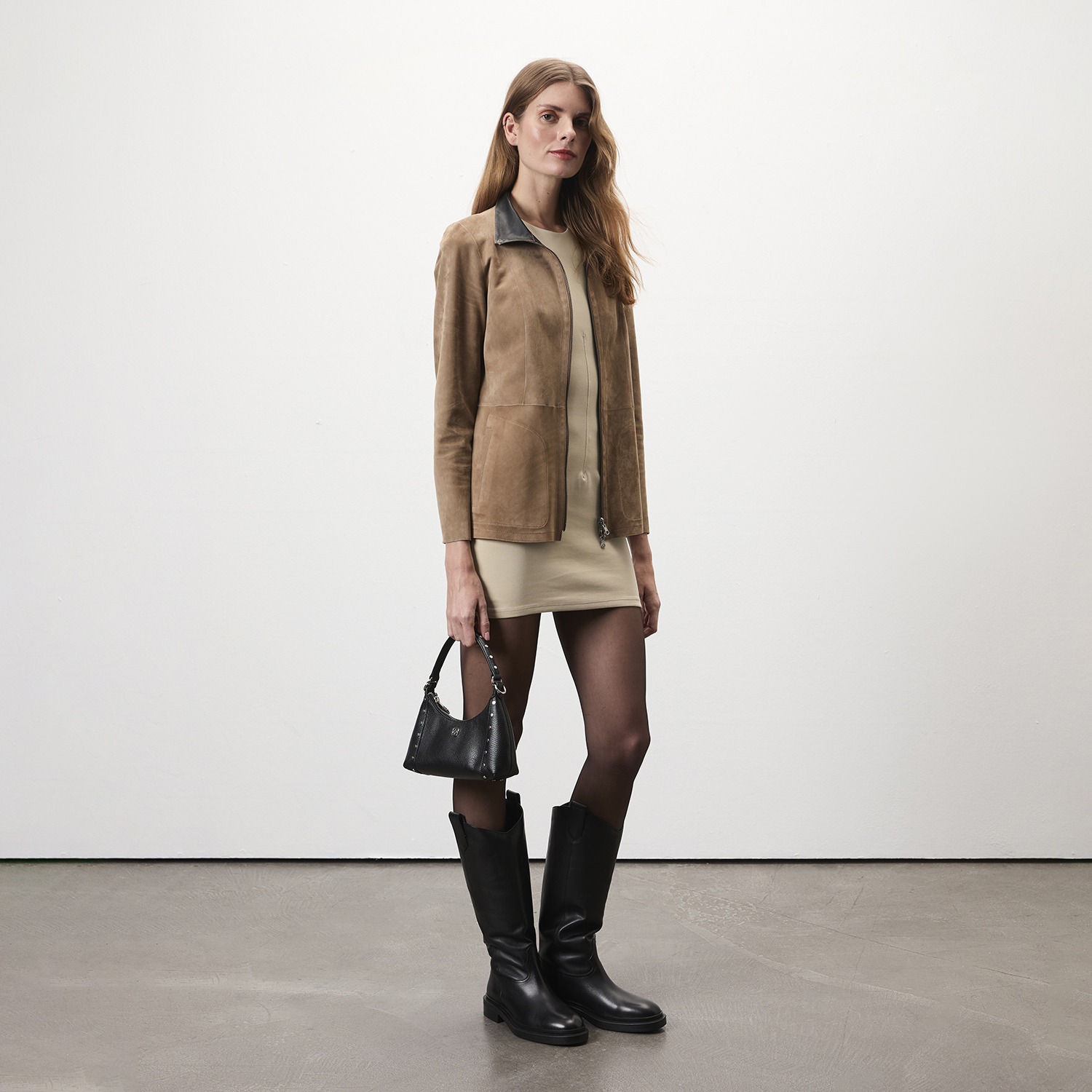 Ceketin ön yüzü süet deri dokusuyla dikkat çekerken, diğer yüzü deri görünümlü olarak tasarlanarak farklı stillerle uyumlu hale getirilmiştir.