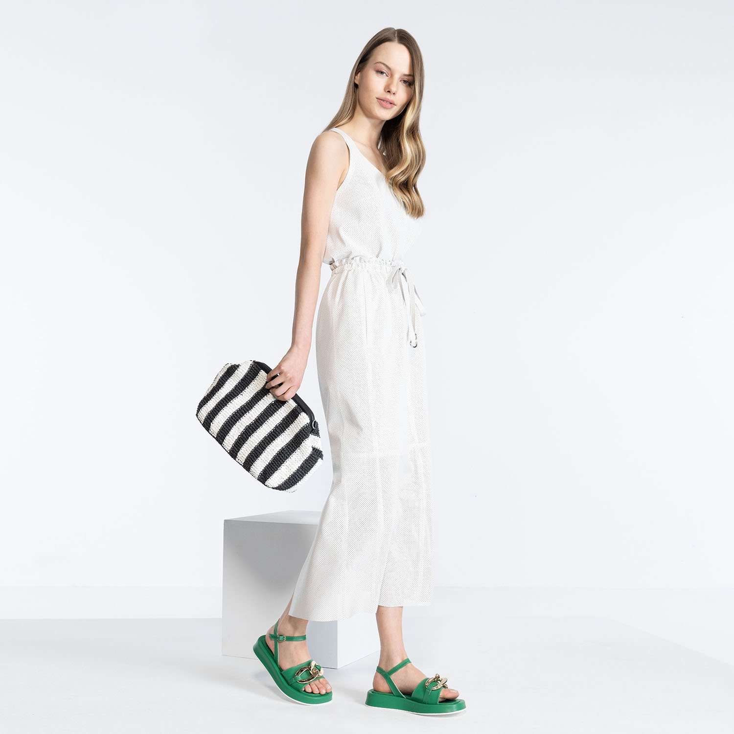 Beli lastikli çalışılmıştır. Belde ayalanabilir ucu metal aksesuarlı kemer detayı vardır.