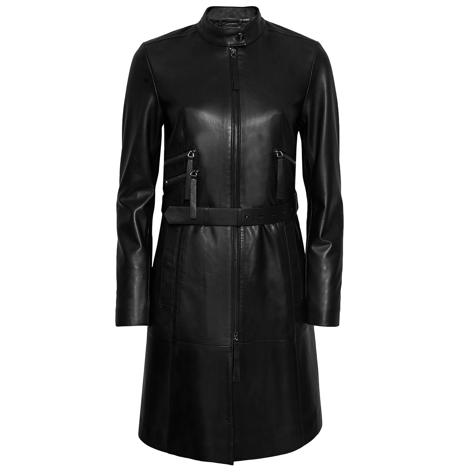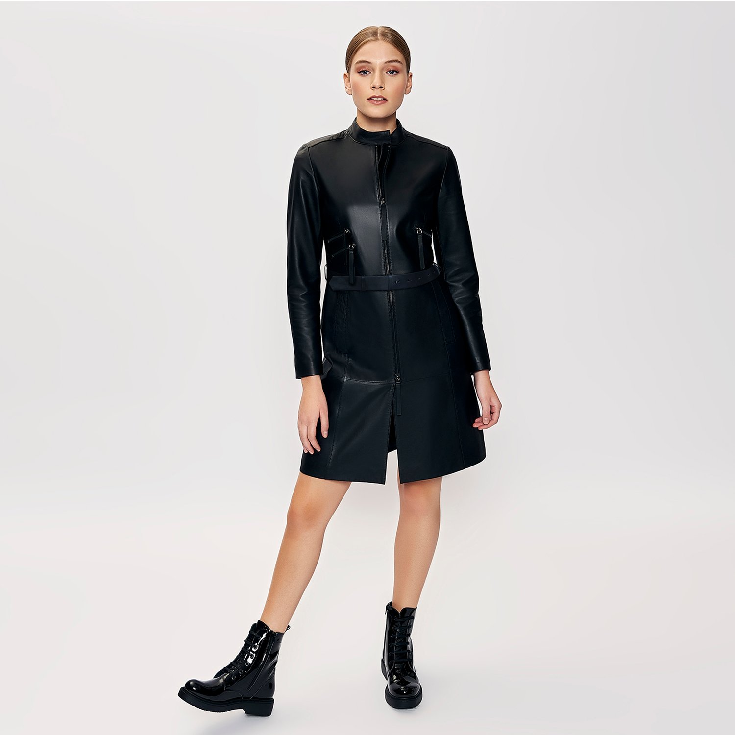 Klasik şıklığı benimseyen kadınlara, deri trençkot.