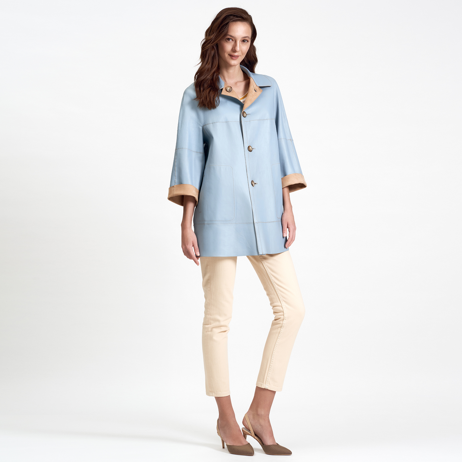 Tüm kombinlerin tamamlayıcı parçası olacak, çift taraflı deri pardösü.