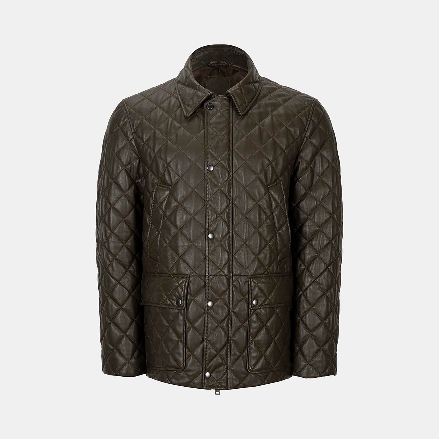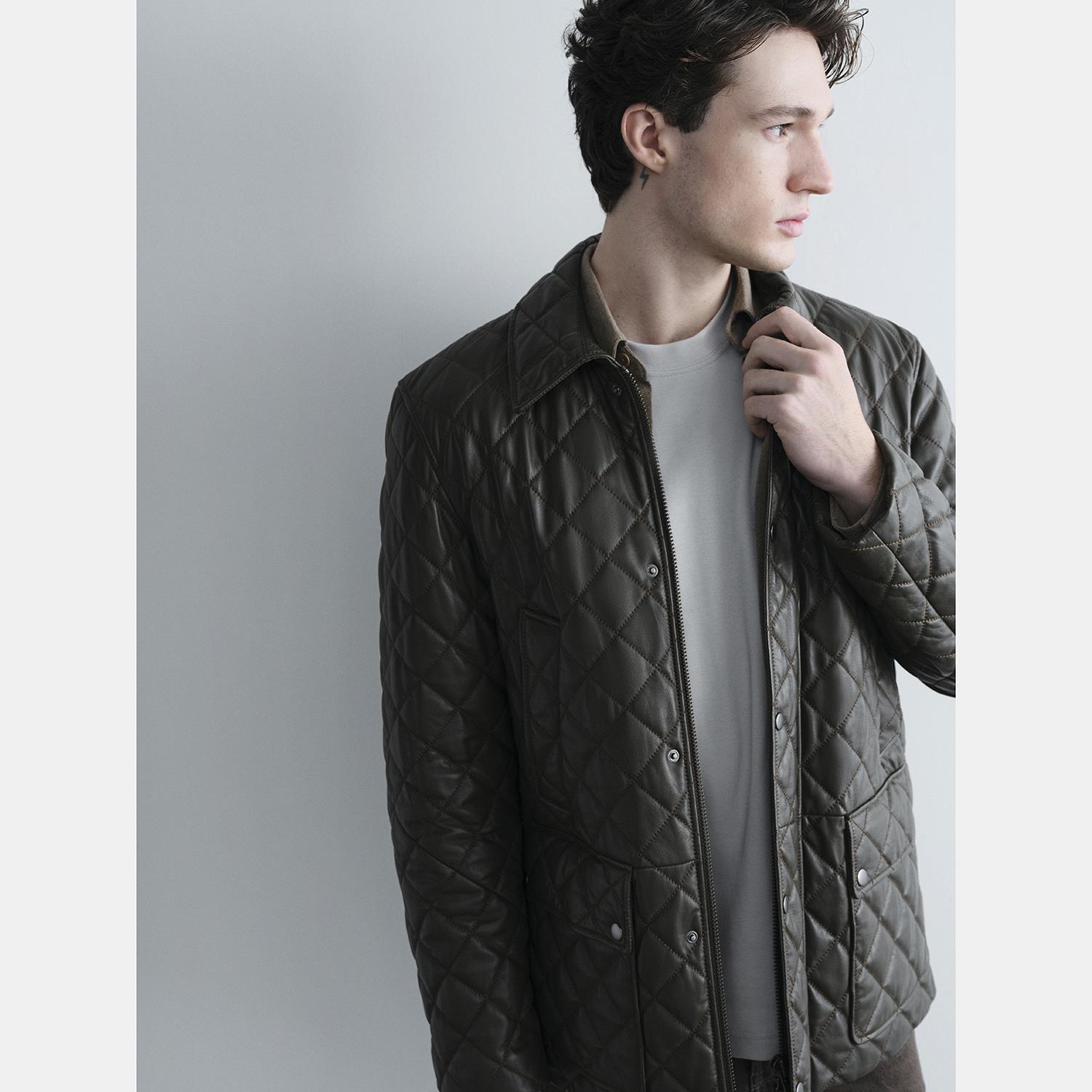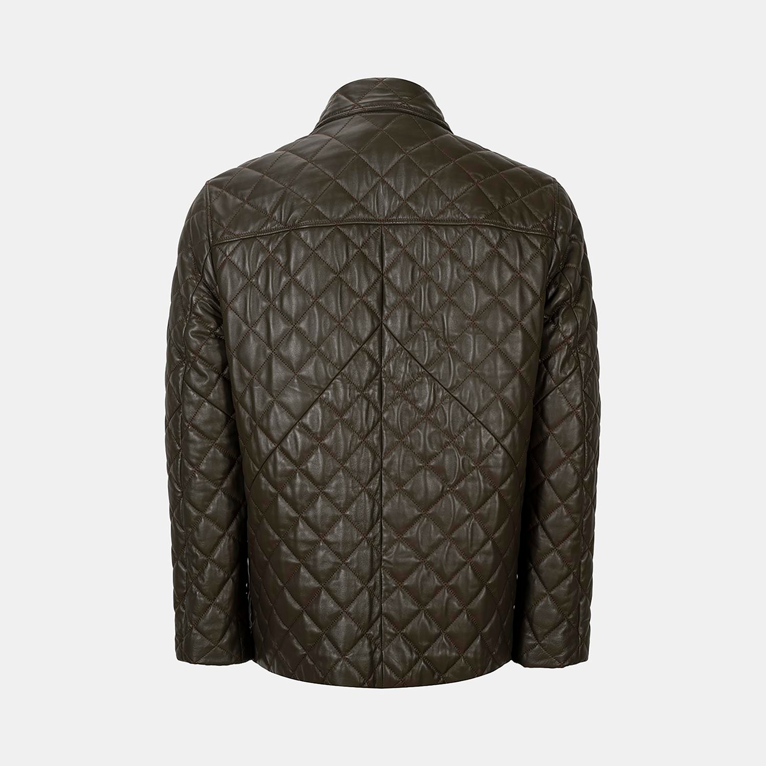 Erkek Yeşil Gömlek Yakalı Kapitoneli Deri Mont