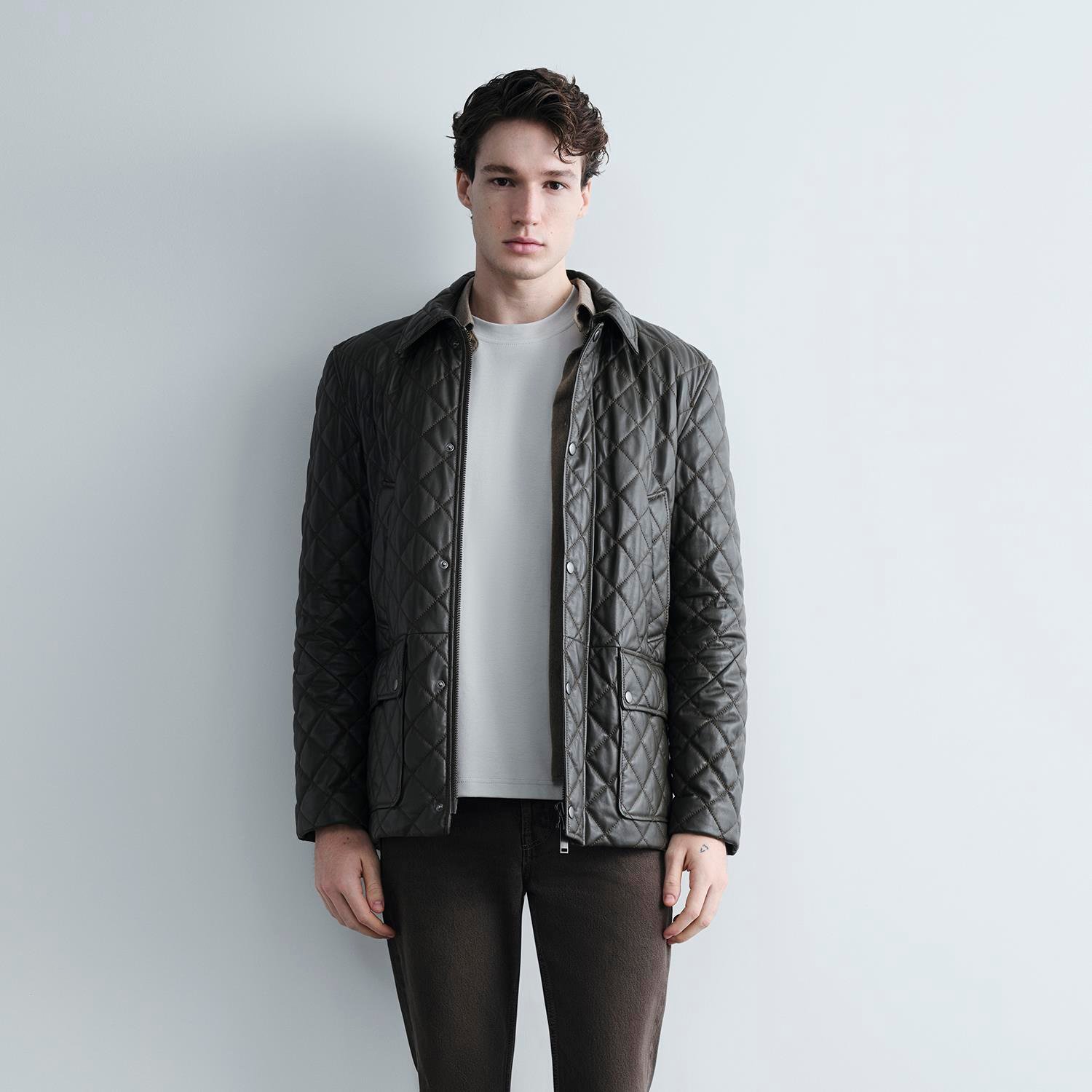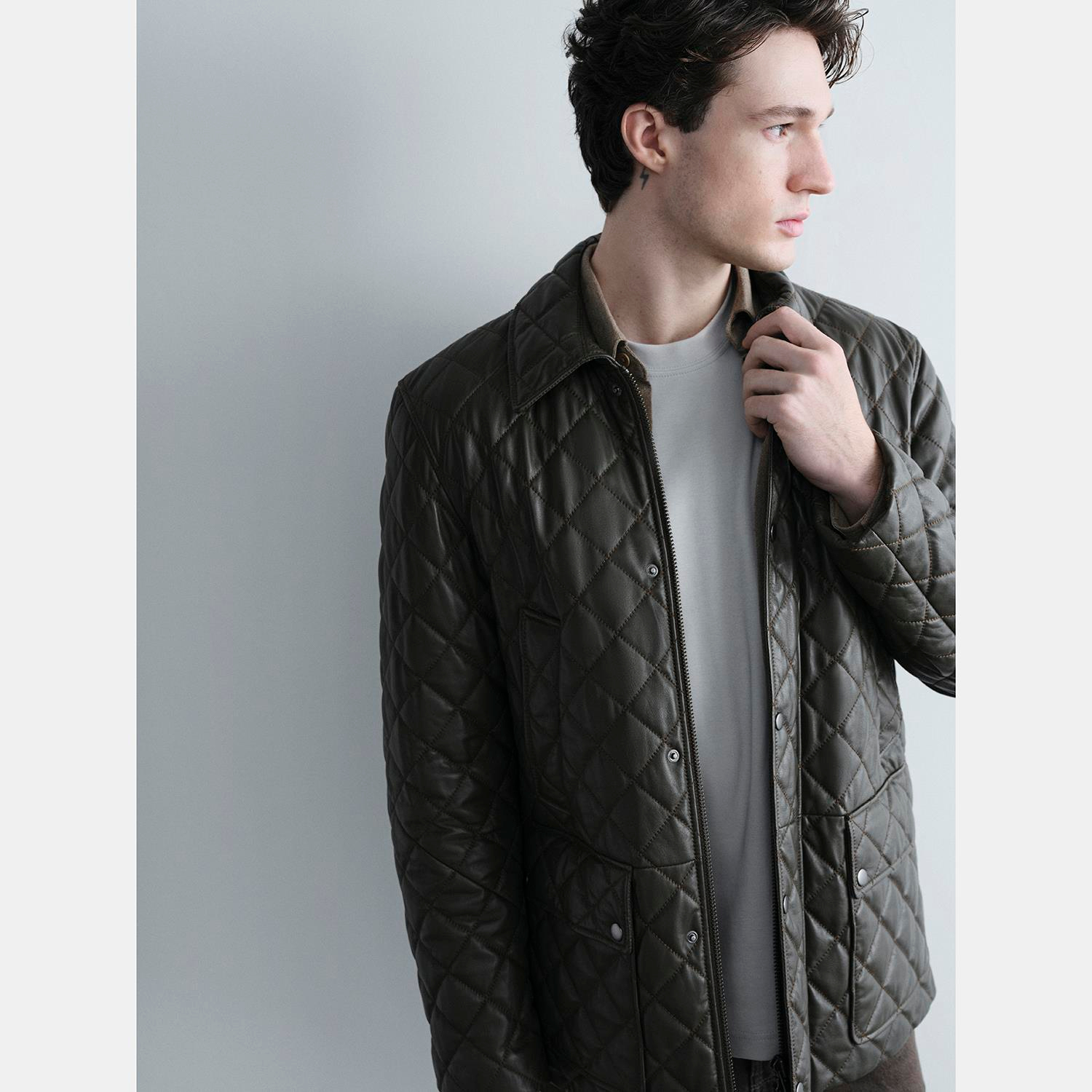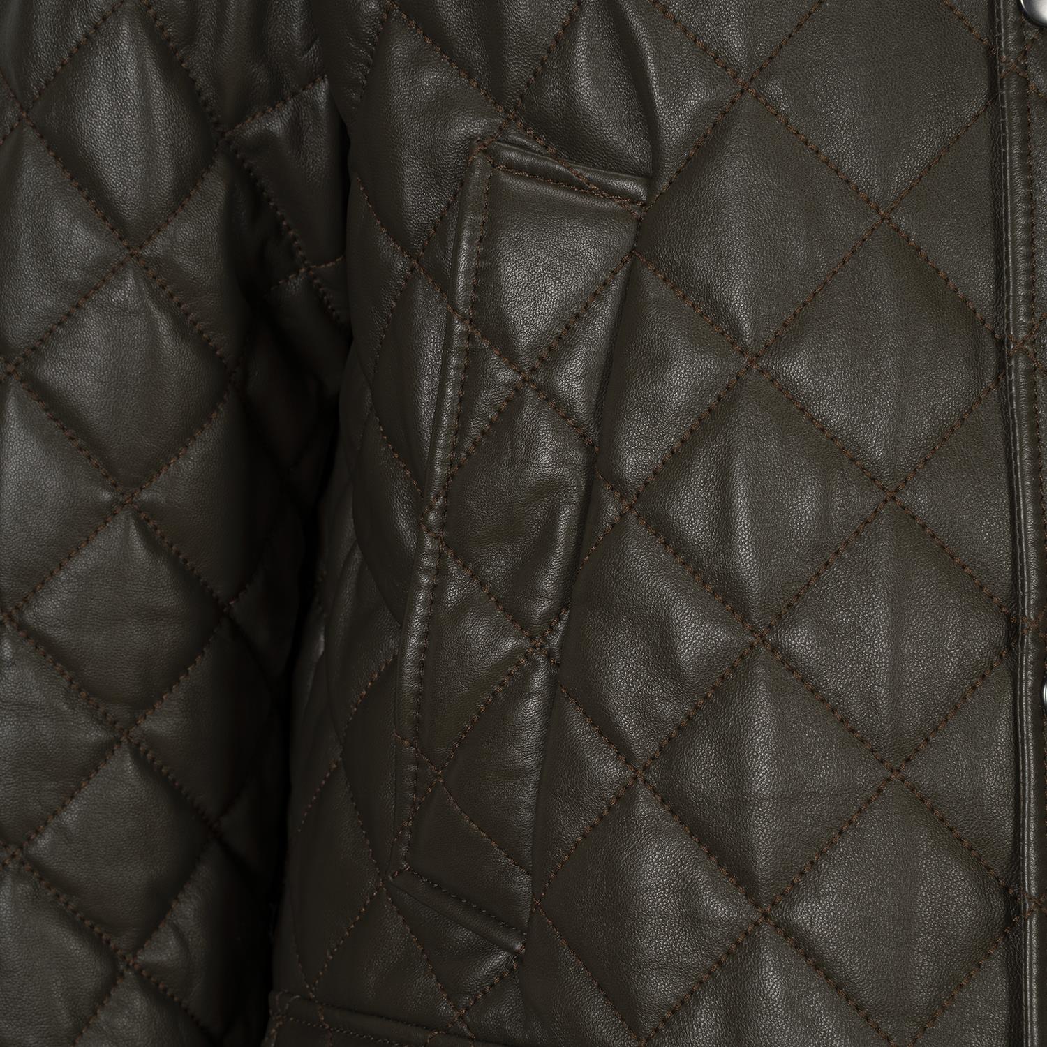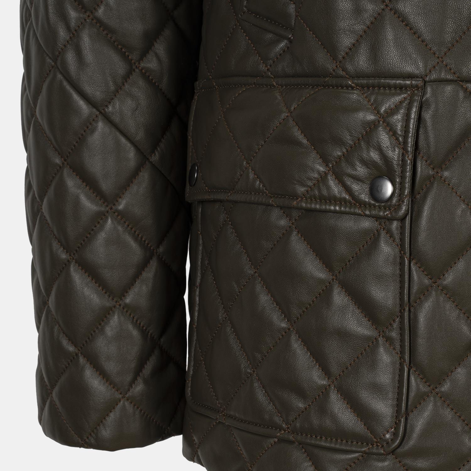 Erkek Yeşil Gömlek Yakalı Kapitoneli Deri Mont