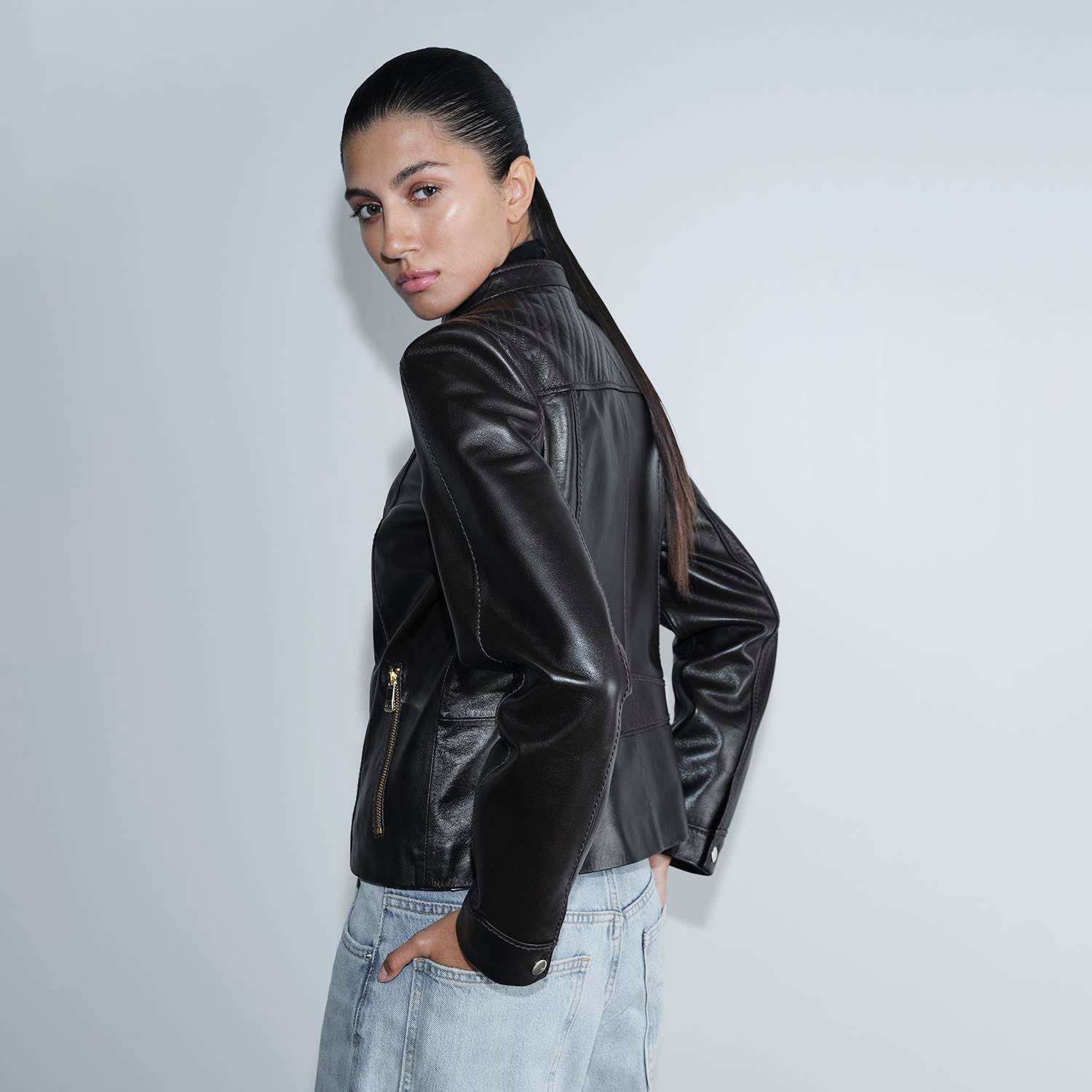 Kadın Siyah Hakim Yakalı Fit Deri Ceket