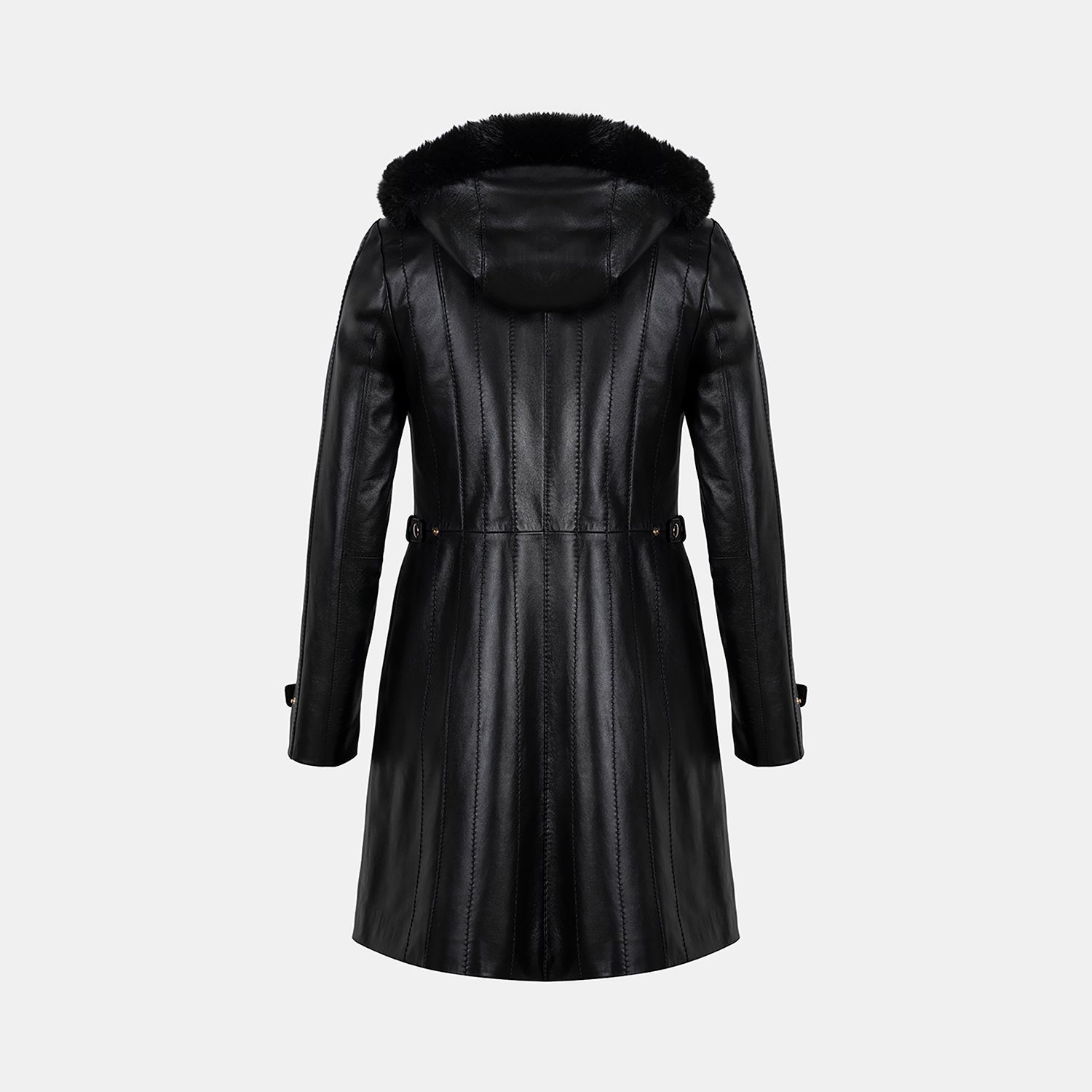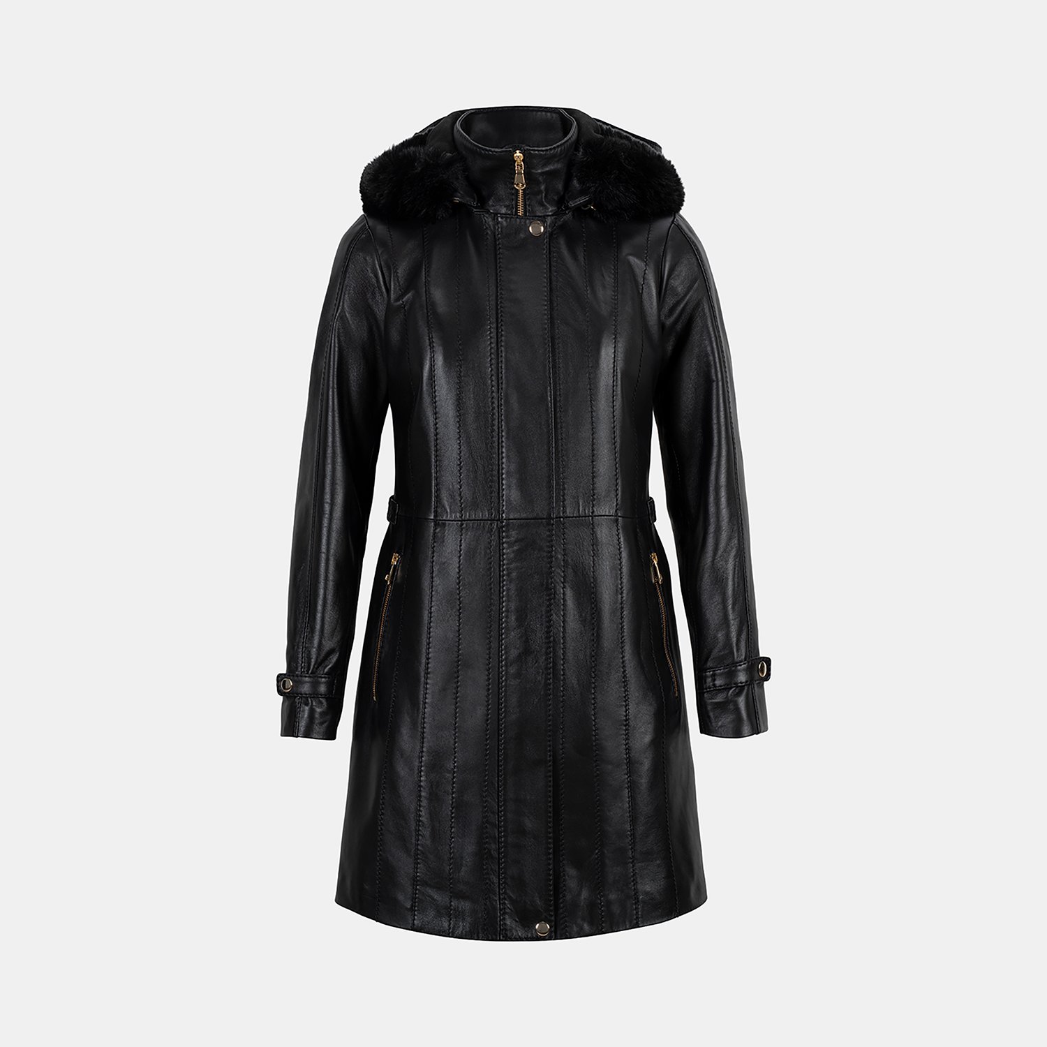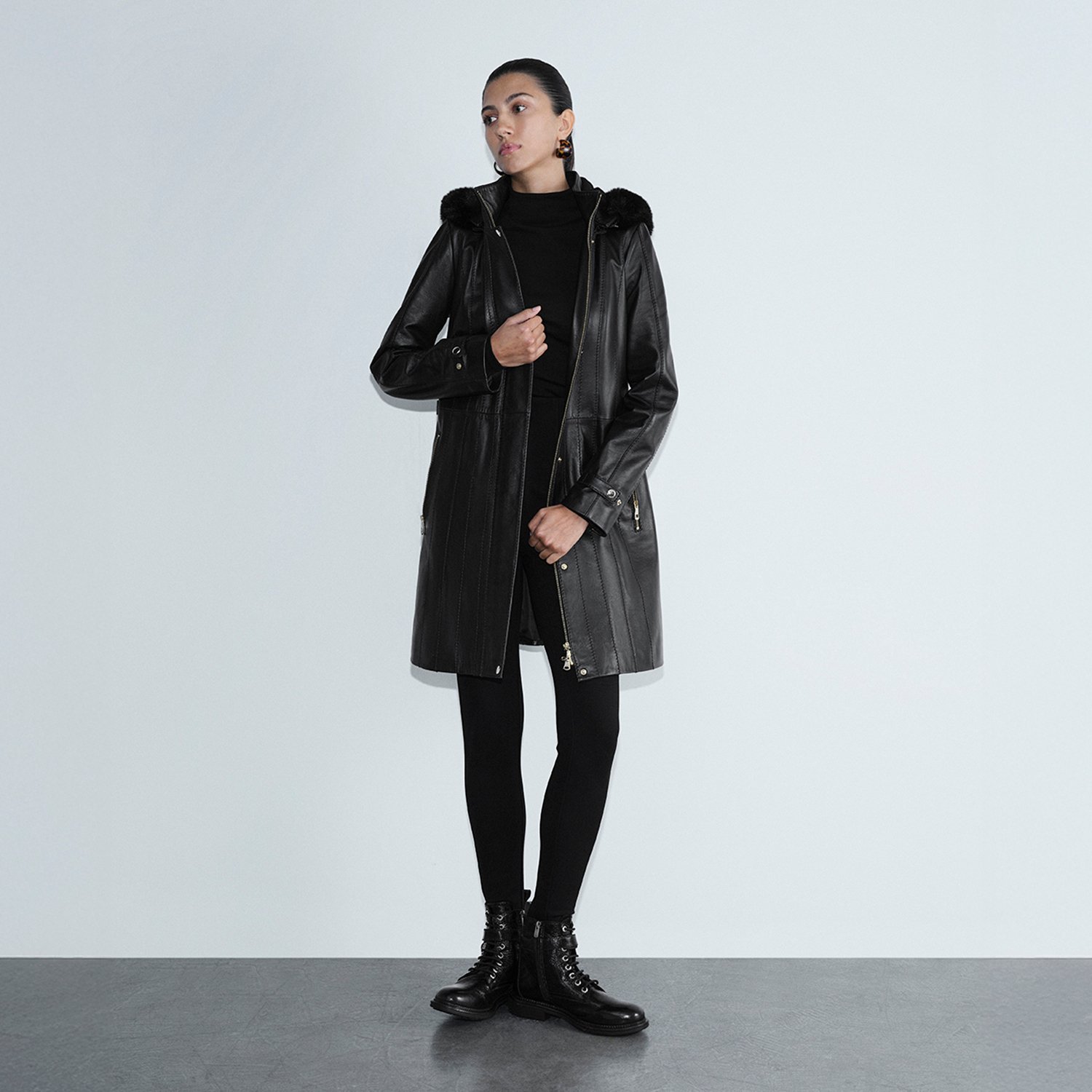 Kadın yüksek hakim yakalı ve çıkarılabilir kapişonlu deri kaban. Kapişonda imitasyon kürk detayı kullanılmıştır.