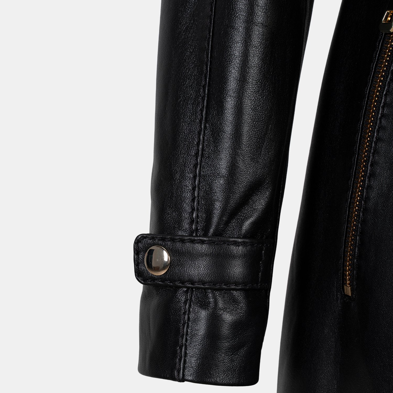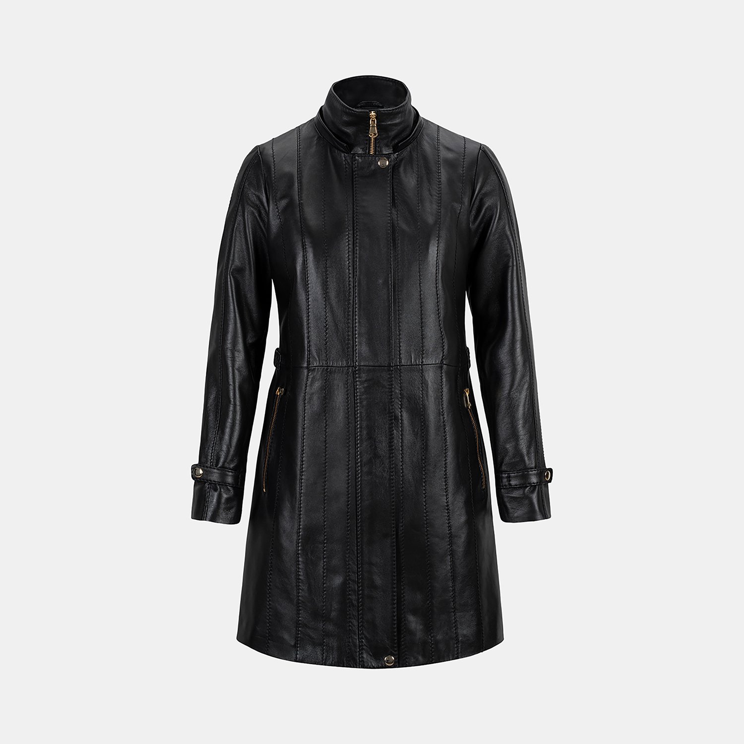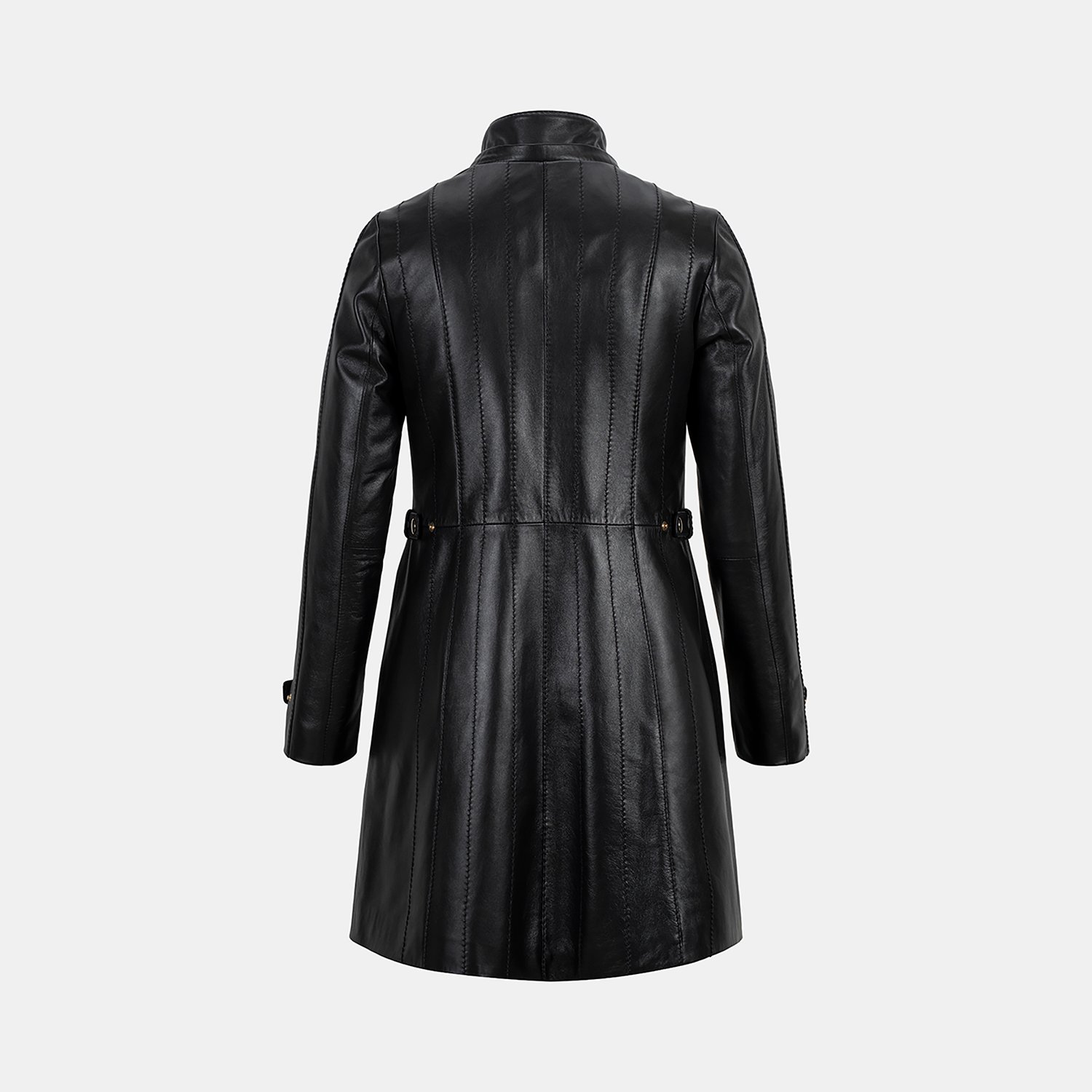 Kadın yüksek hakim yakalı ve çıkarılabilir kapişonlu deri kaban. Kapişonda imitasyon kürk detayı kullanılmıştır.