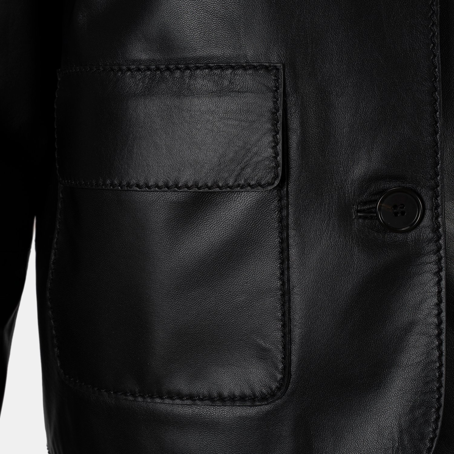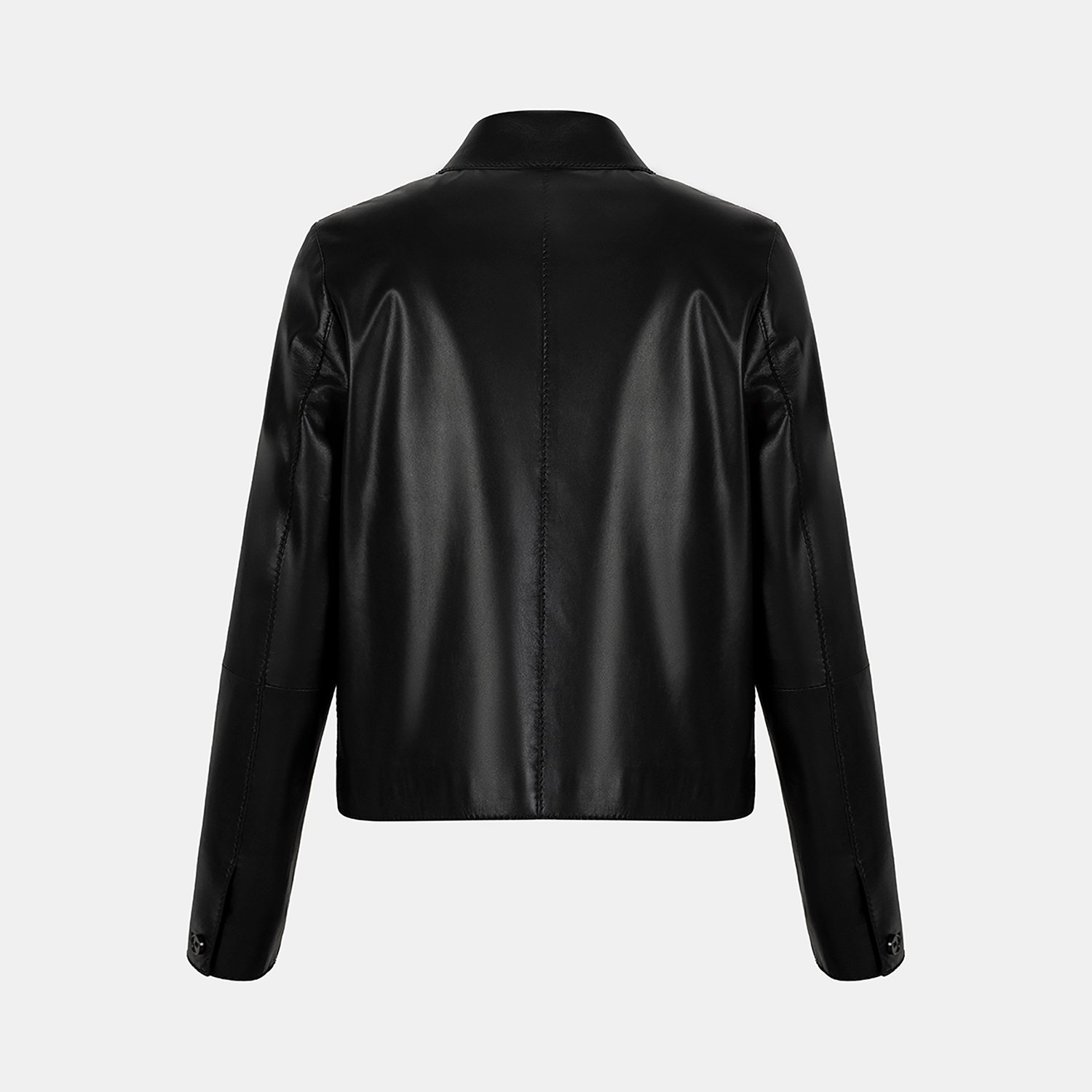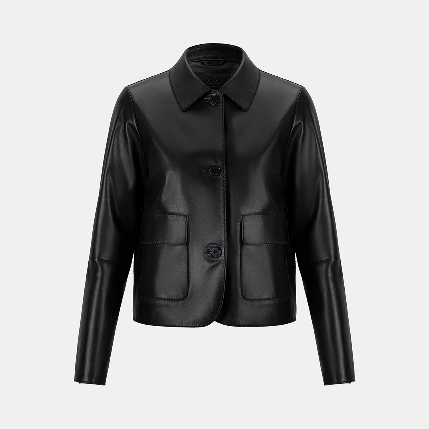 Gömlek yakalı, önden düğme kapamalı deri kısa ceket.