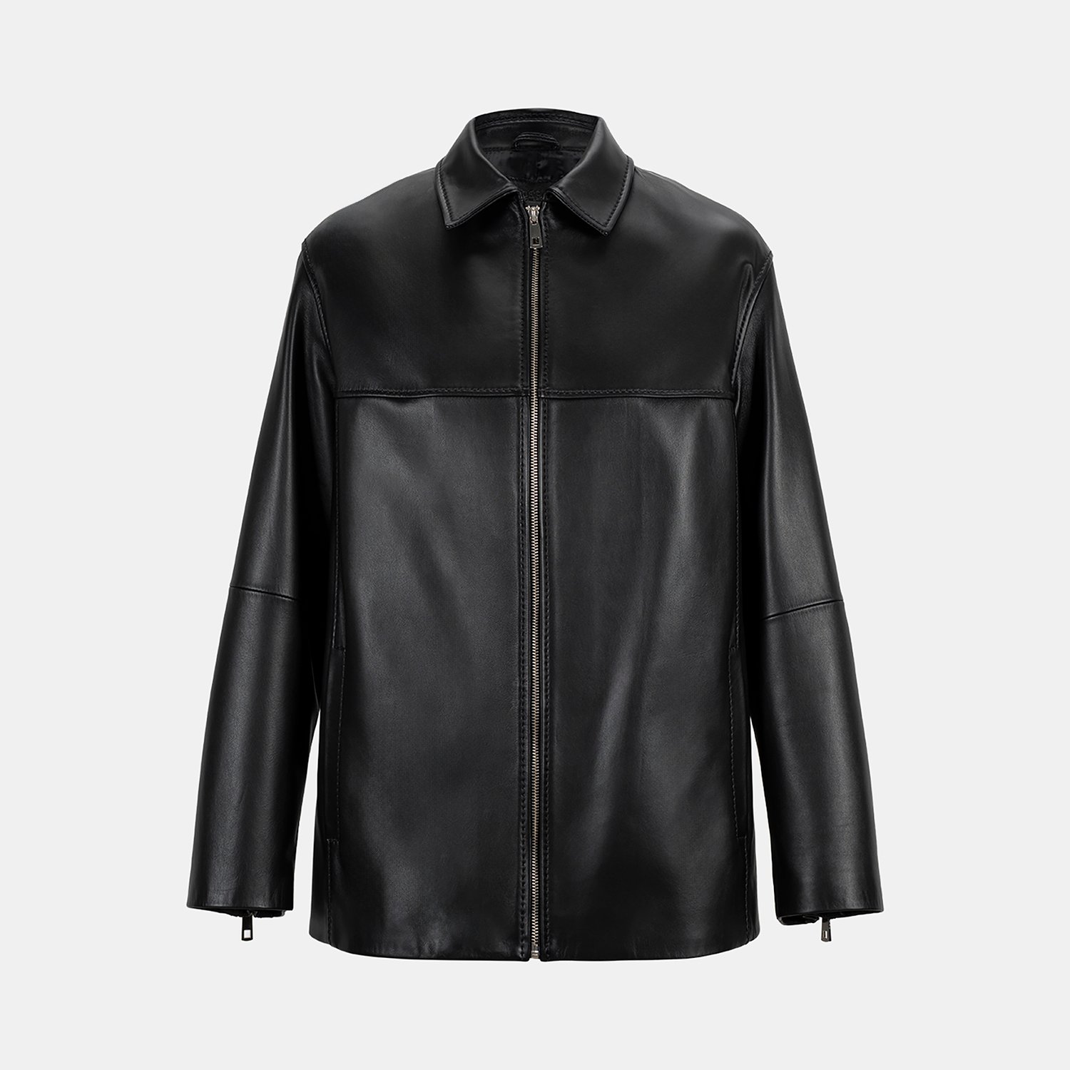 Kadın gömlek yakalı deri ceket, önden fermuar kapamalıdır.