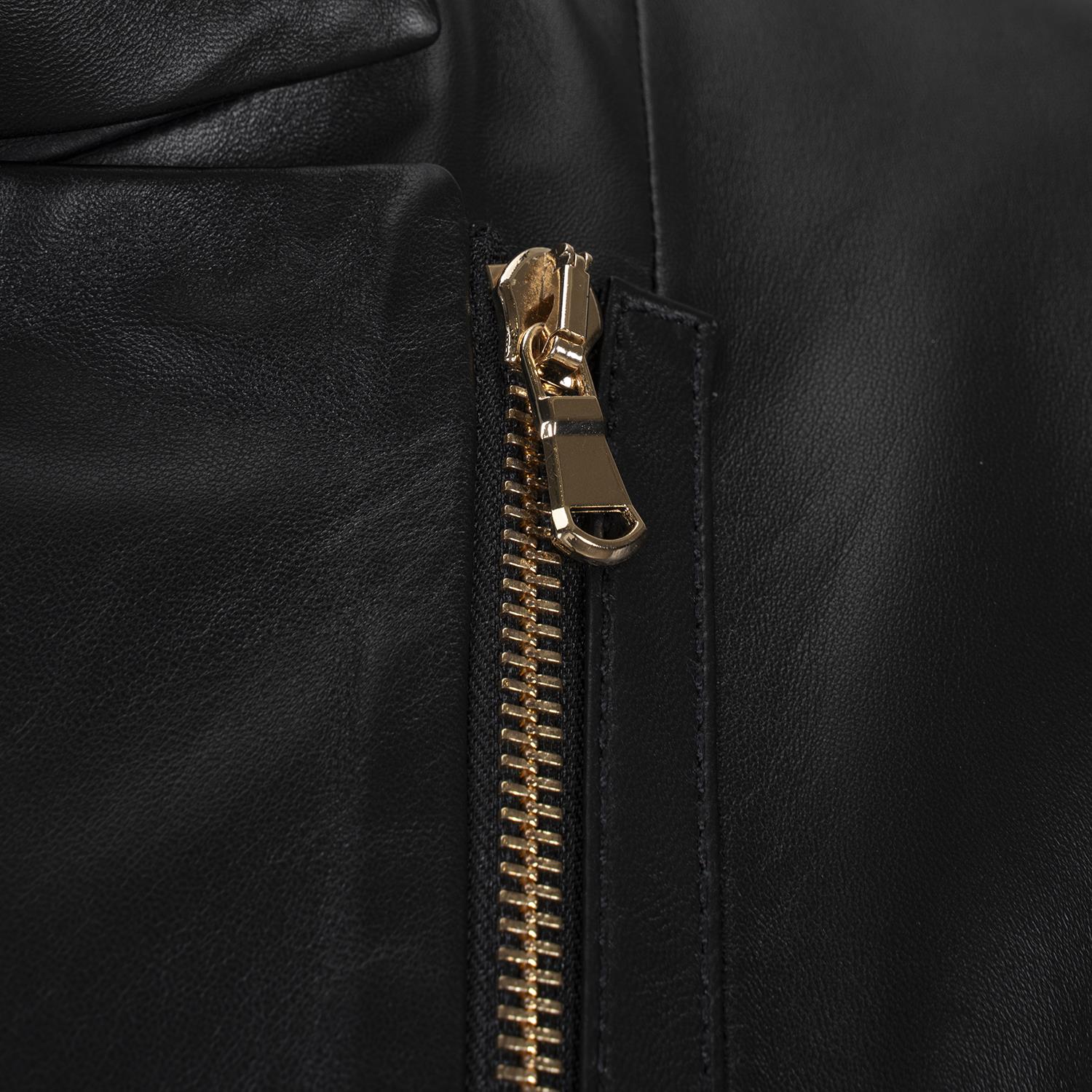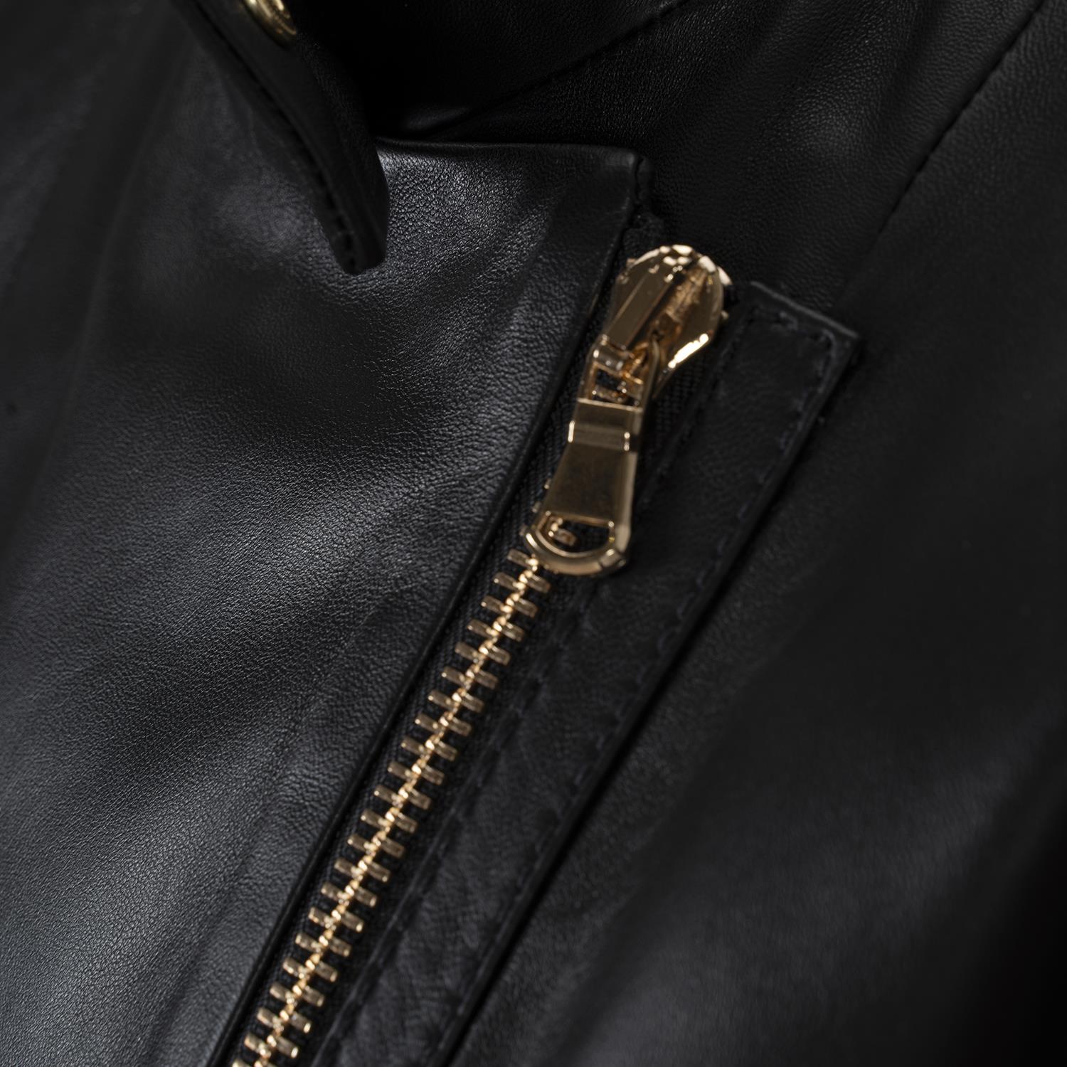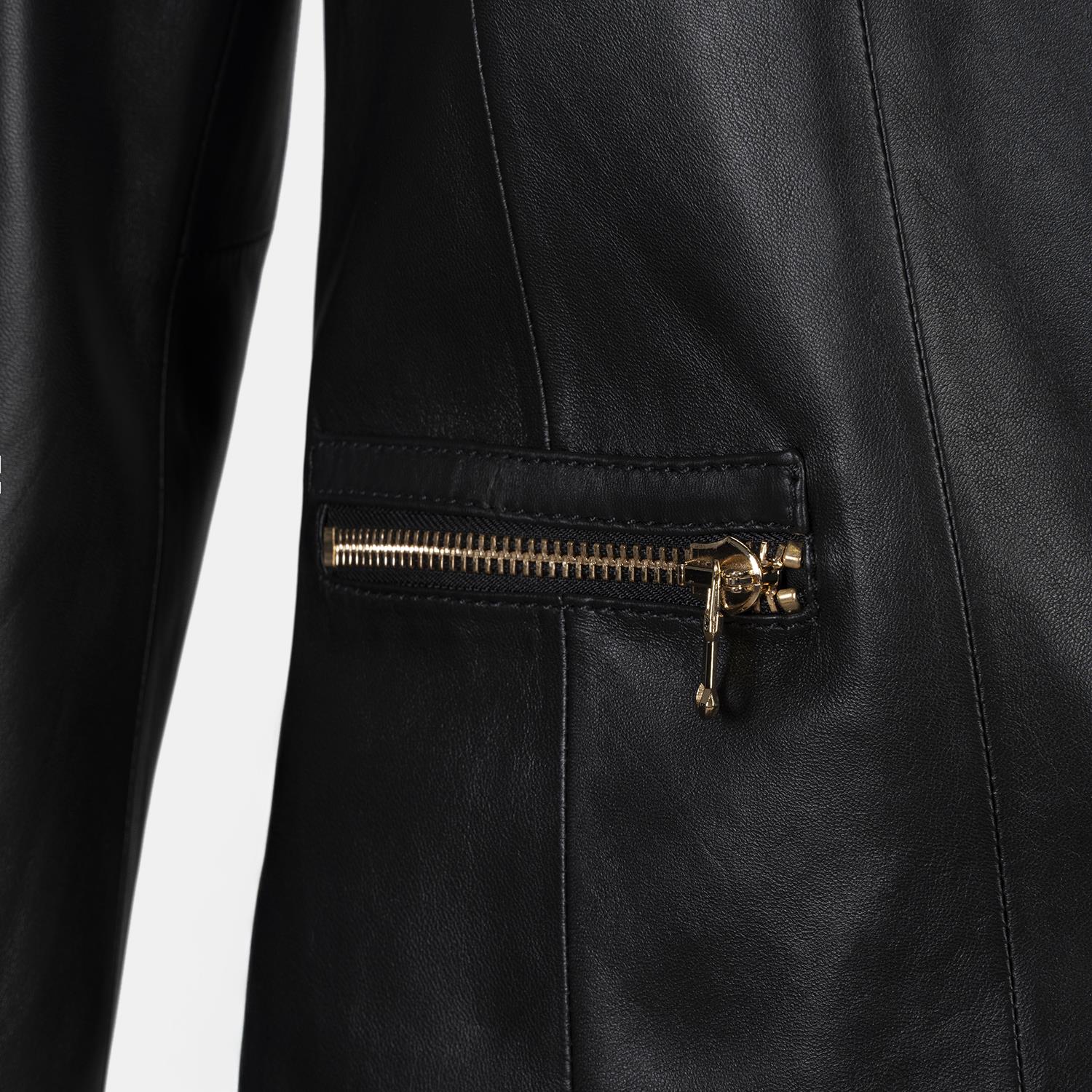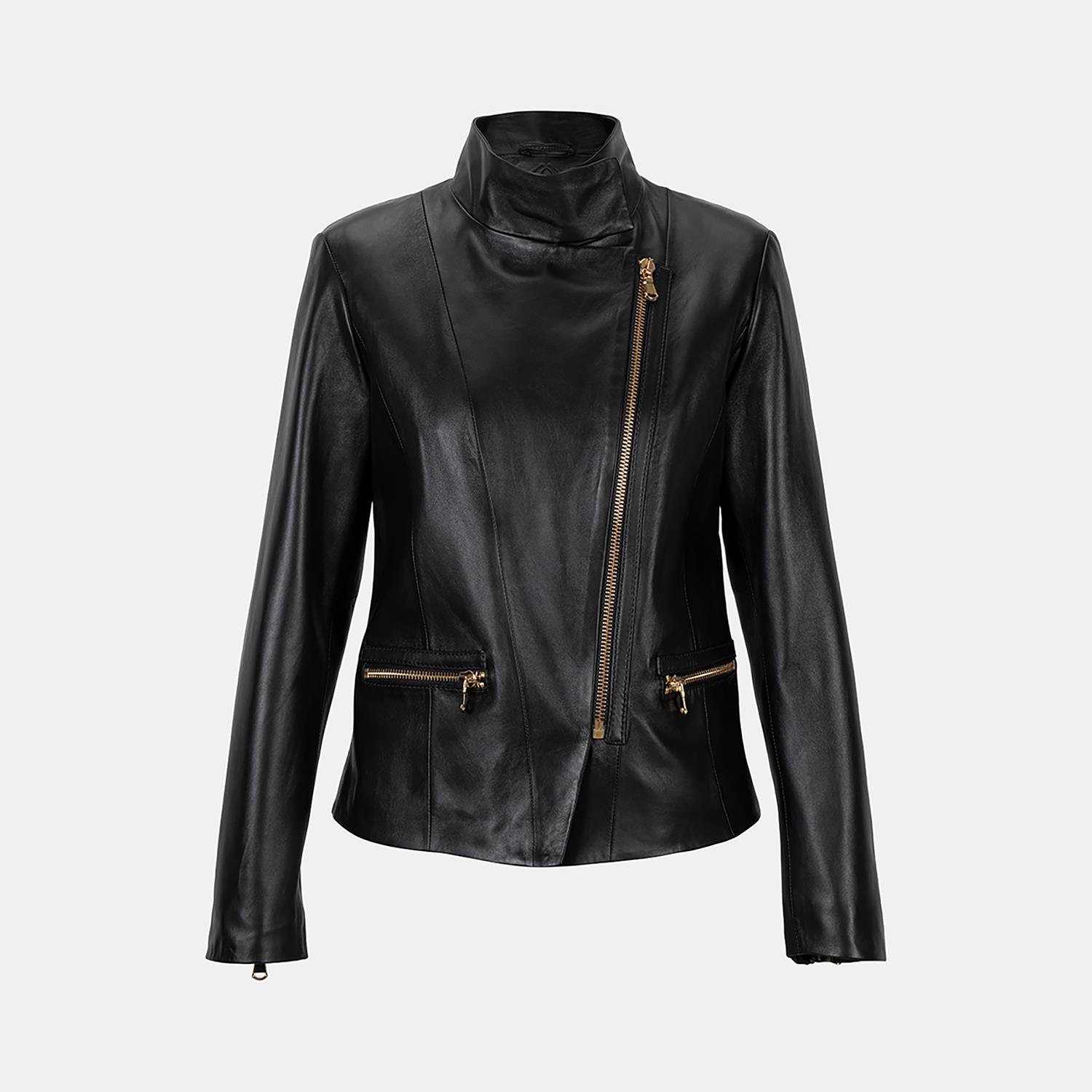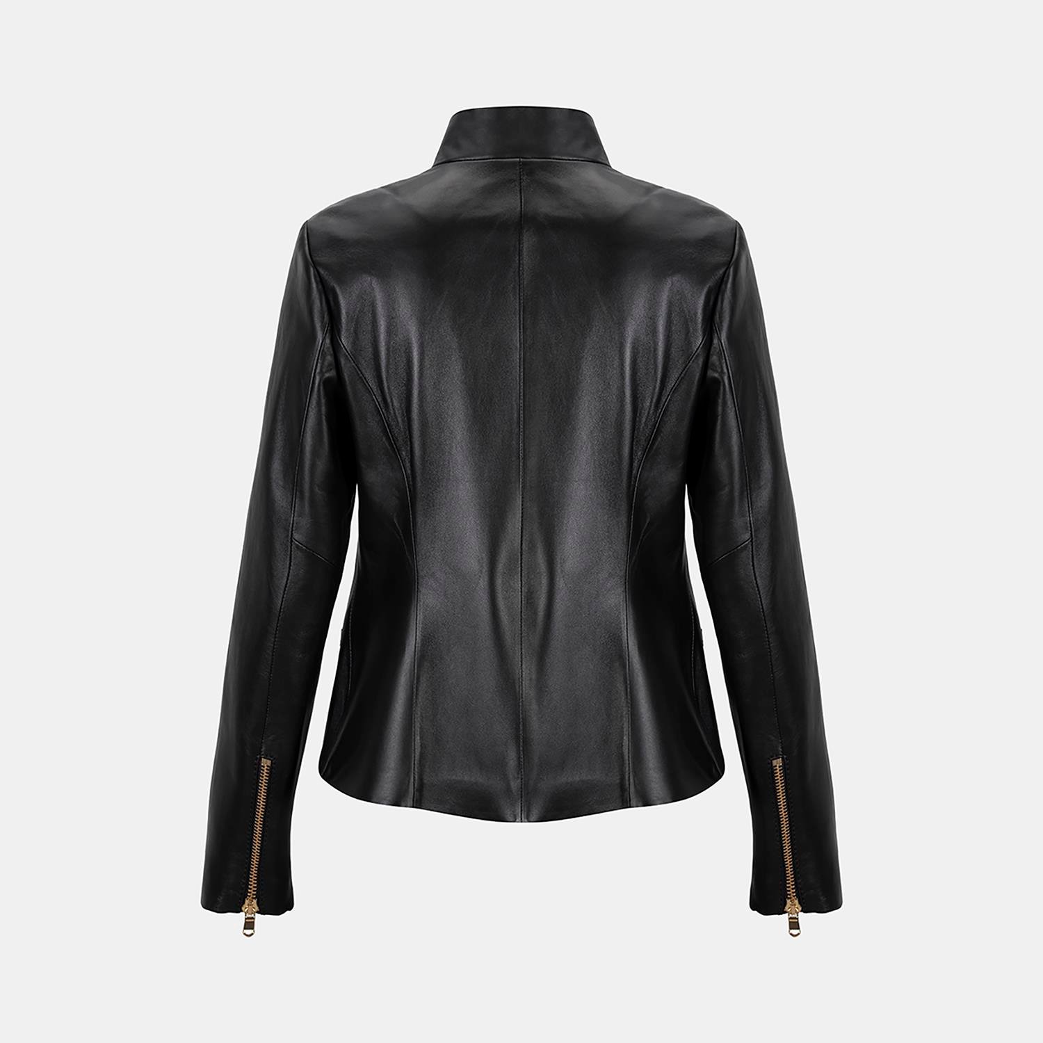 Yüksek hakim yakalı kadın fit deri cekettir.