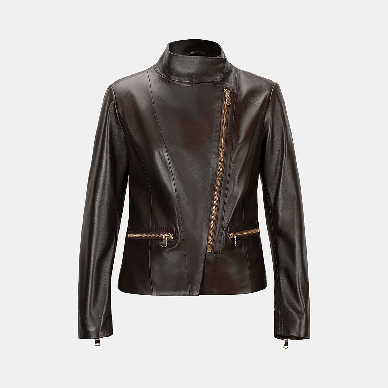 Yüksek hakim yakalı kadın fit deri cekettir.