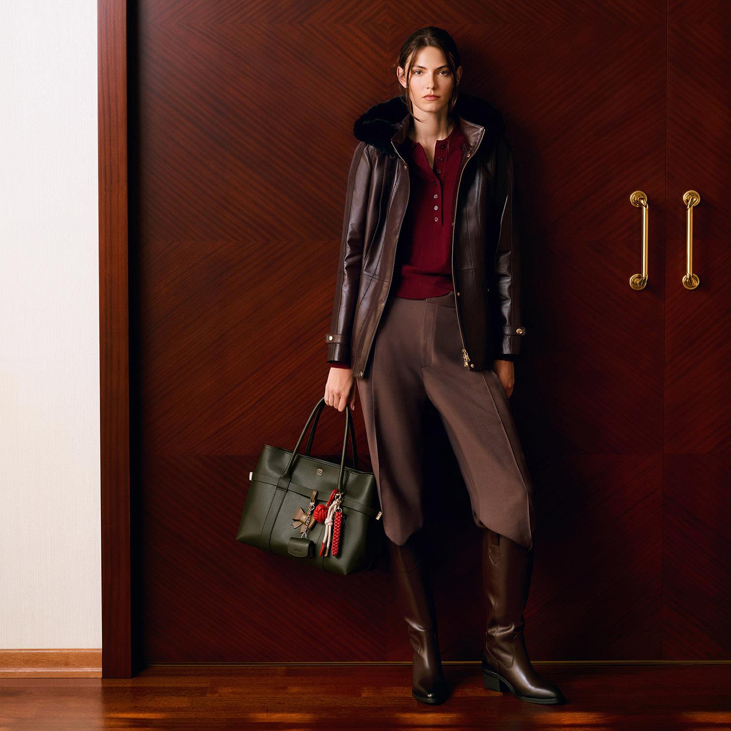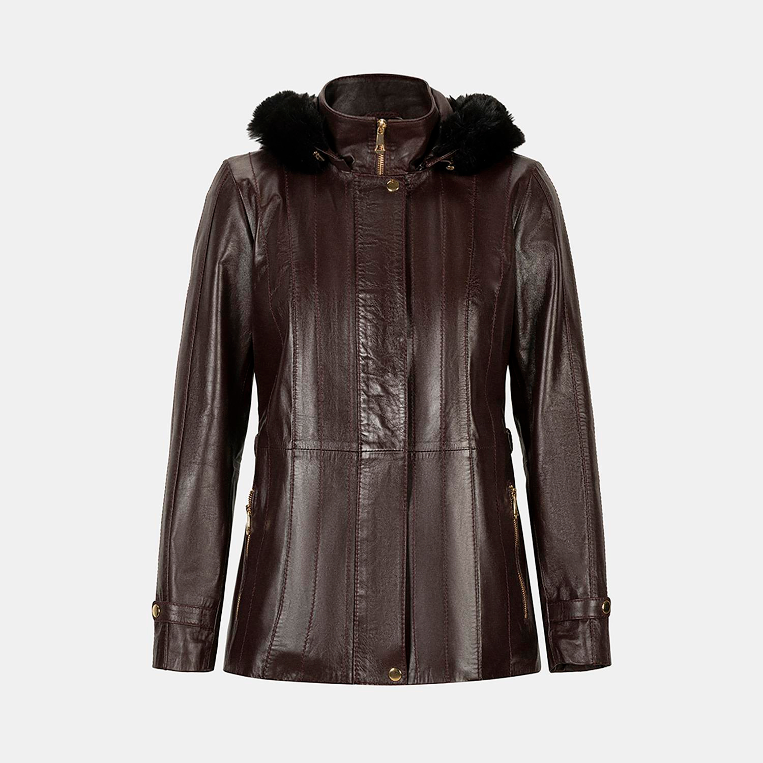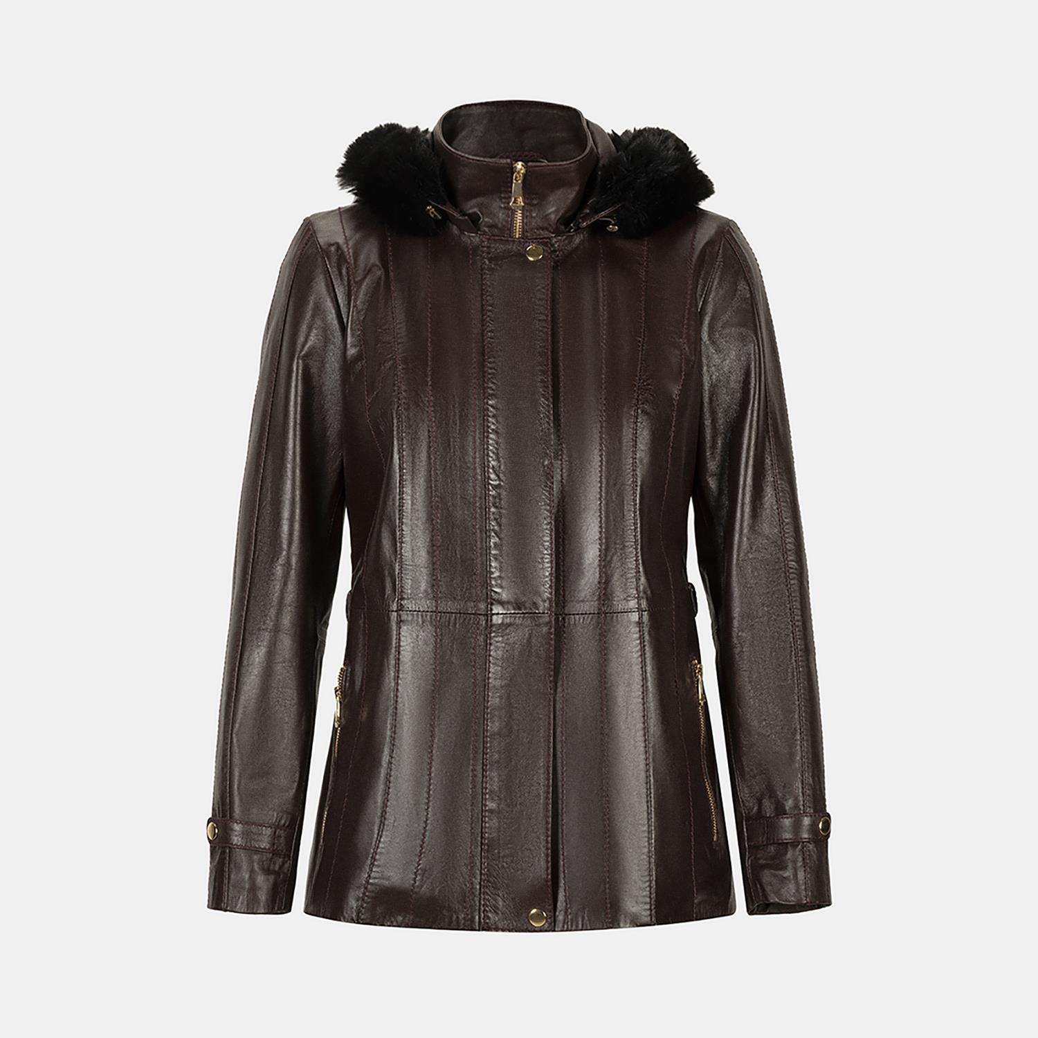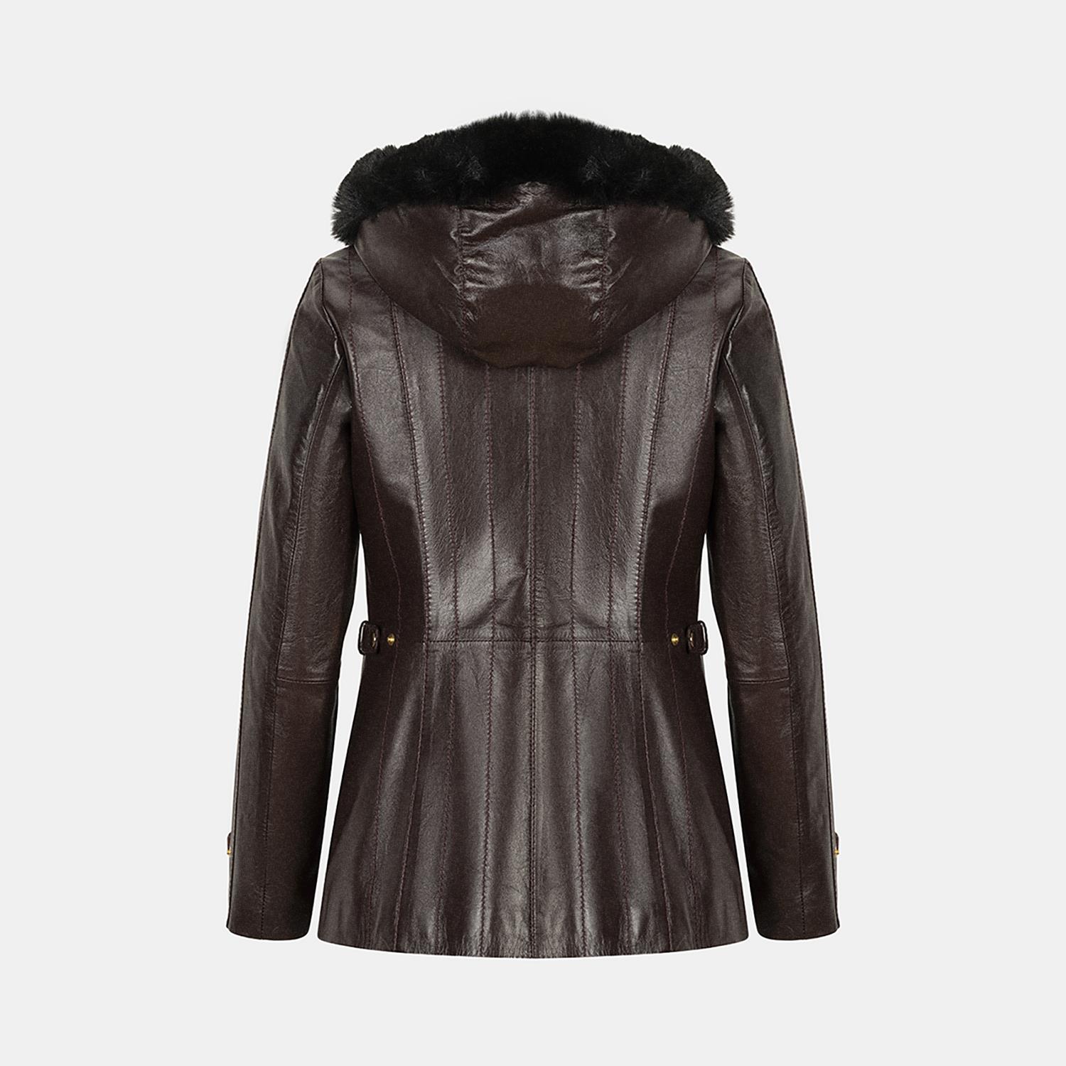 Kadın yüksek hakim yakalı ve çıkarılabilir kapişonlu deri ceket. Kapişonda kürk görünümlü detay kullanılmıştır.