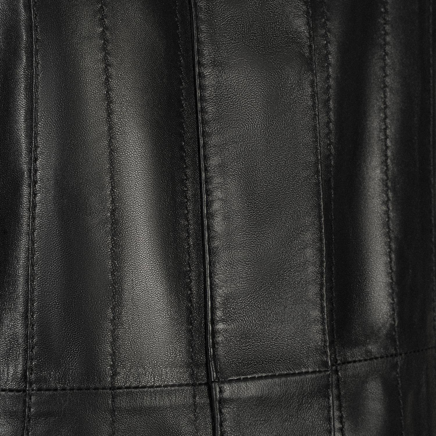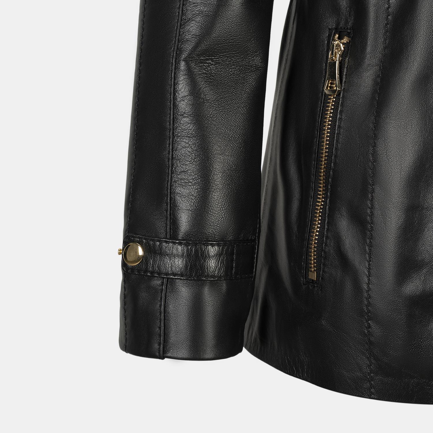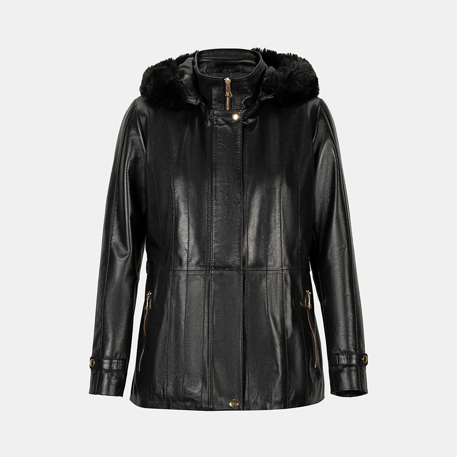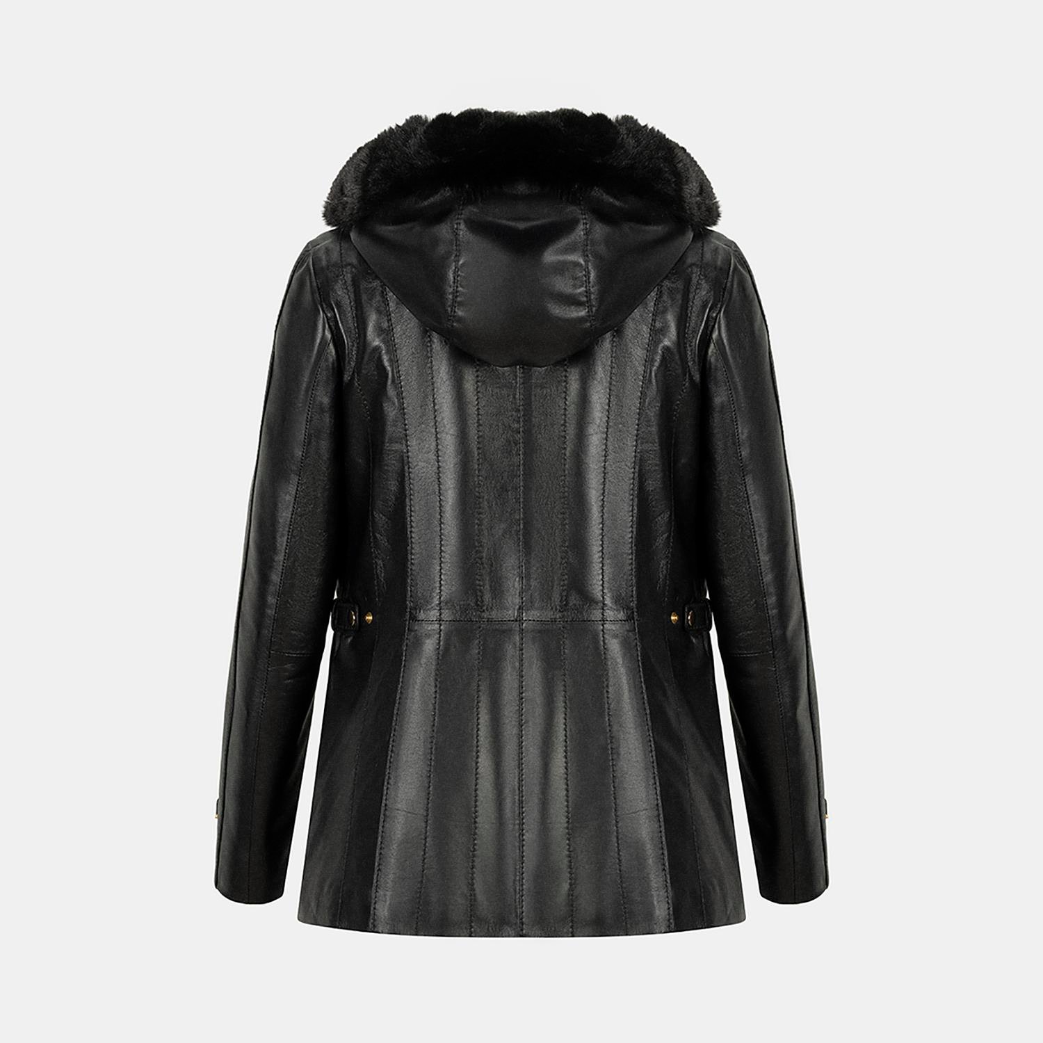 Kadın yüksek hakim yakalı ve çıkarılabilir kapişonlu deri ceket. Kapişonda kürk görünümlü detay kullanılmıştır.