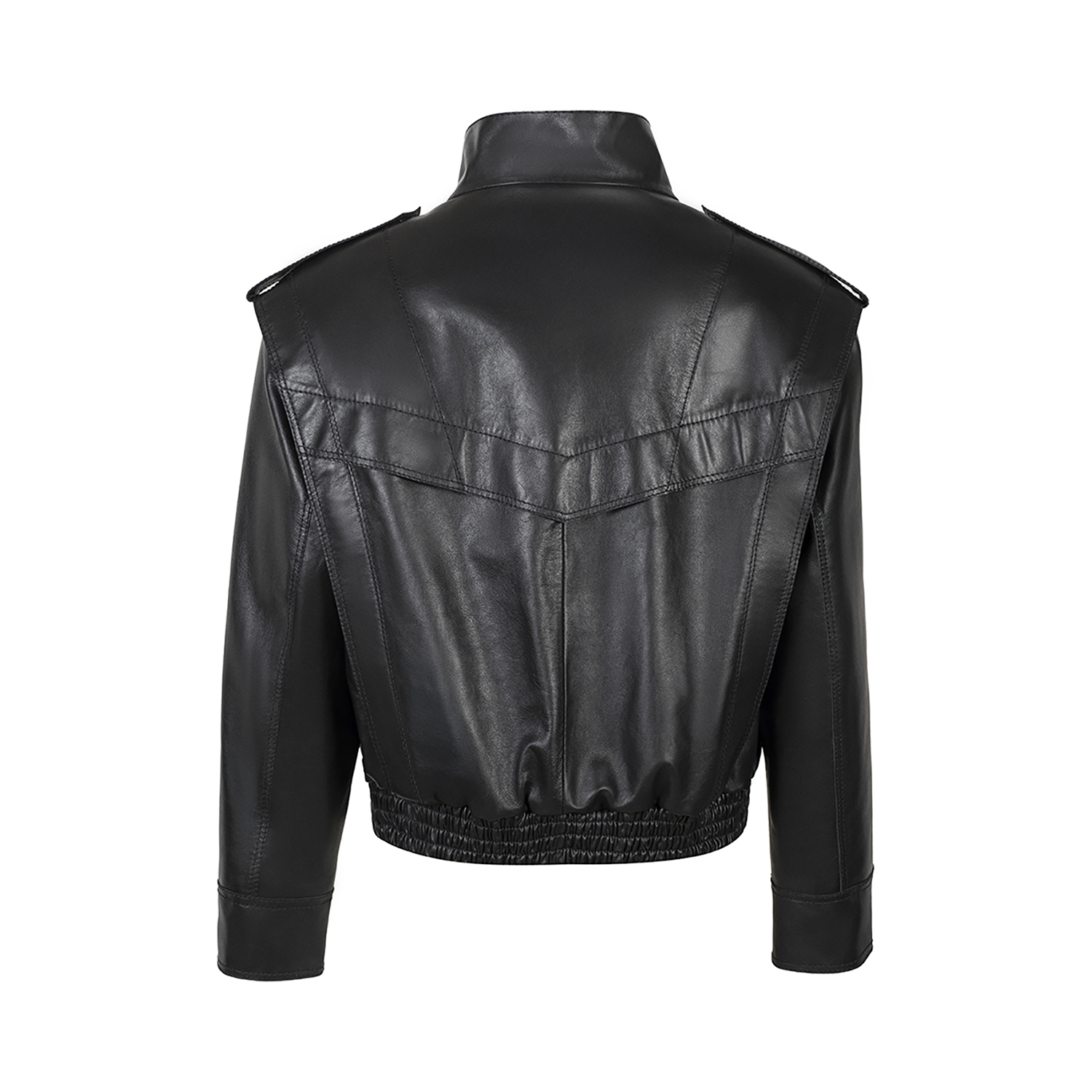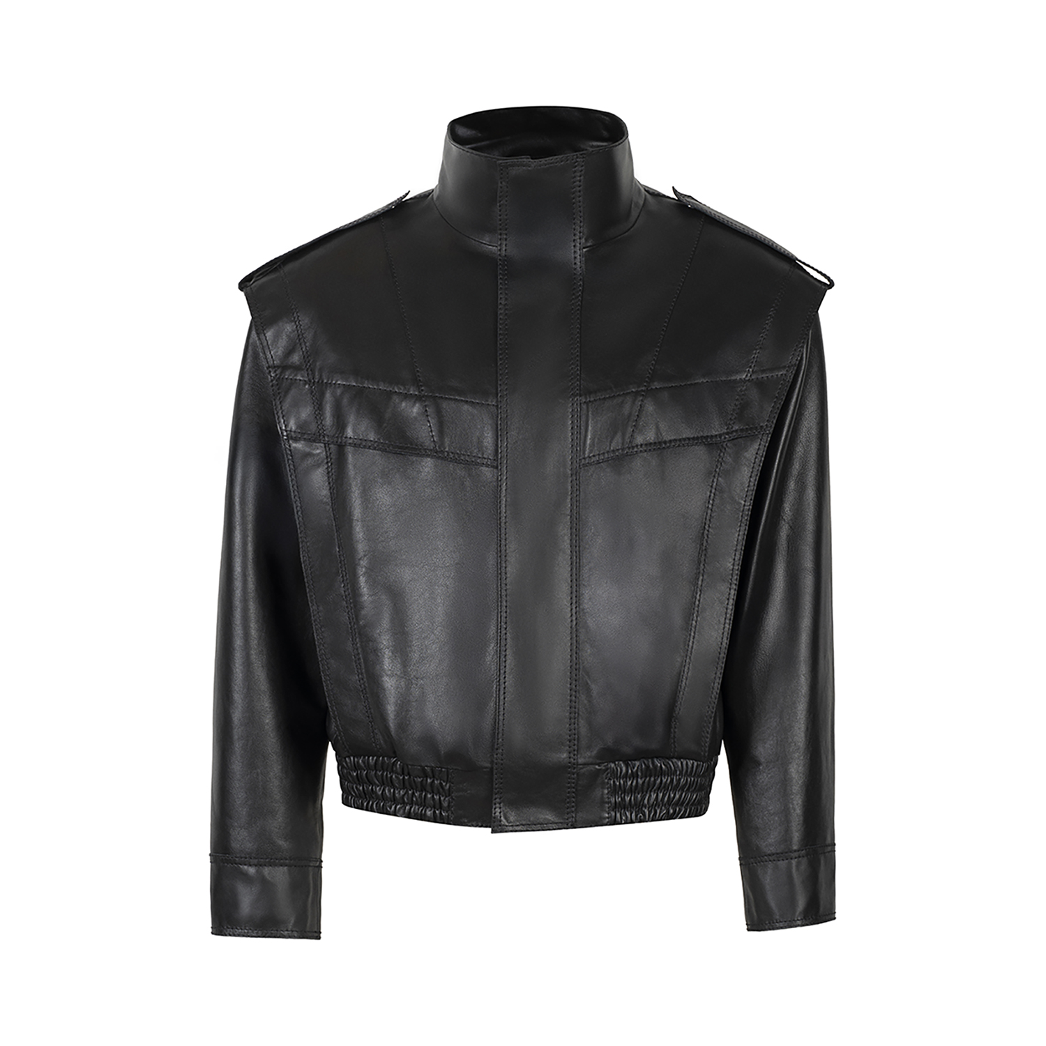 Dik yaka, omuz apoletleri, körük detayları ve elastik bel kemeriyle güçlü bir siluet sunar.