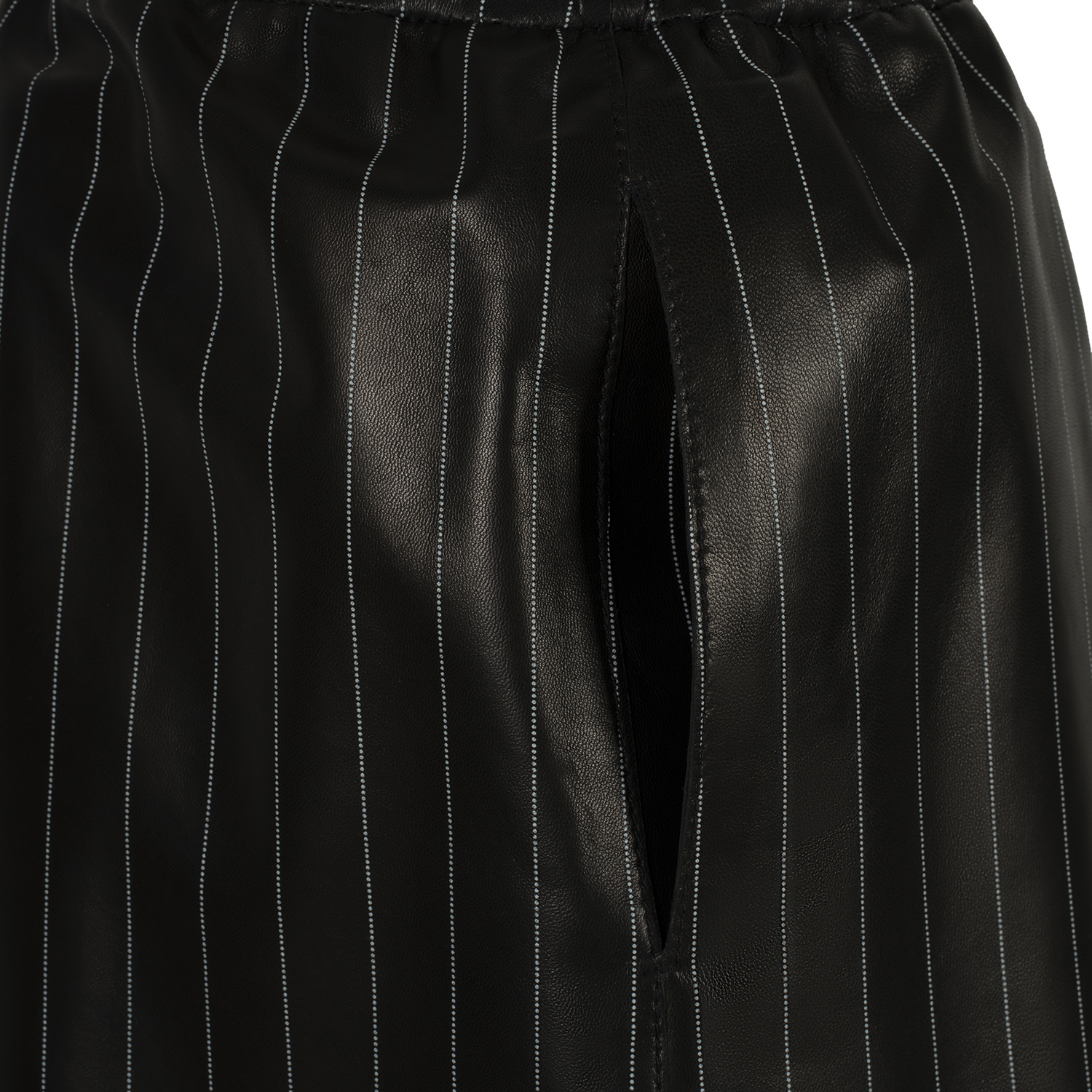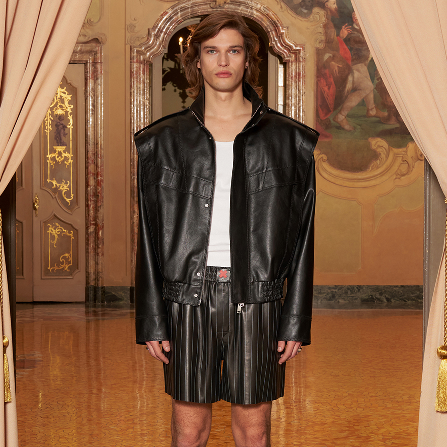 Deri yüzey üzerine uygulanan ince çizgili desen, maskülen bir yapı ile modern bir özgürlük hissini bir araya getirir.
