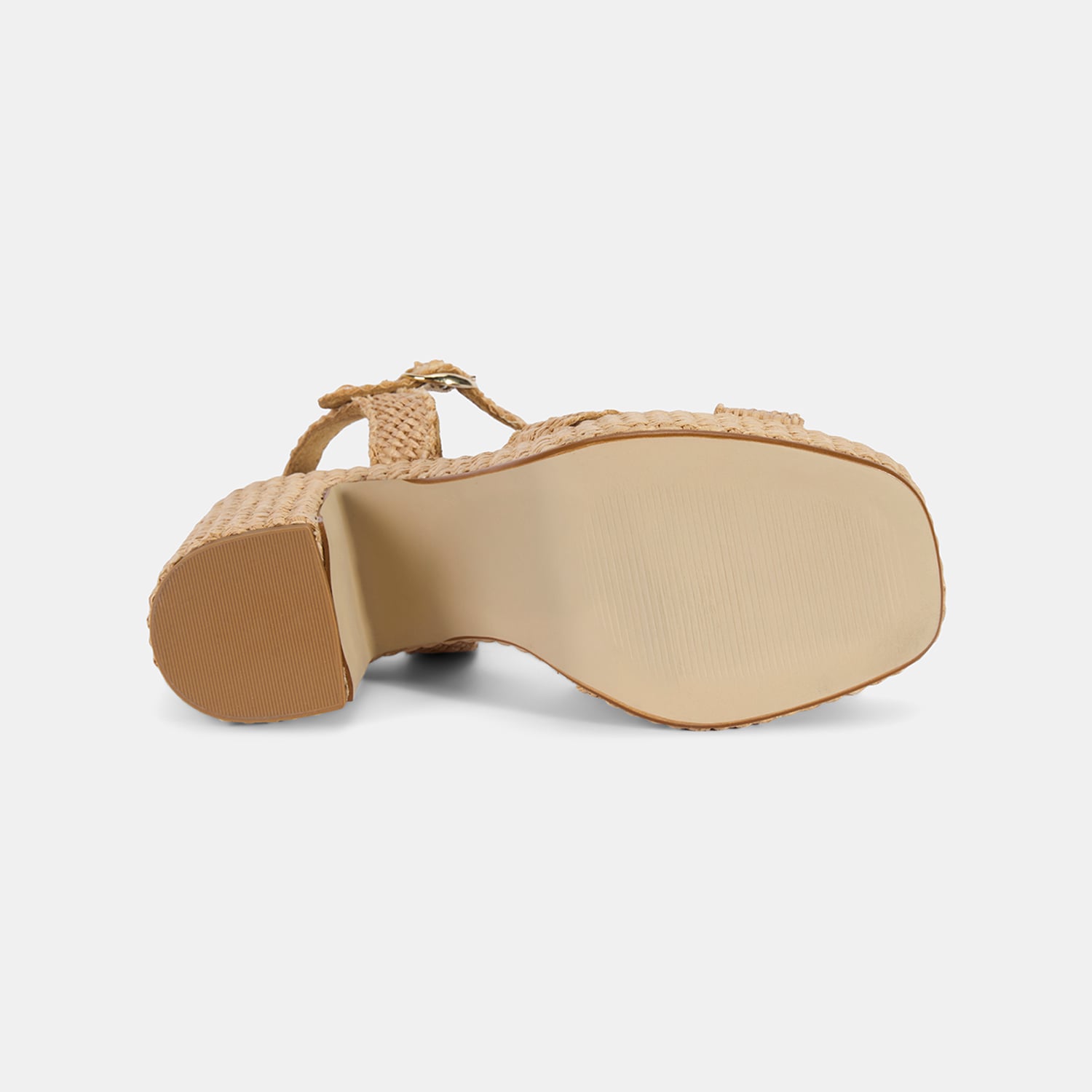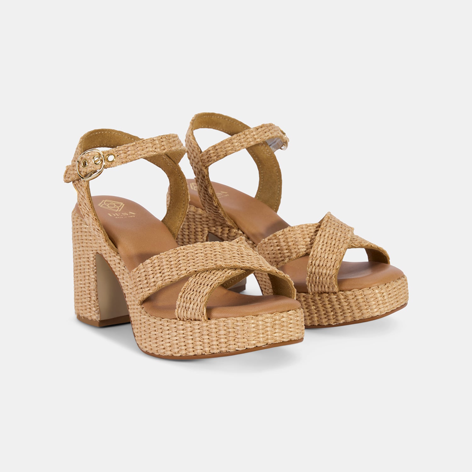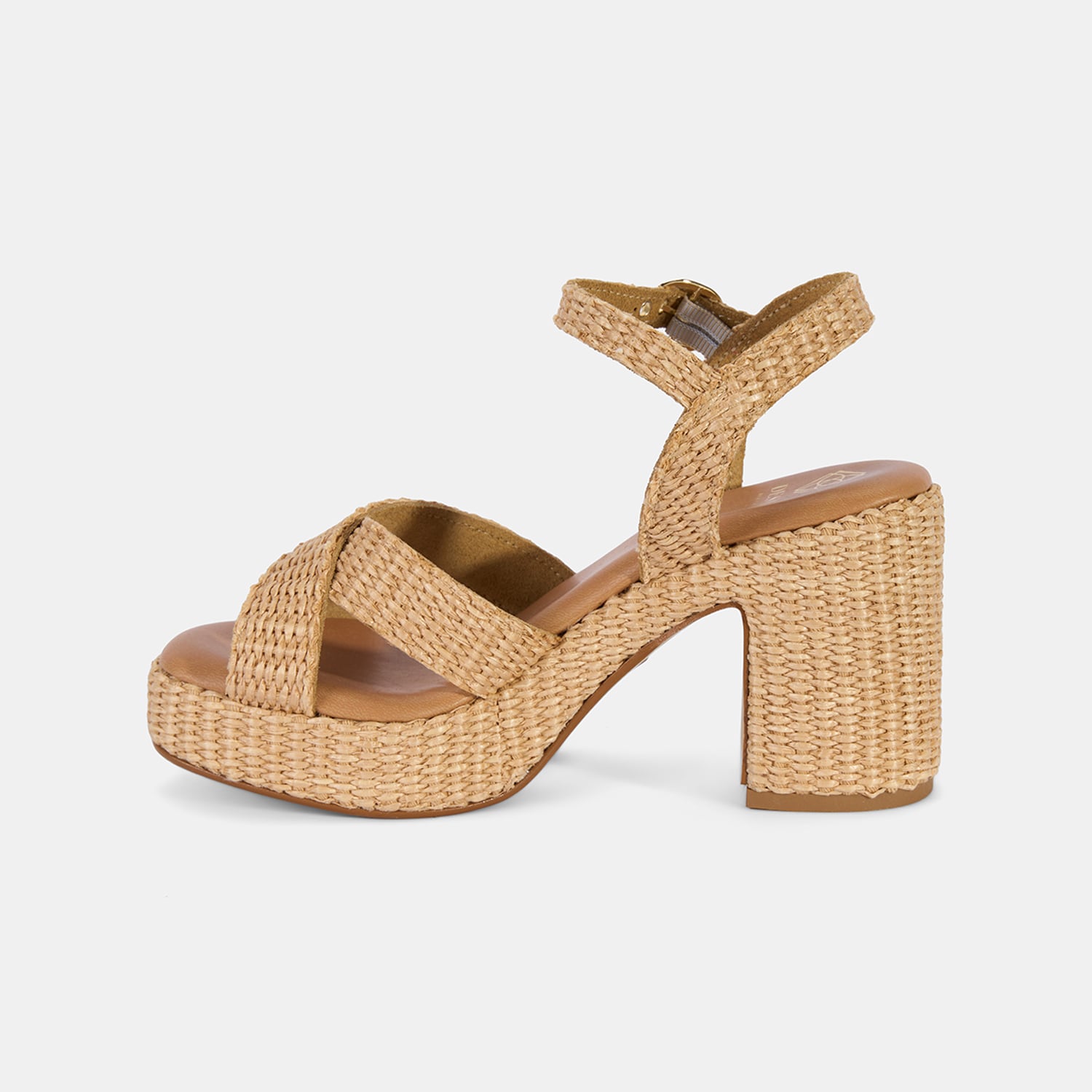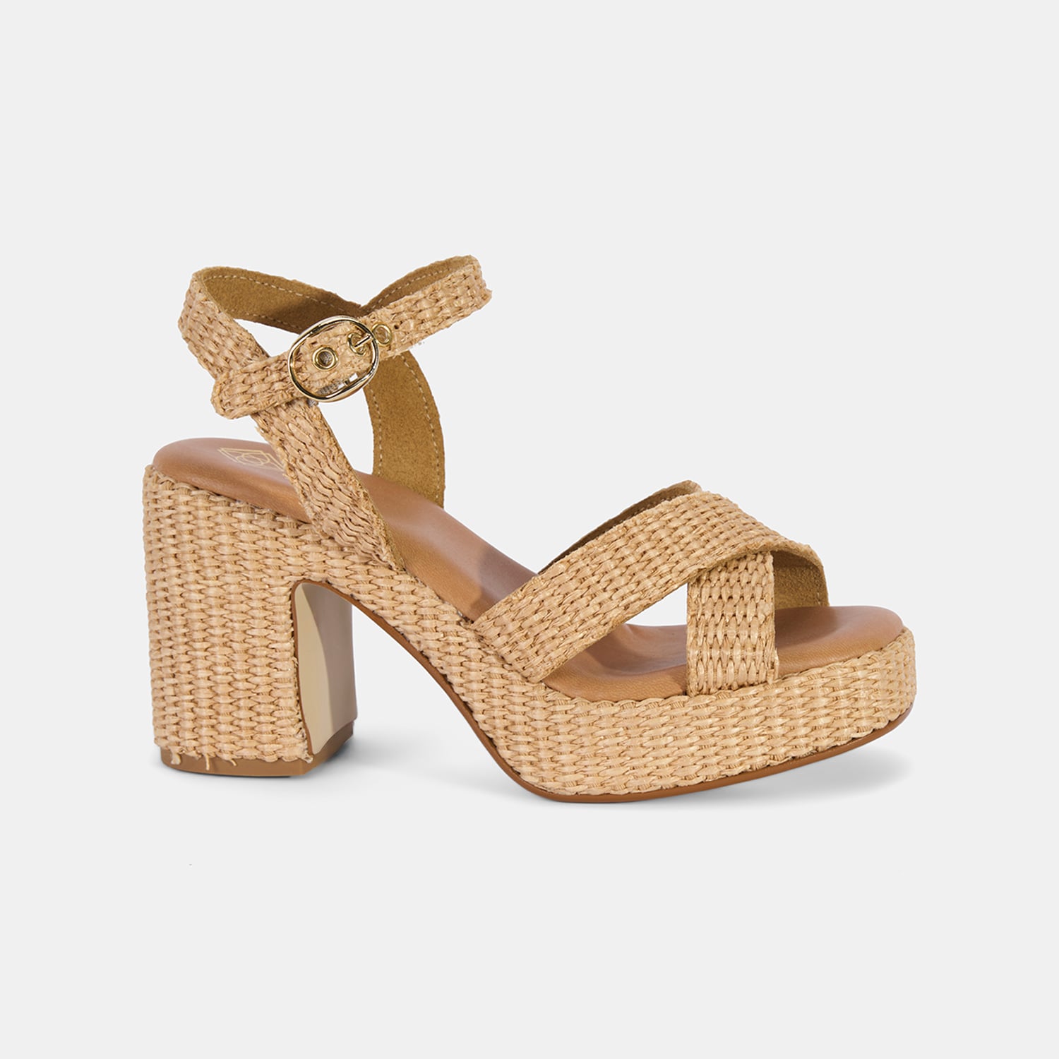 Hafif ve doğal dokusu ile öne çıkan kadın sandalet, yüksek platform formu ile zarif bir duruş sağlar