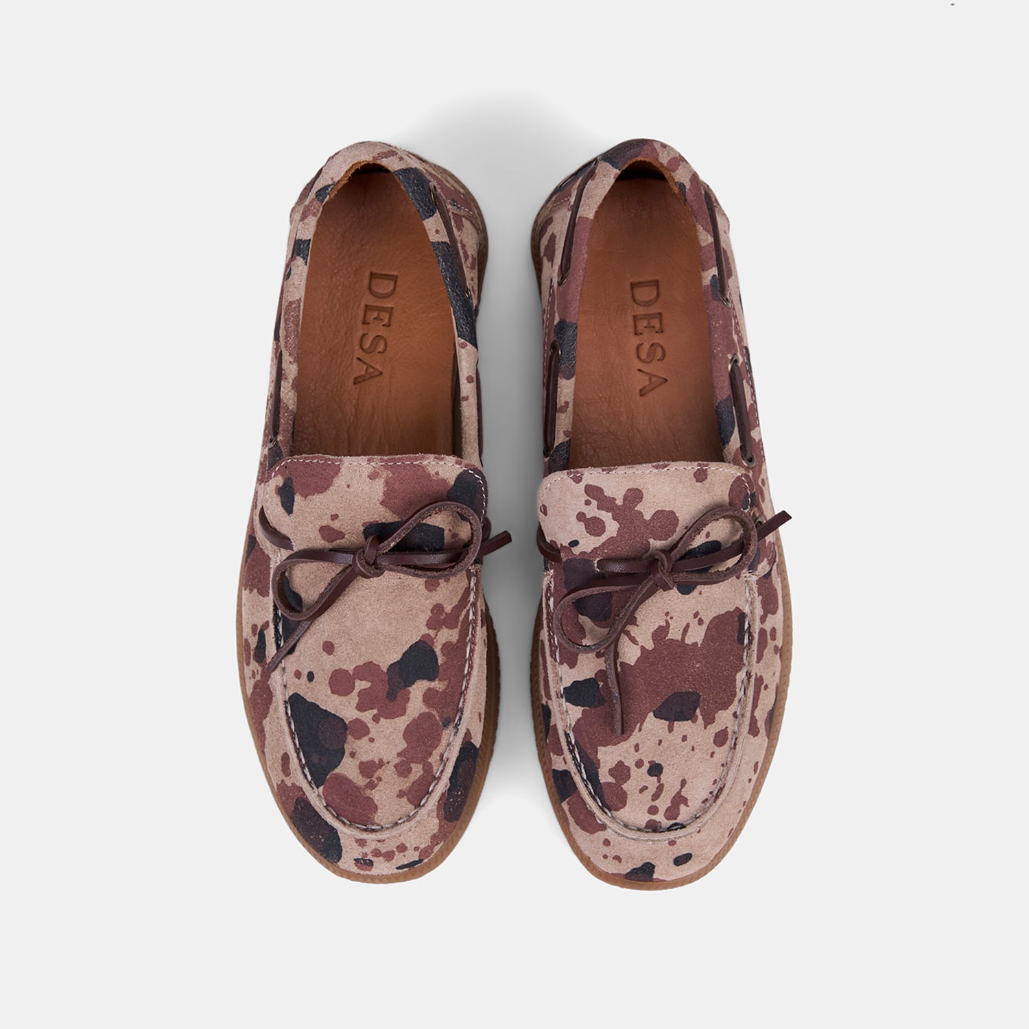 Renkli baskılı süet yüzeyiyle öne çıkan kadın loafer, modern ve enerjik tasarımıyla günlük stile canlı bir dokunuş kazandırır.
