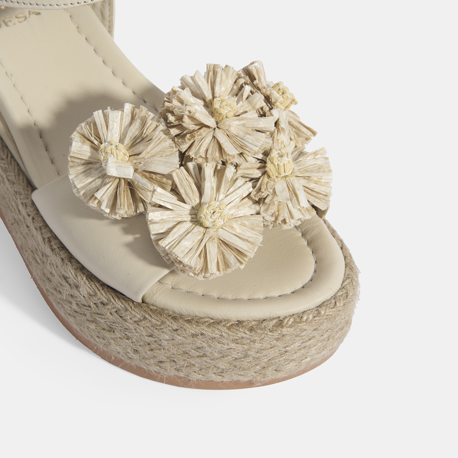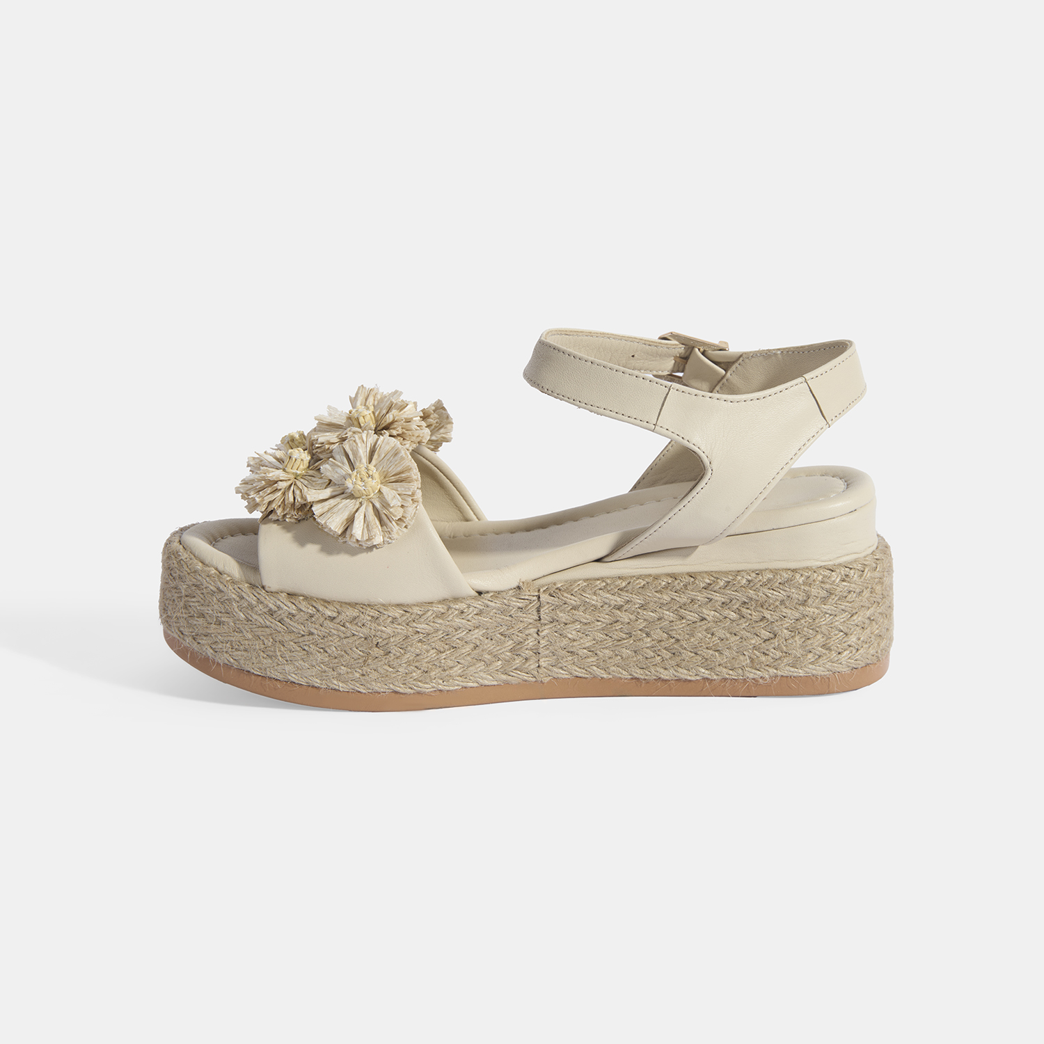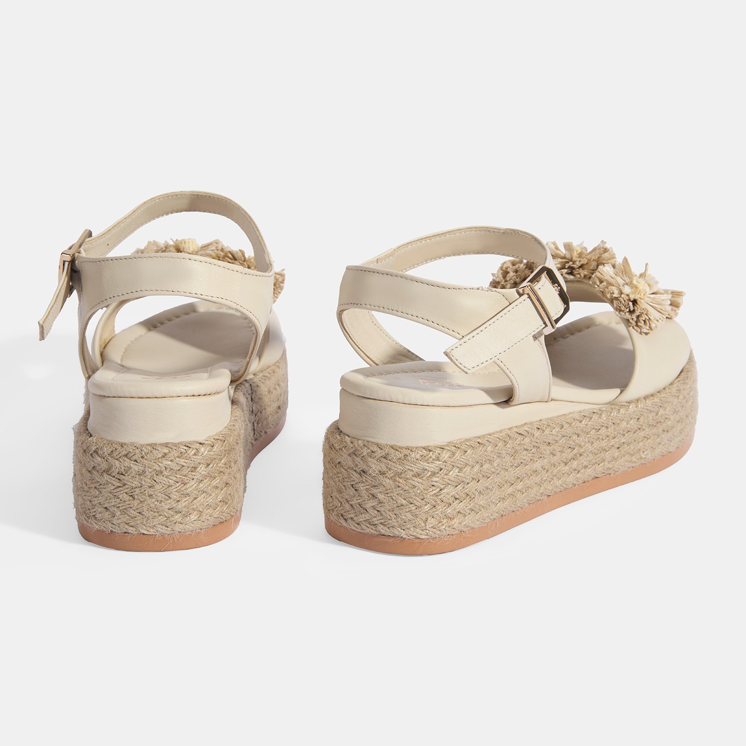 %100 deri, deri iç tabanlı, deri astarlı, rafya çiçek detaylı, ayarlanabilir metal tokalı, jüt sargılı pu tabanlı, kadın dolgu topuk sandalet.