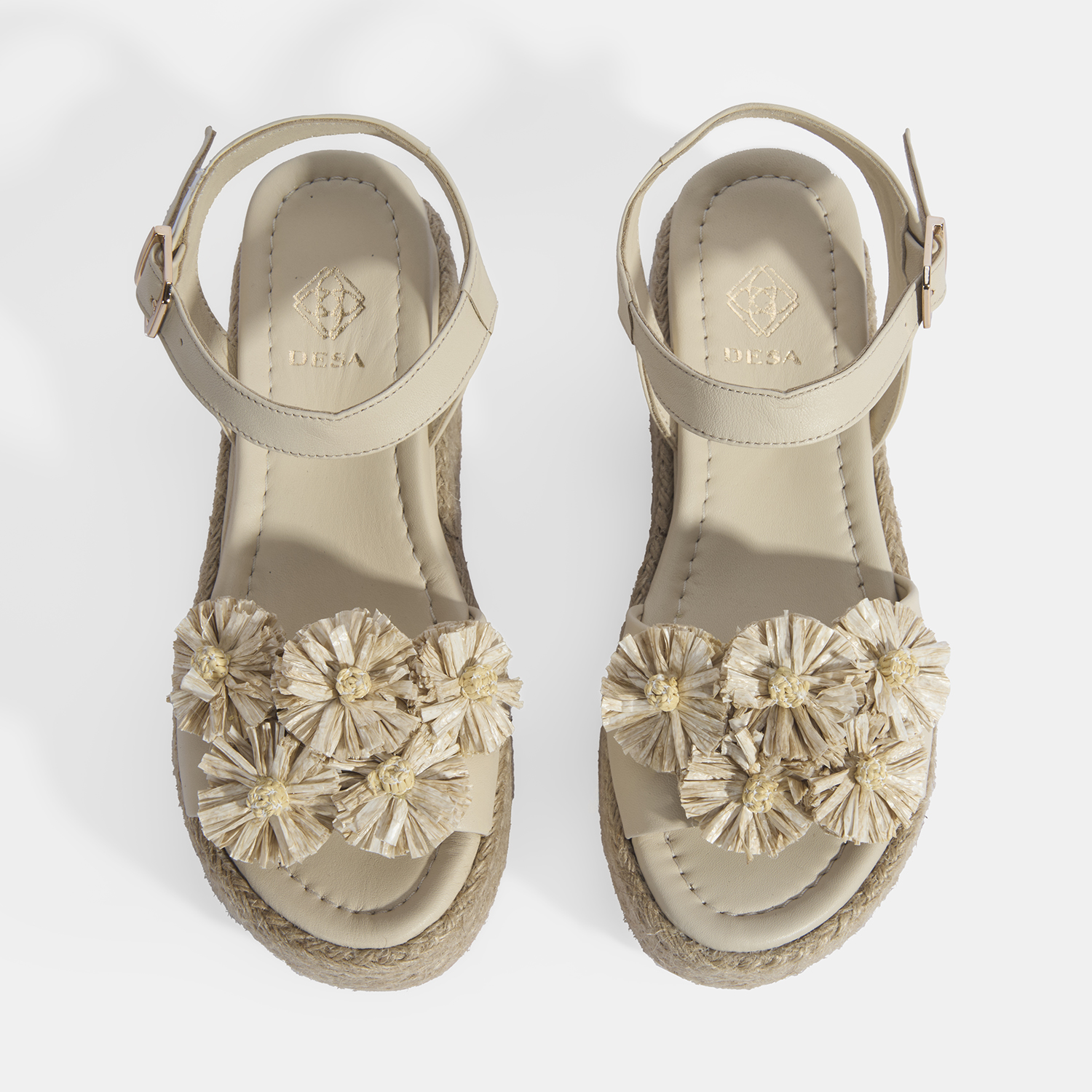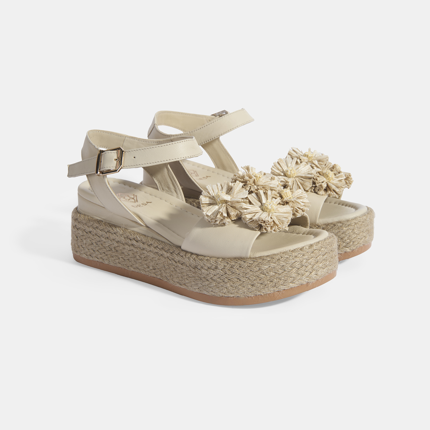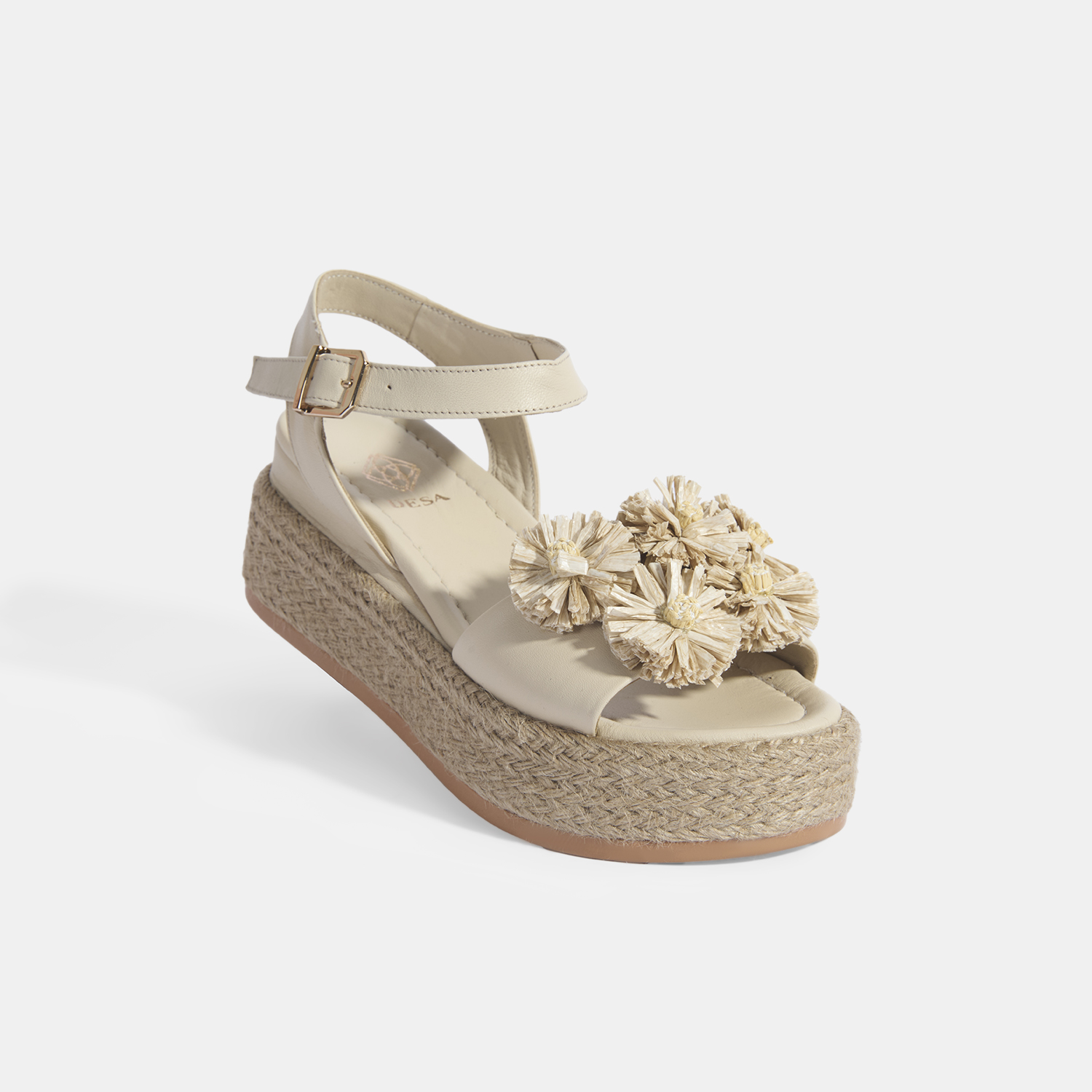 %100 deri, deri iç tabanlı, deri astarlı, rafya çiçek detaylı, ayarlanabilir metal tokalı, jüt sargılı pu tabanlı, kadın dolgu topuk sandalet.