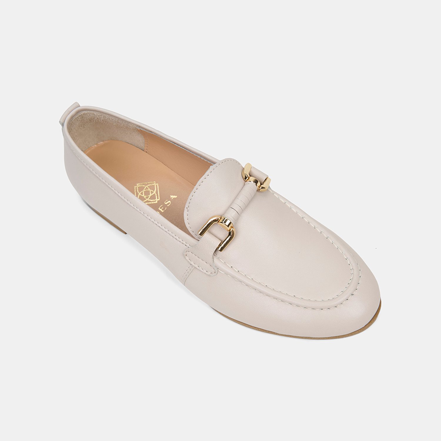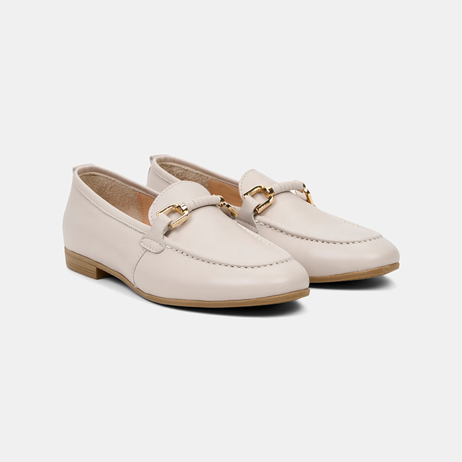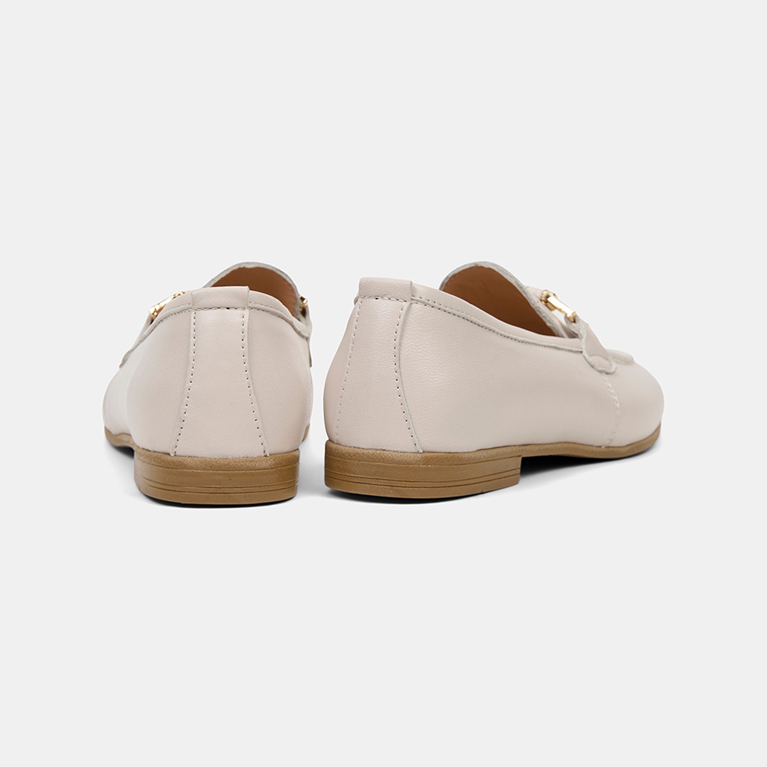 Kadın Bej Metal Gold Toka Aksesuarlı Deri Loafer