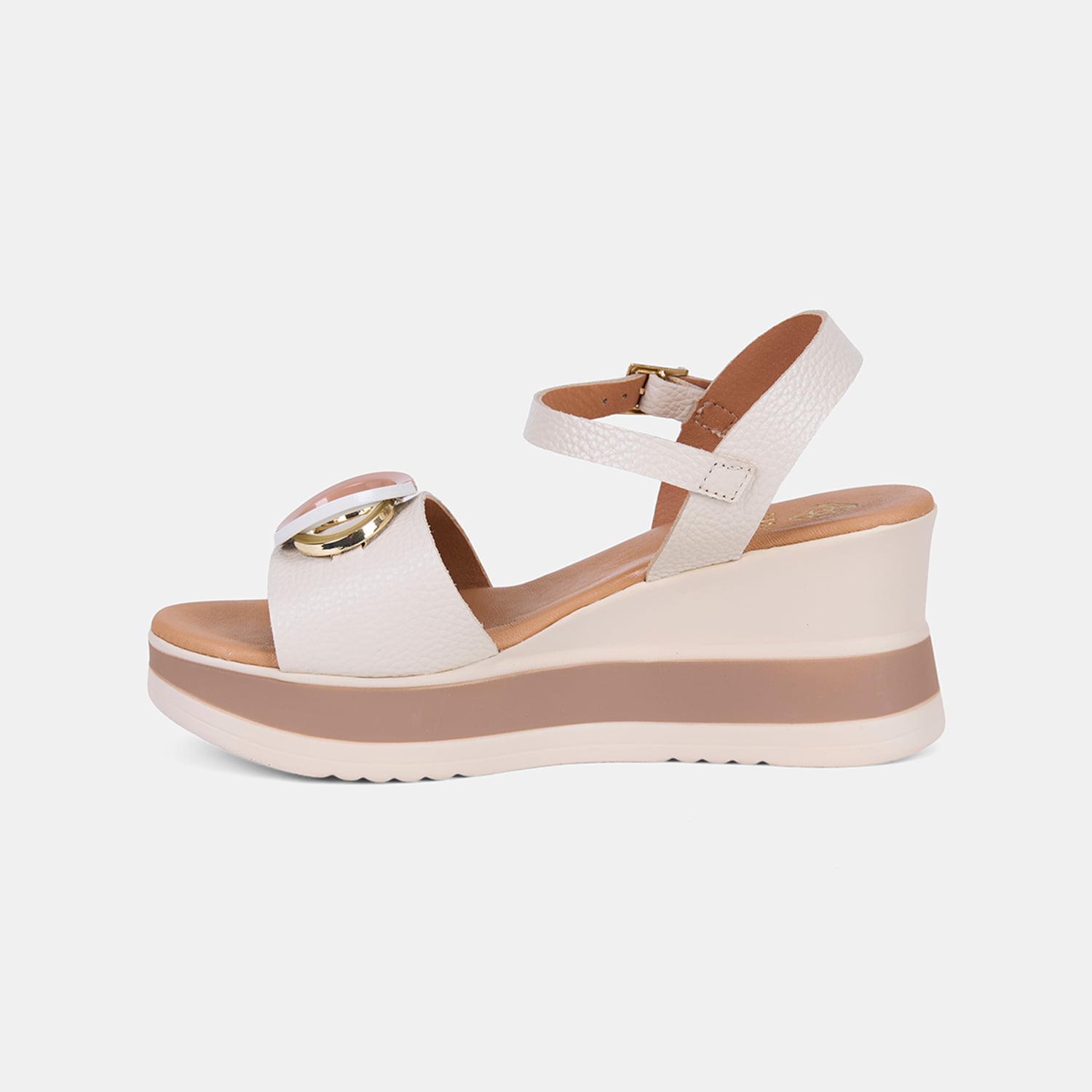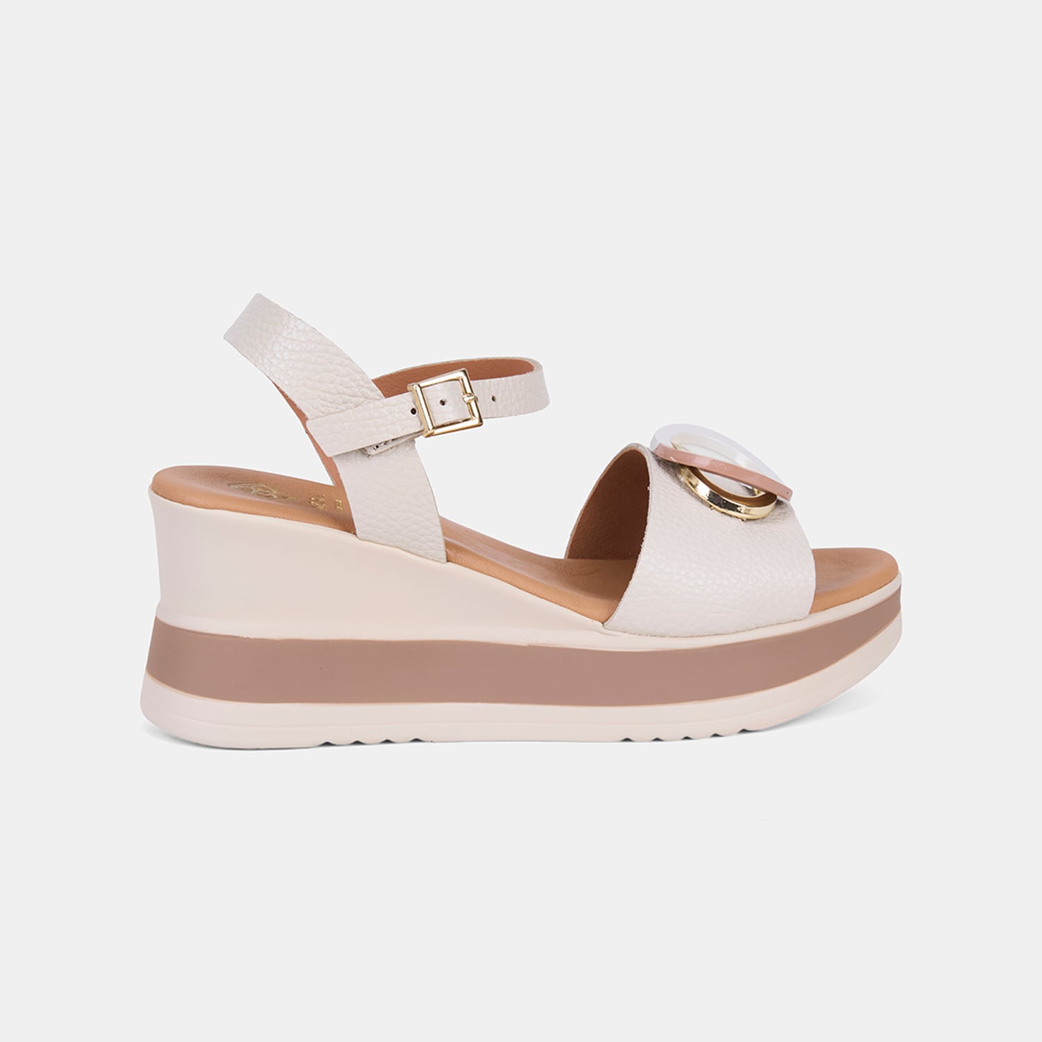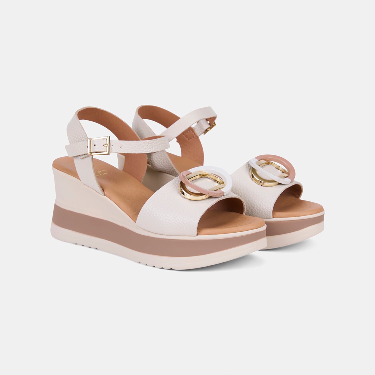 Kadın Bej Metal Halka Aksesuarlı Dolgu Topuklu Deri Sandalet
