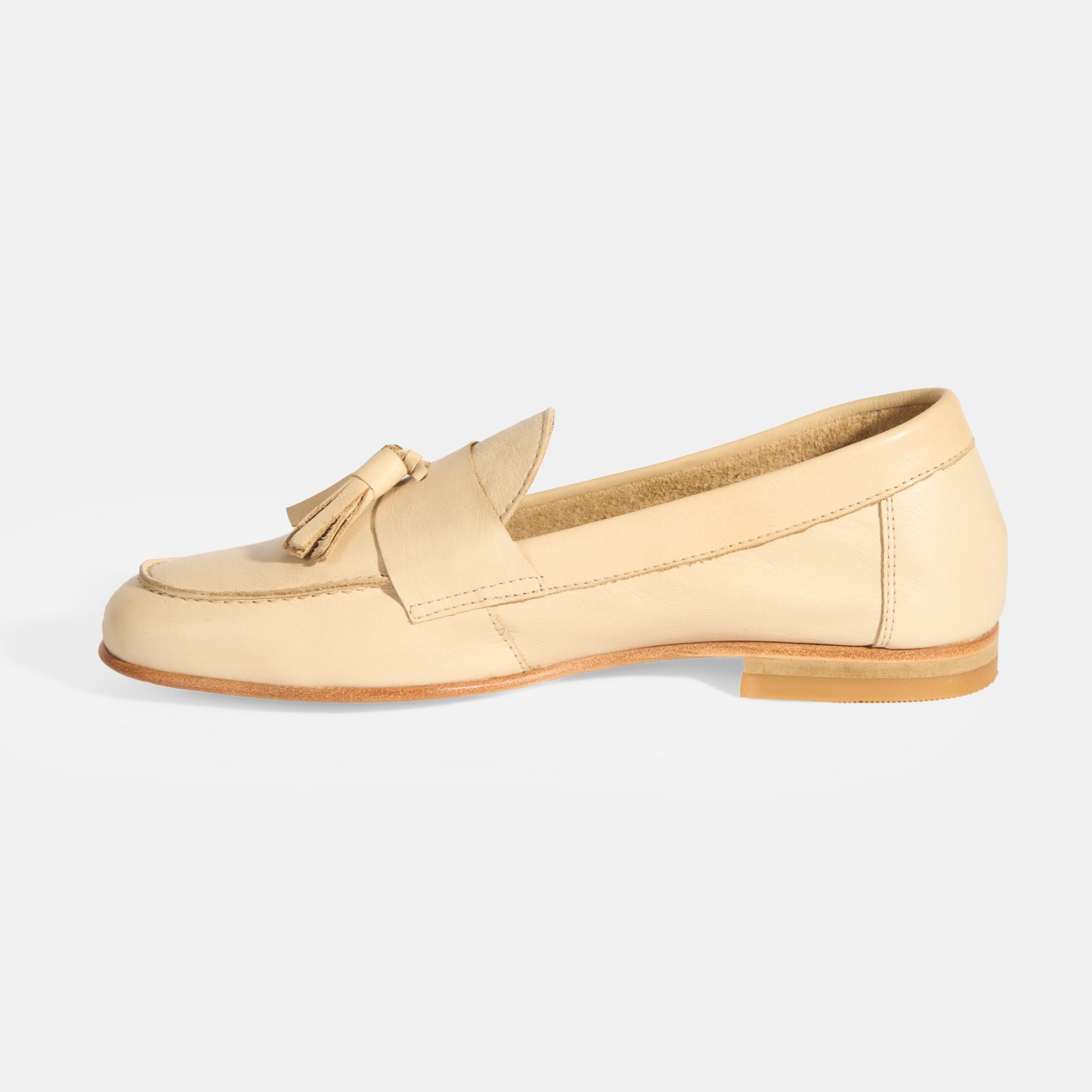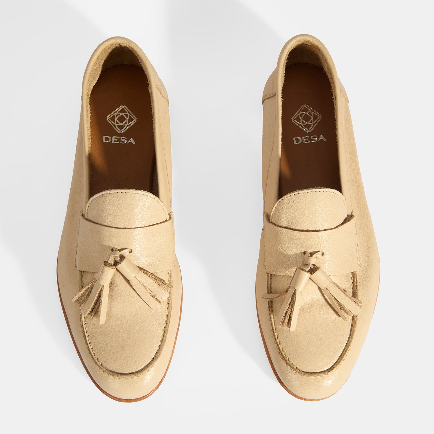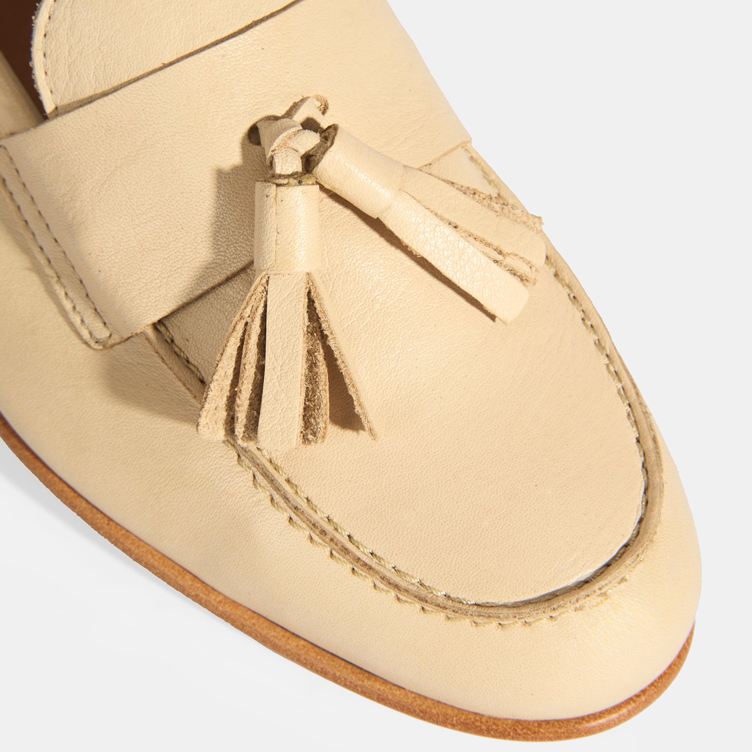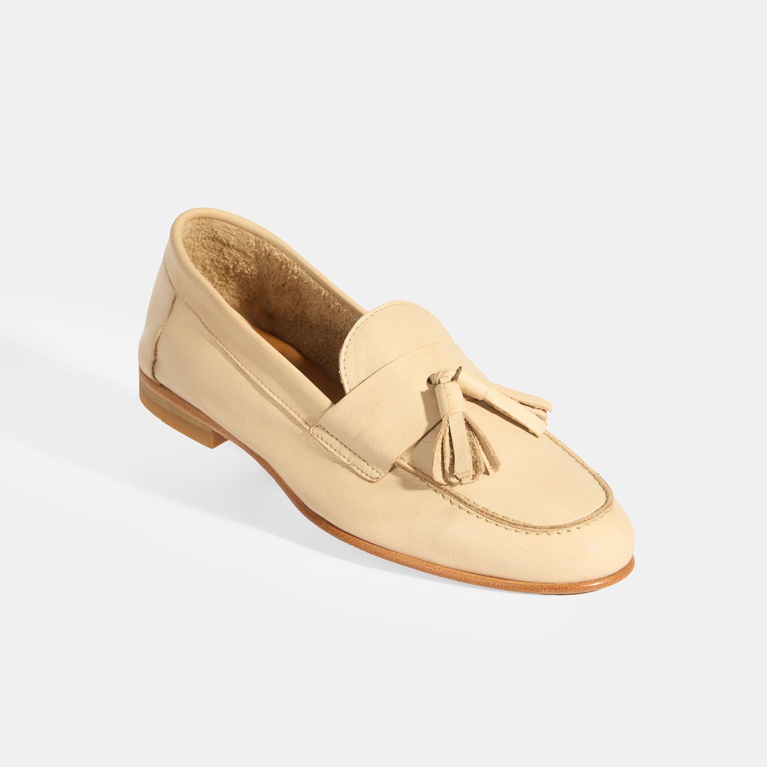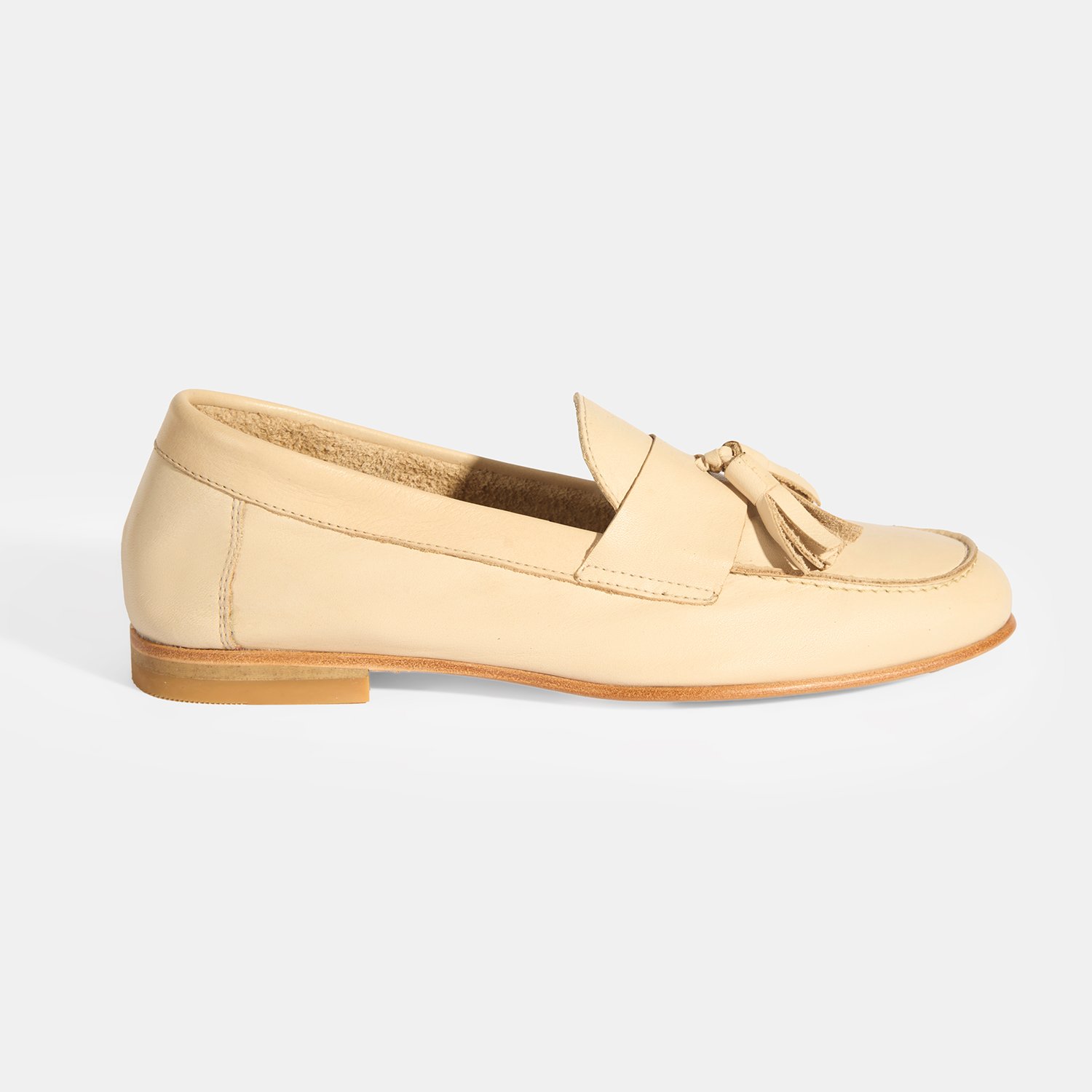 %100 deri, deri iç tabanlı, astarsız, püskül detaylı, kösele tabanlı, kadın loafer.